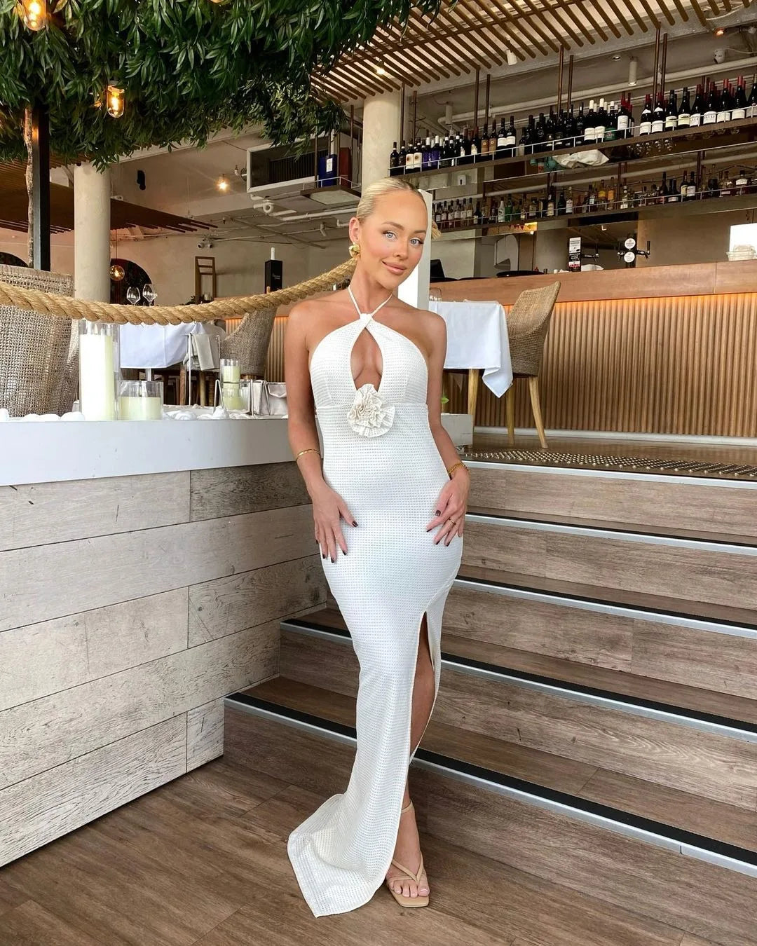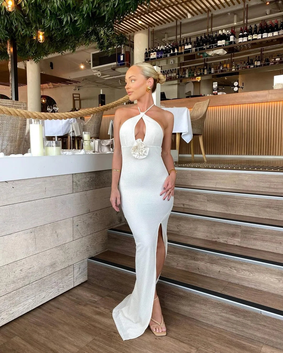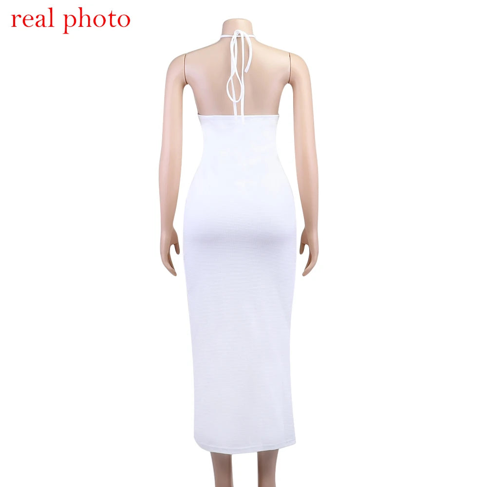 Women's Floral Applique Halter Summer Maxi Cut Out Backless Split Dress