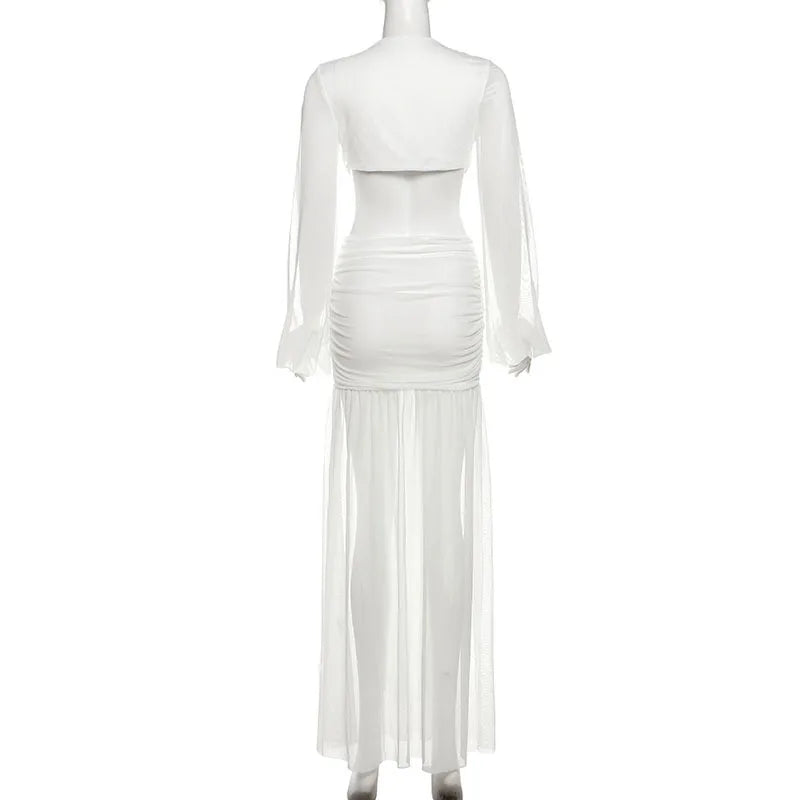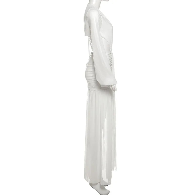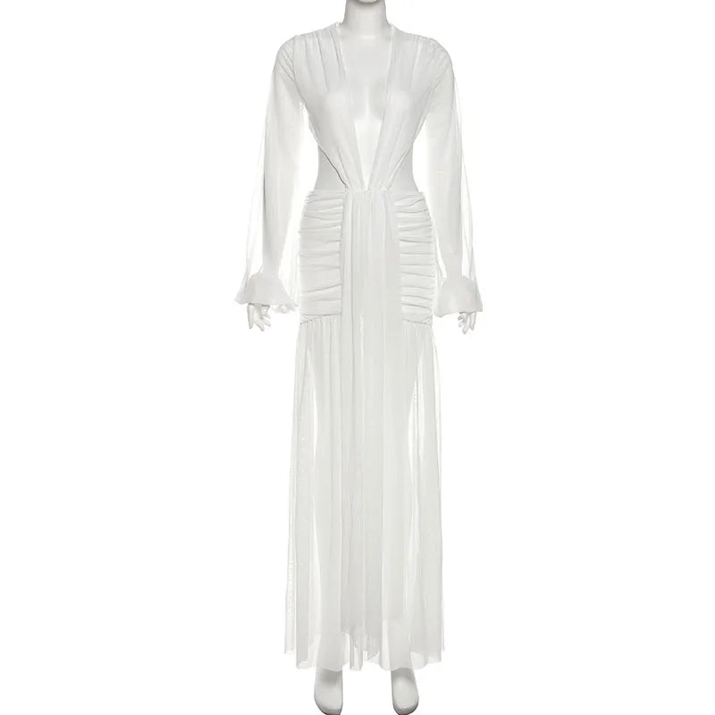 Women's Backless Draped V-Neck Maxi Dress - Ruched Mesh Long Sleeve Gown