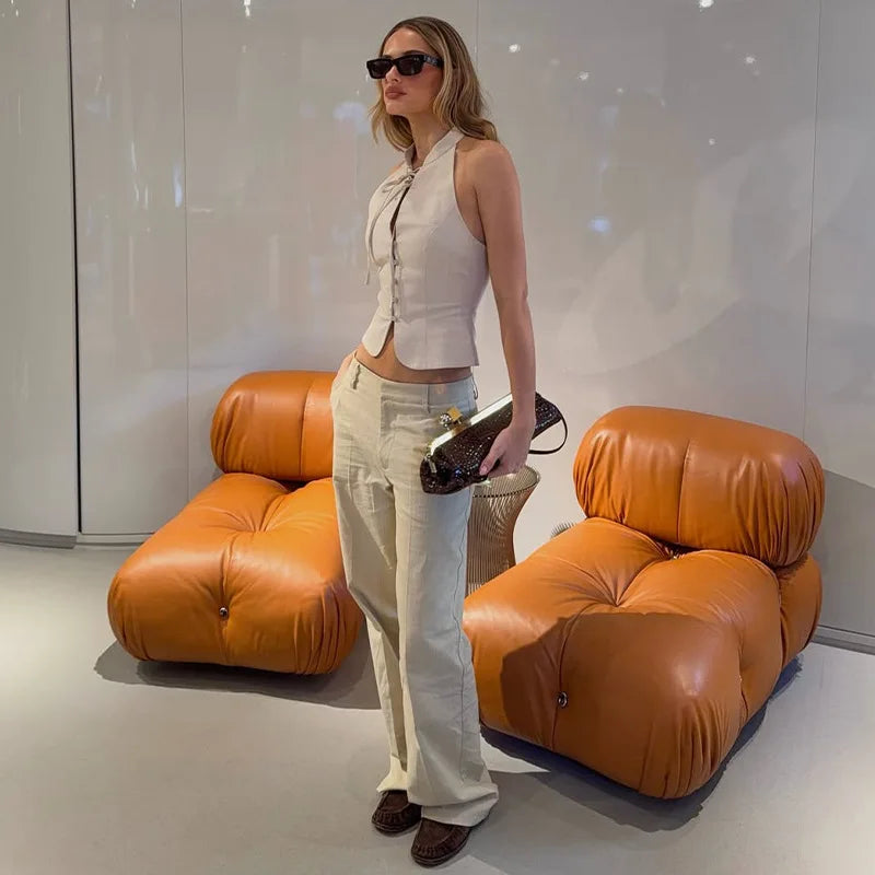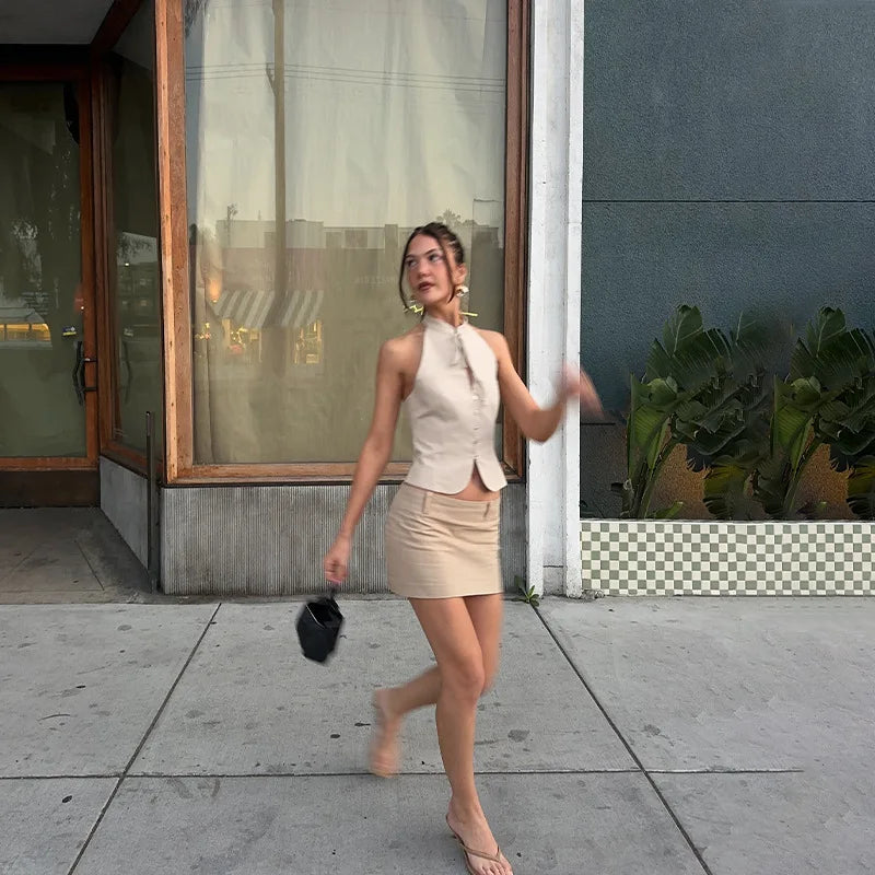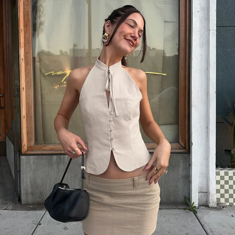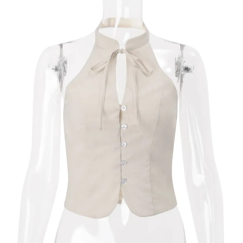 This versatile crop top embodies the Y2K revival trend with its vintage button vest styling and modern cropped silhouette. The tie front adds a feminine touch while the backless design ensures you'll stand out from the crowd.