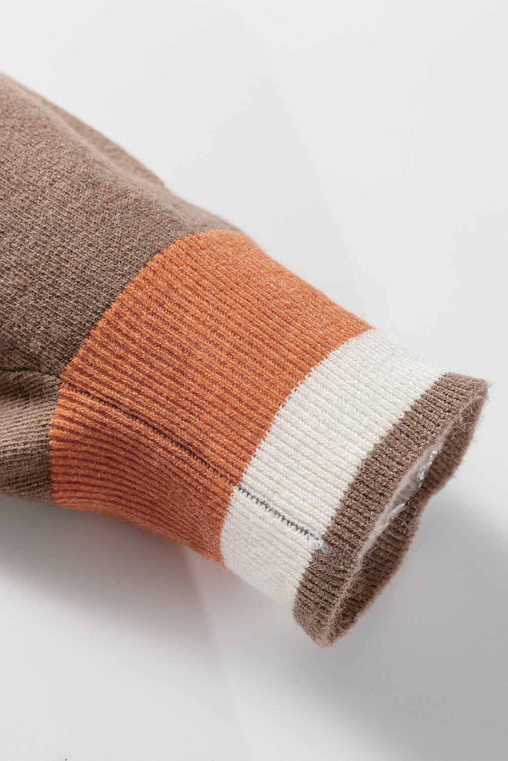 Dark Khaki Contrast Striped Trim V-Neck Varsity Sweater