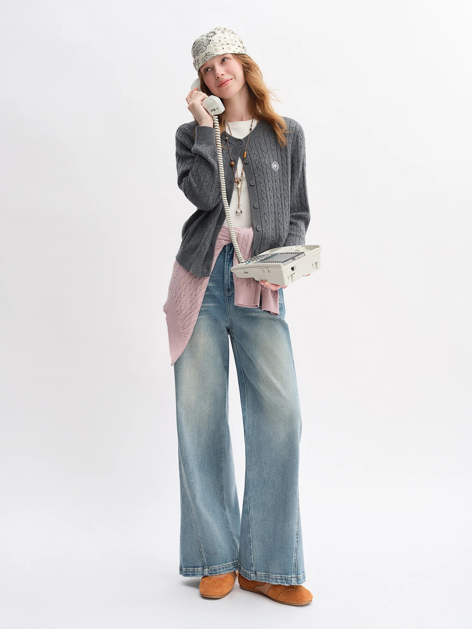 Plus Size Retro Washed Blue Straight Jeans - High Waist Wide Leg Design