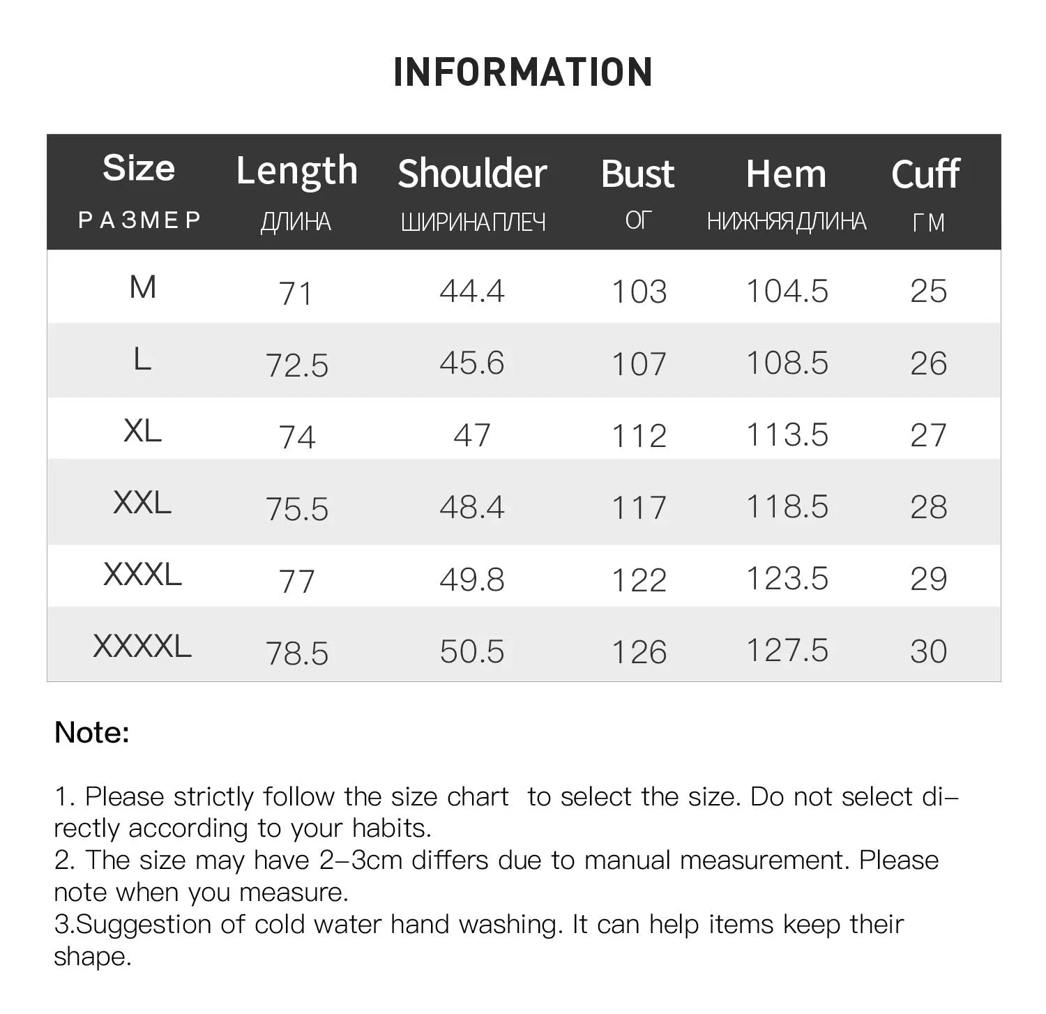 | Size | UK Size | Bust (cm) | Shoulder (cm) | Length (cm) | Sleeve (cm) |