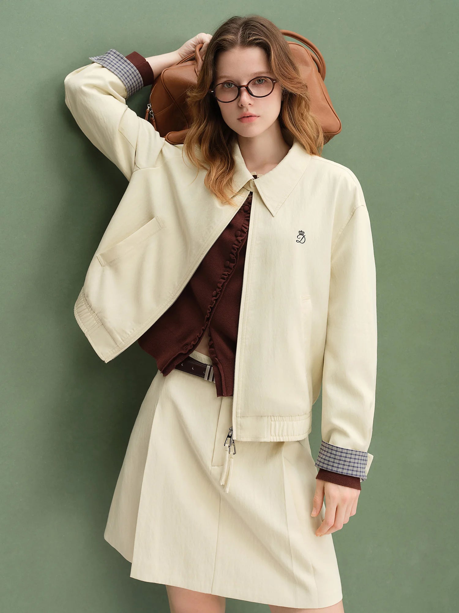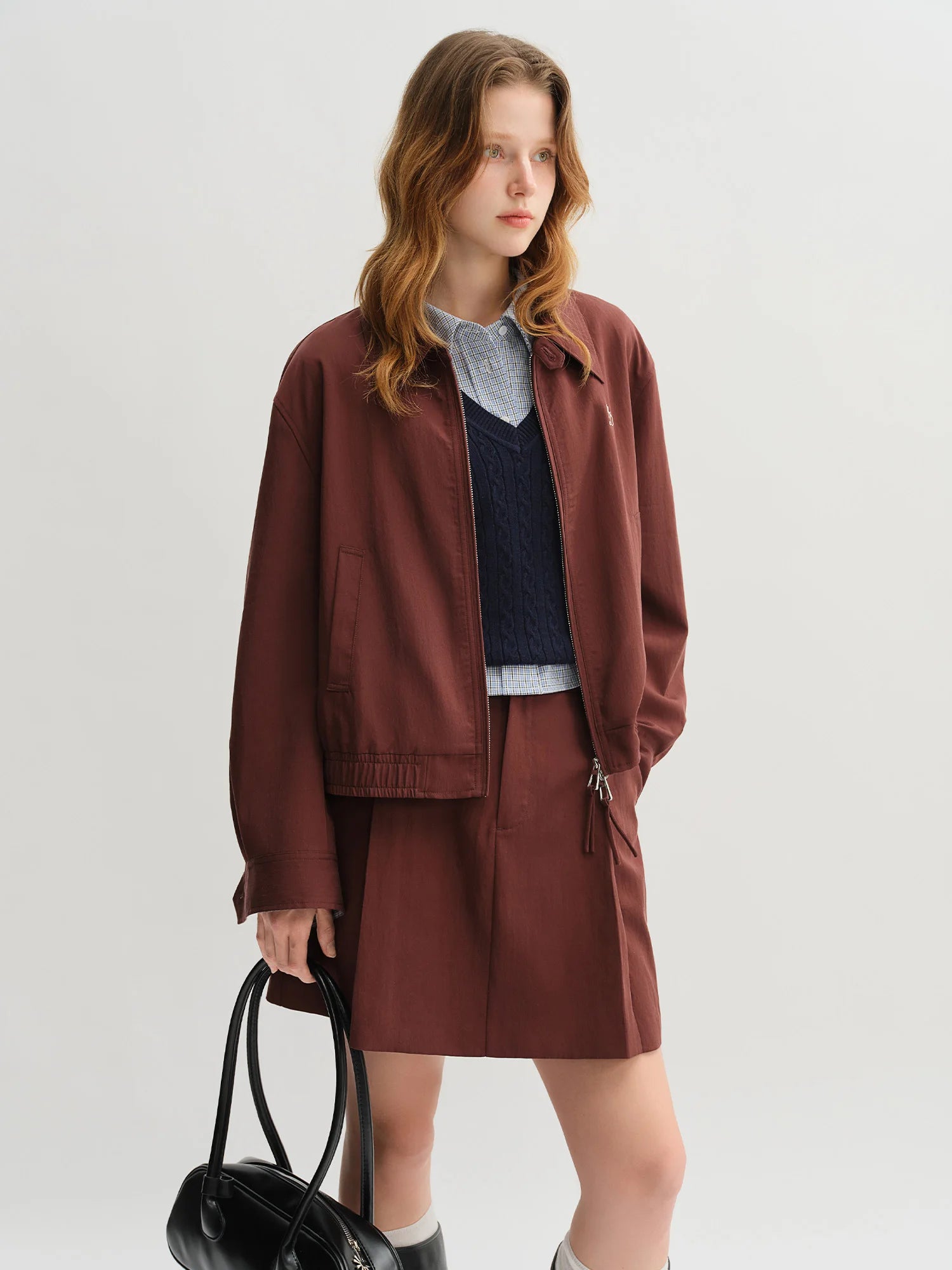 Step out in confidence with this stylish coordinated set that combines timeless plaid patterns with contemporary patchwork design for the perfect autumn ensemble.