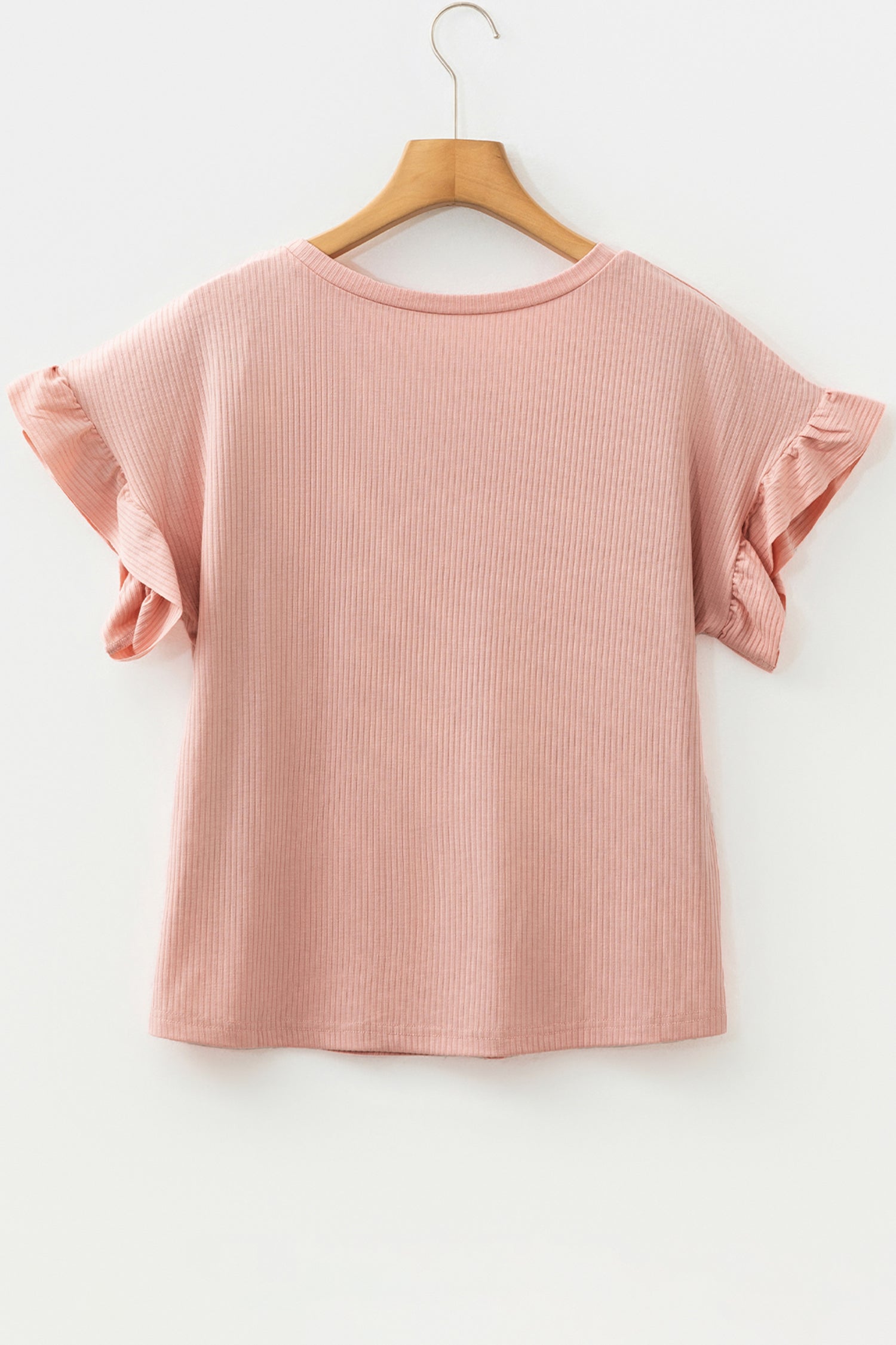 Add a touch of feminine charm to your casual wardrobe with this solid color ribbed t-shirt featuring delicate ruffled short sleeves. The soft dusty pink hue and textured ribbed fabric create a versatile piece that effortlessly elevates your everyday style.