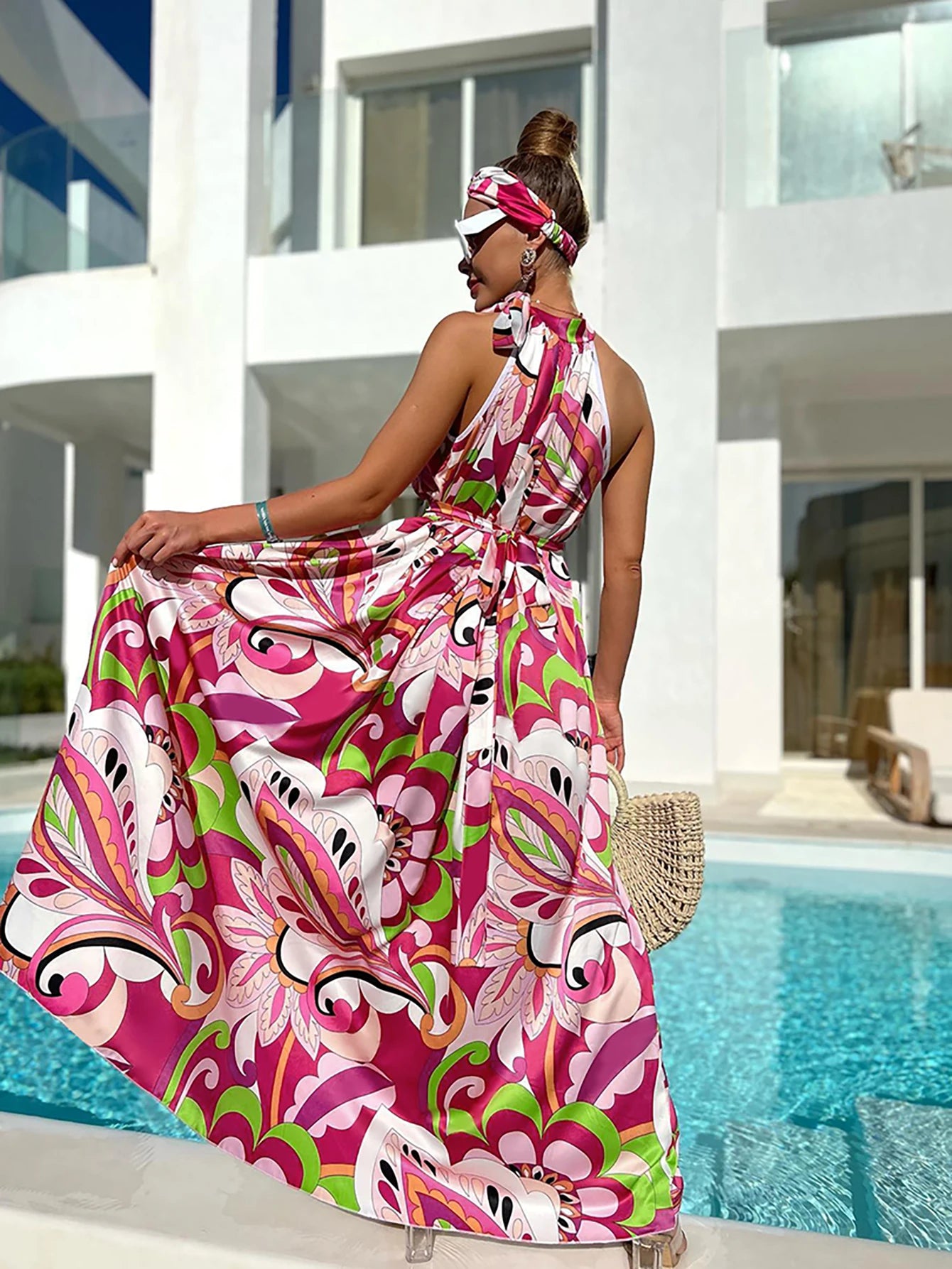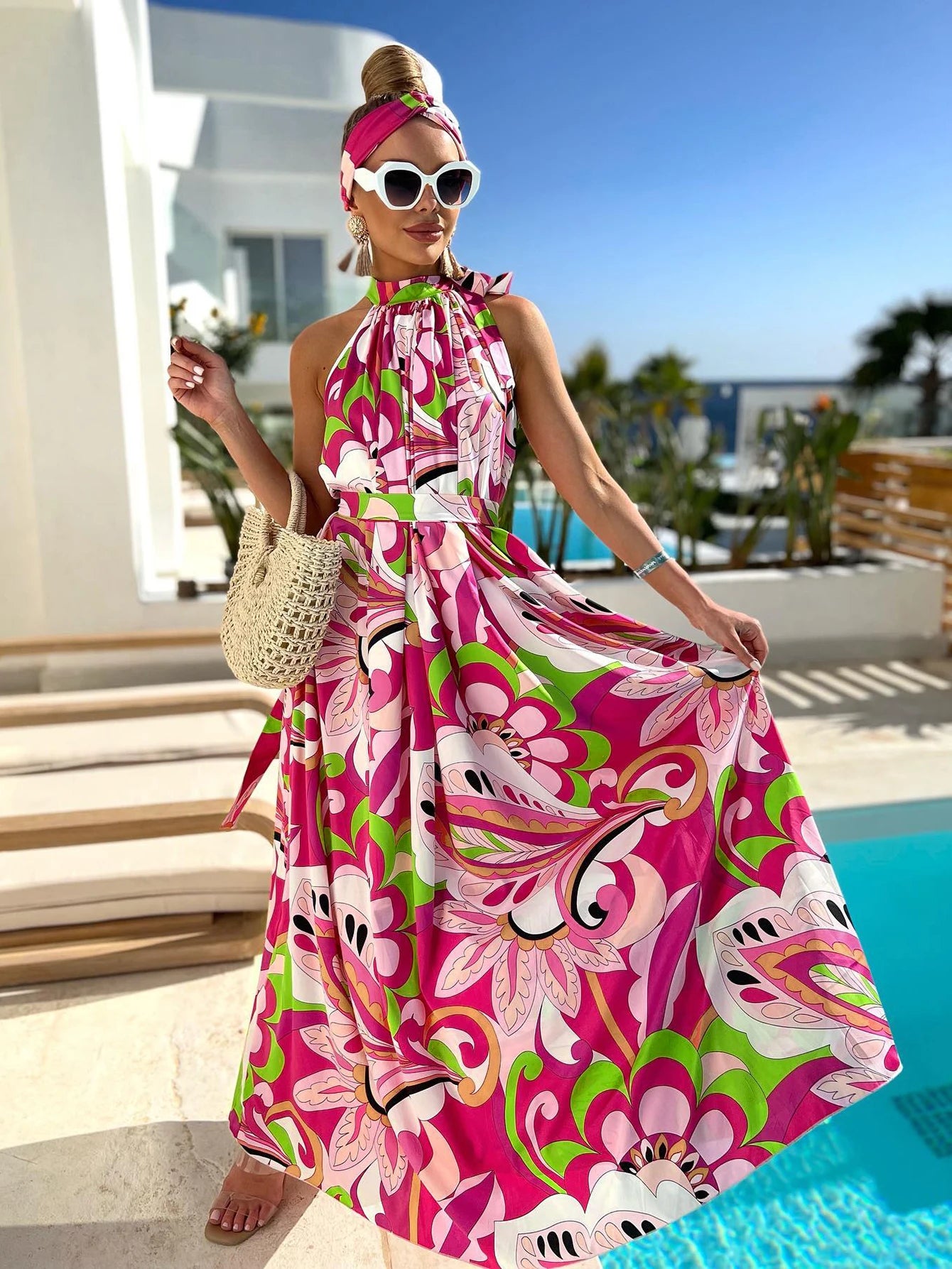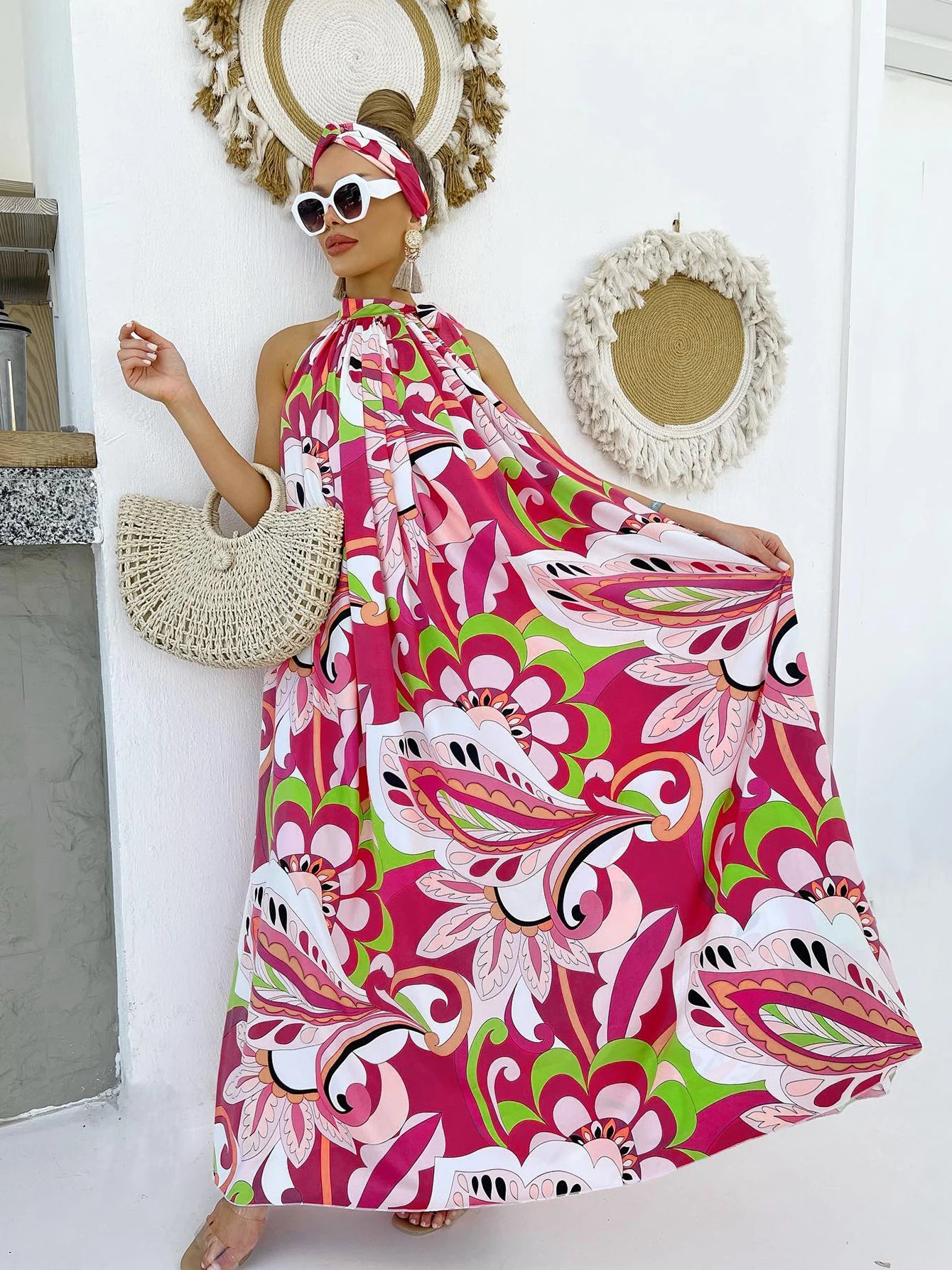 Women's Elegant Floral Printed Long Halter Beach Dress Loose Summer Bikini Cover Up