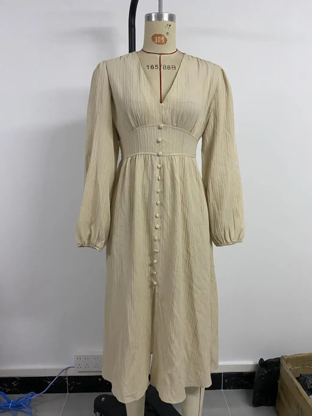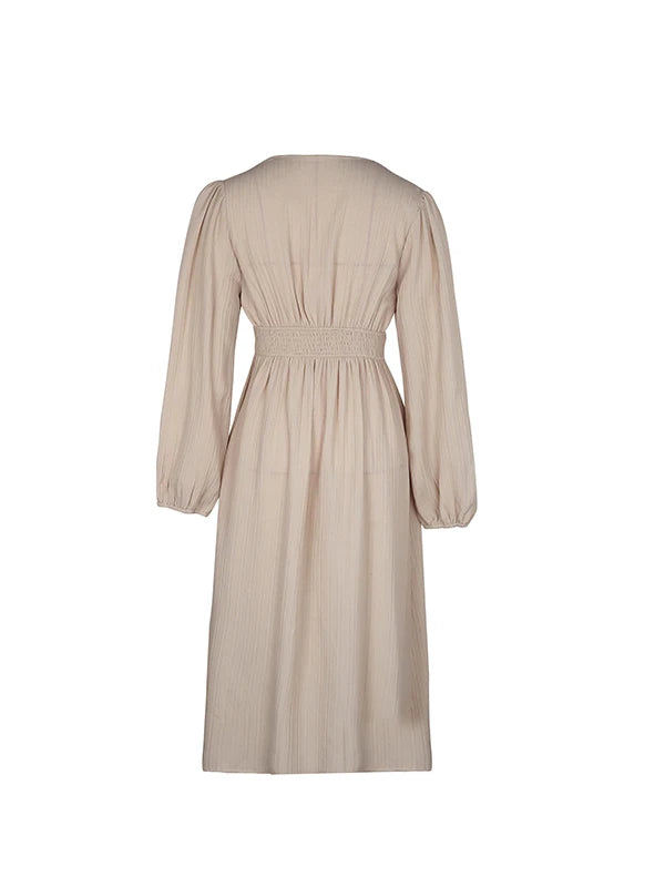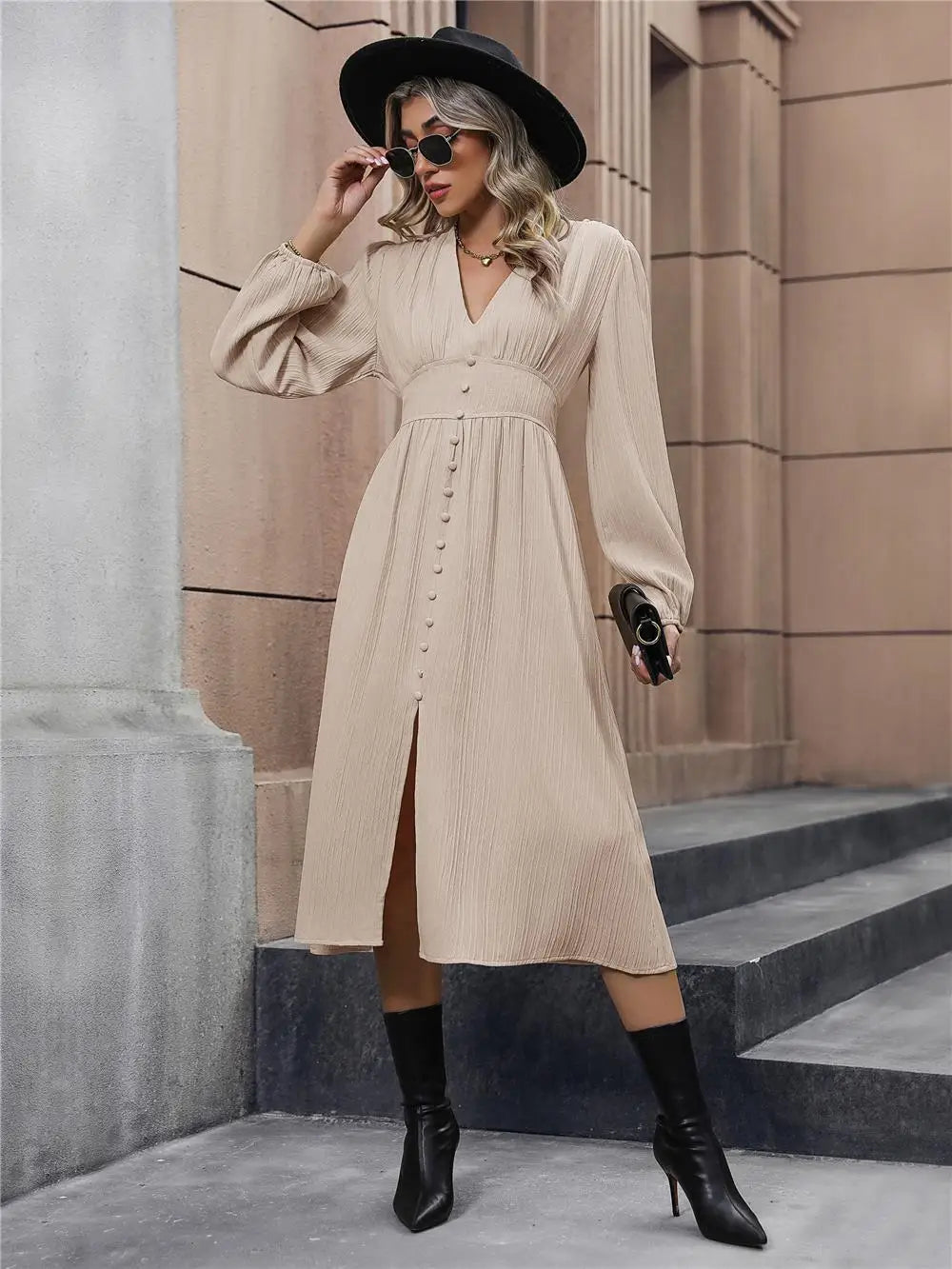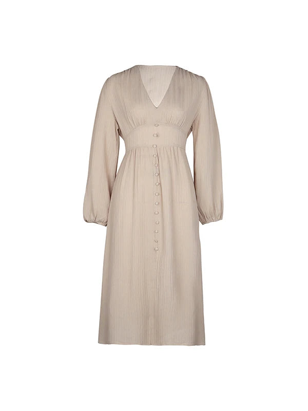 Women's Autumn Winter Long Sleeve Elegant V-neck Chiffon A-Line Knee Length High Waist Dress