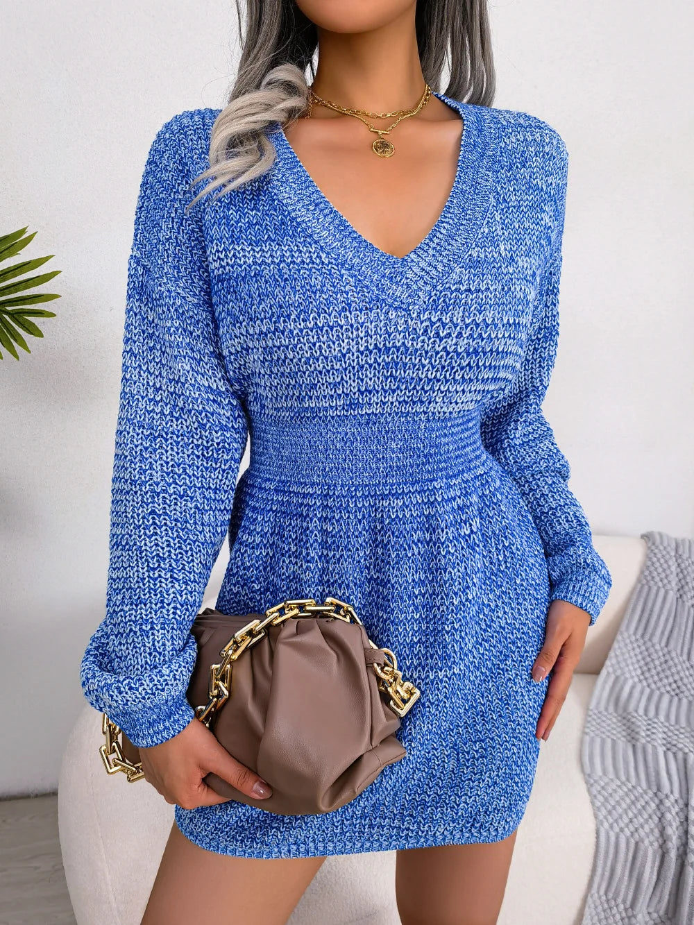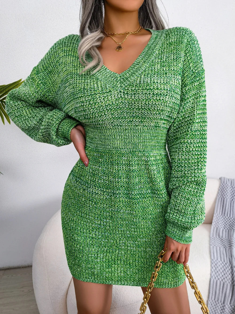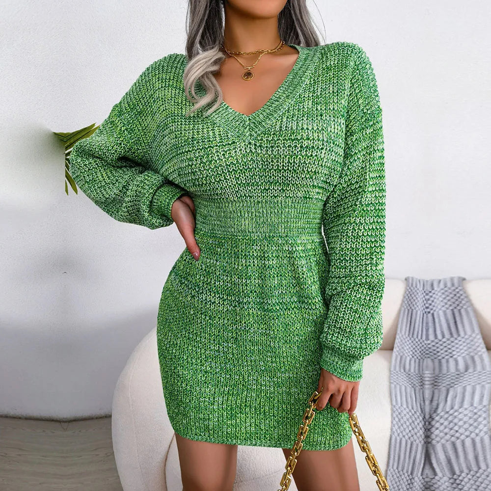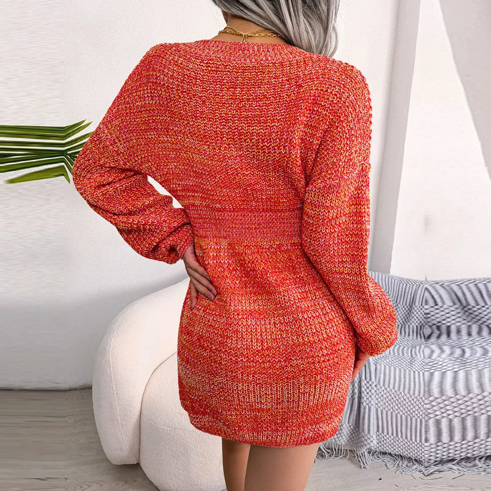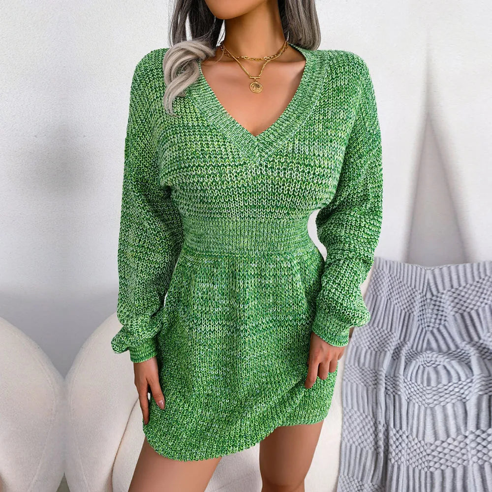 Women's Autumn Winter V Neck Lantern Sleeve Nipped High Waist Sweater Chic Knitted Dress