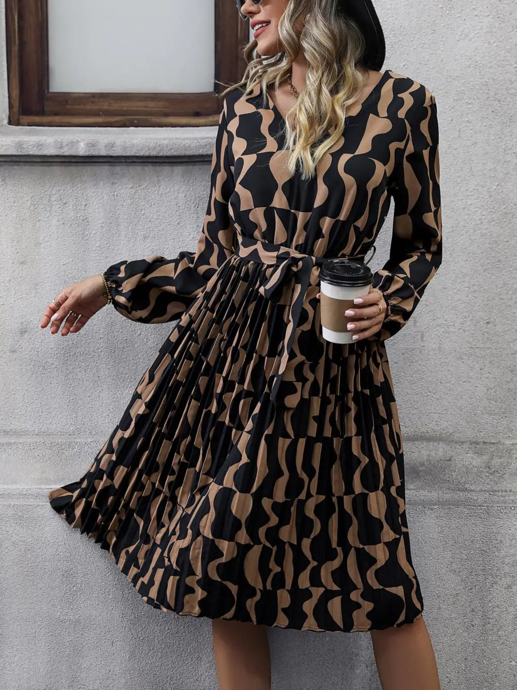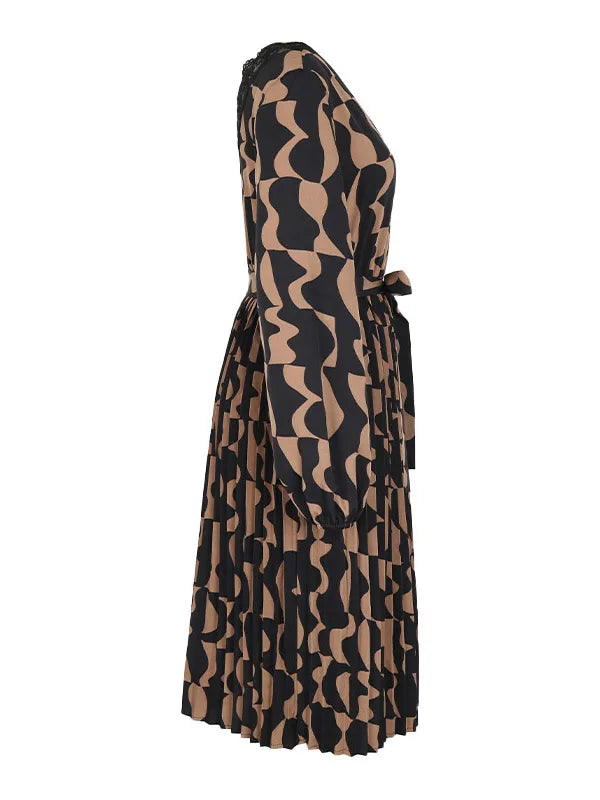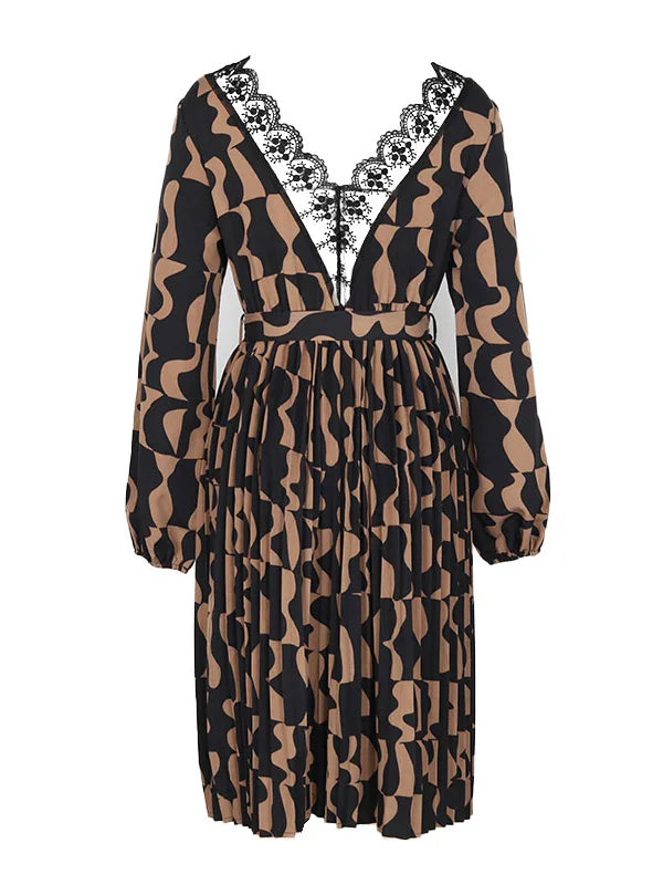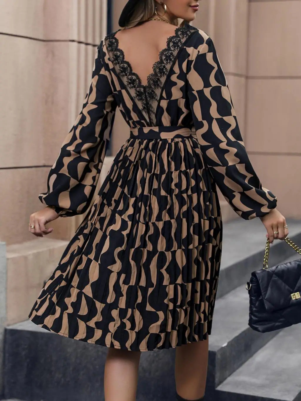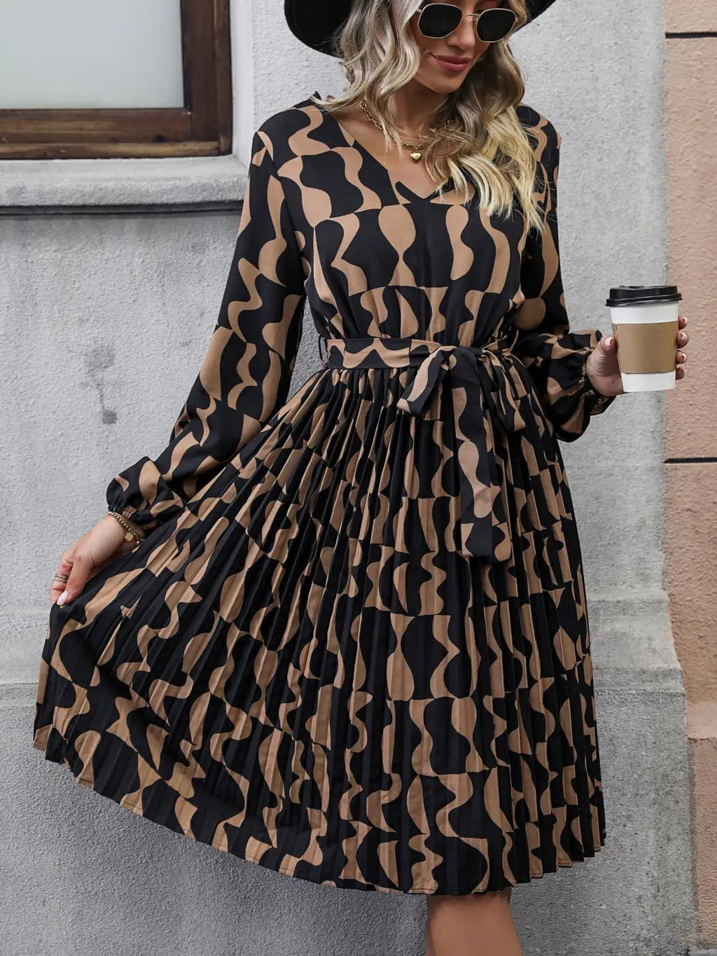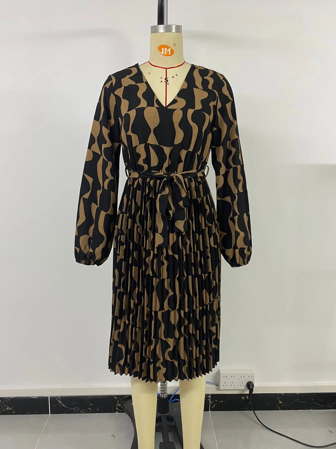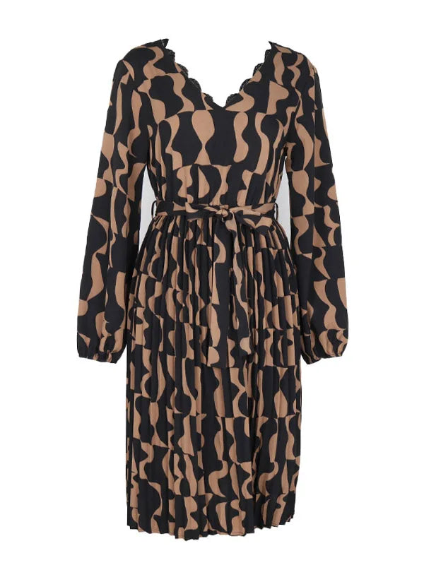Women's Autumn Winter Long Sleeve Print Elegant V-neck Casual A-Line Knee-Length High Waist Dress