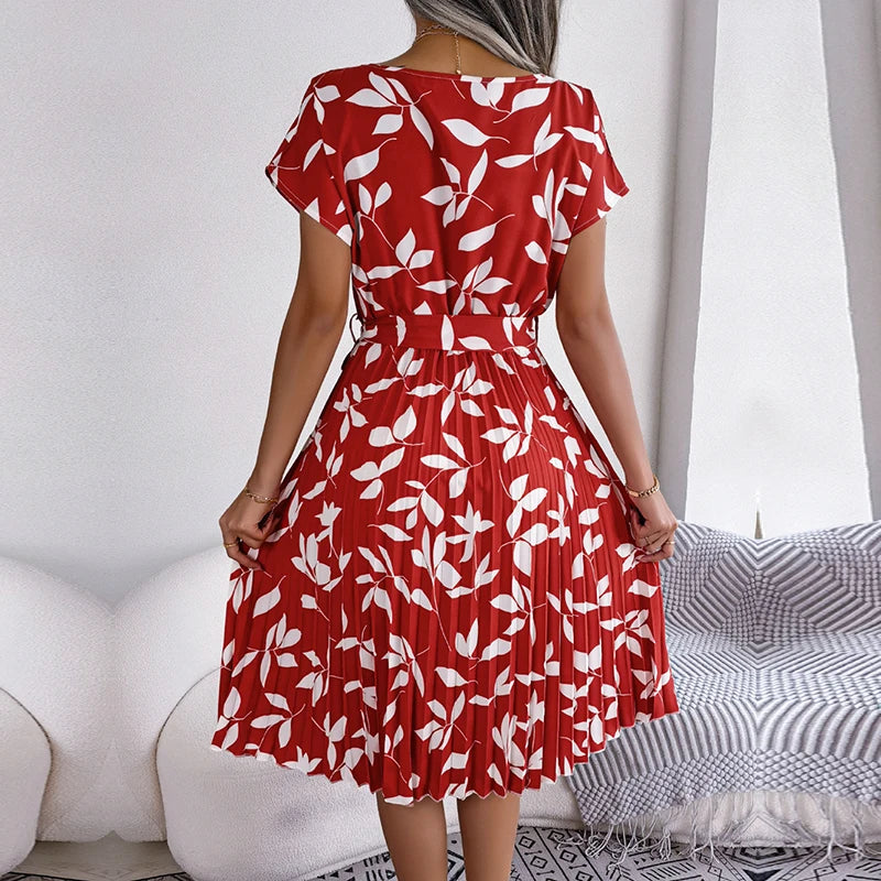 Women's Floral Pleated A Line Long Spring Summer Short Sleeve High Waist Chic Dress