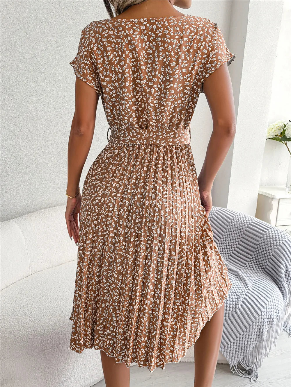 Women's Floral Pleated A Line Long Spring Summer Short Sleeve High Waist Chic Dress