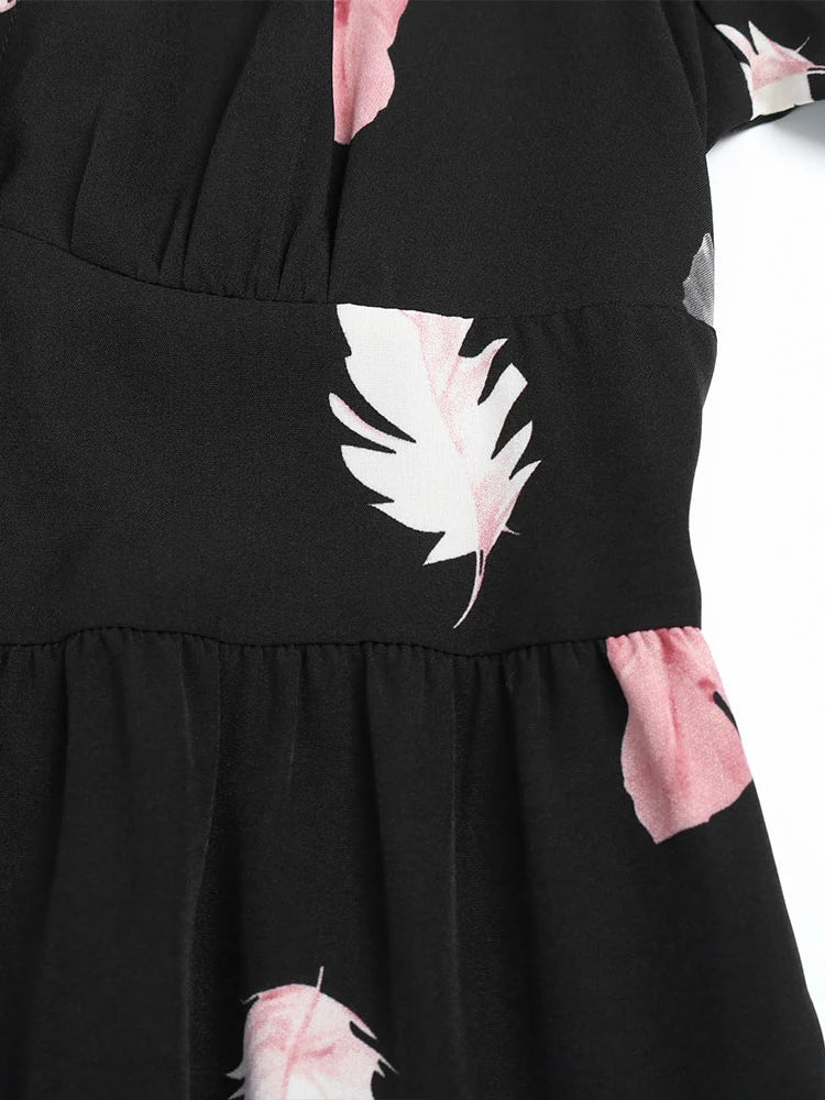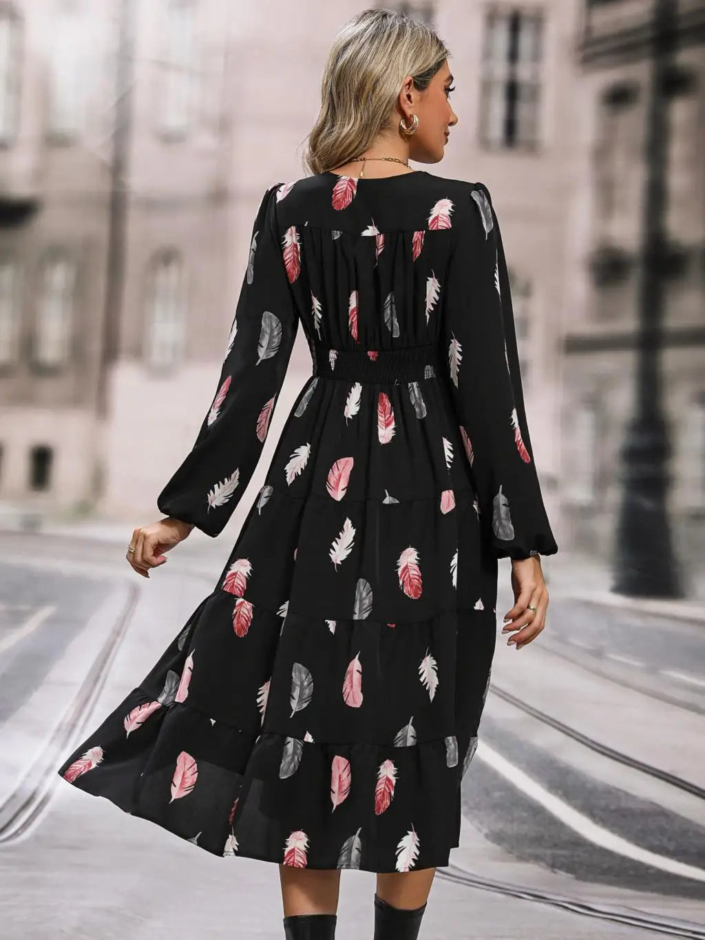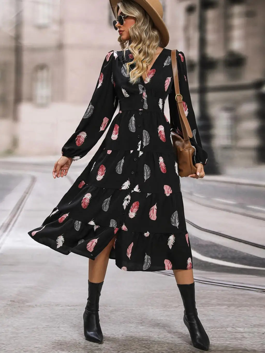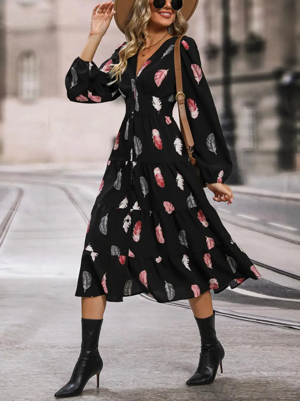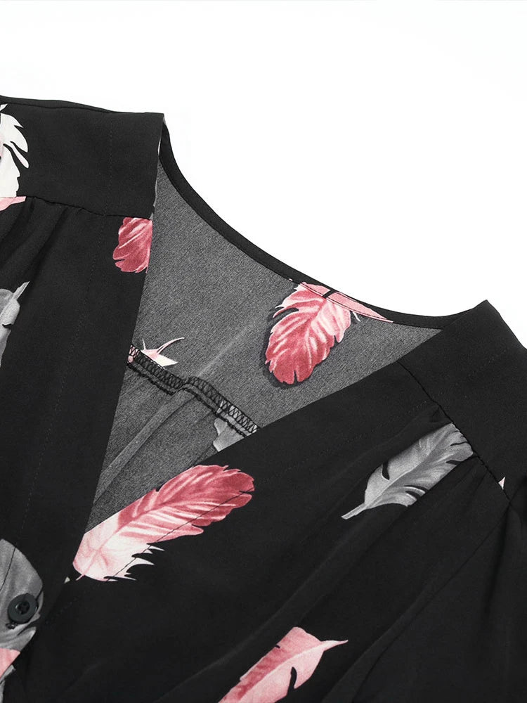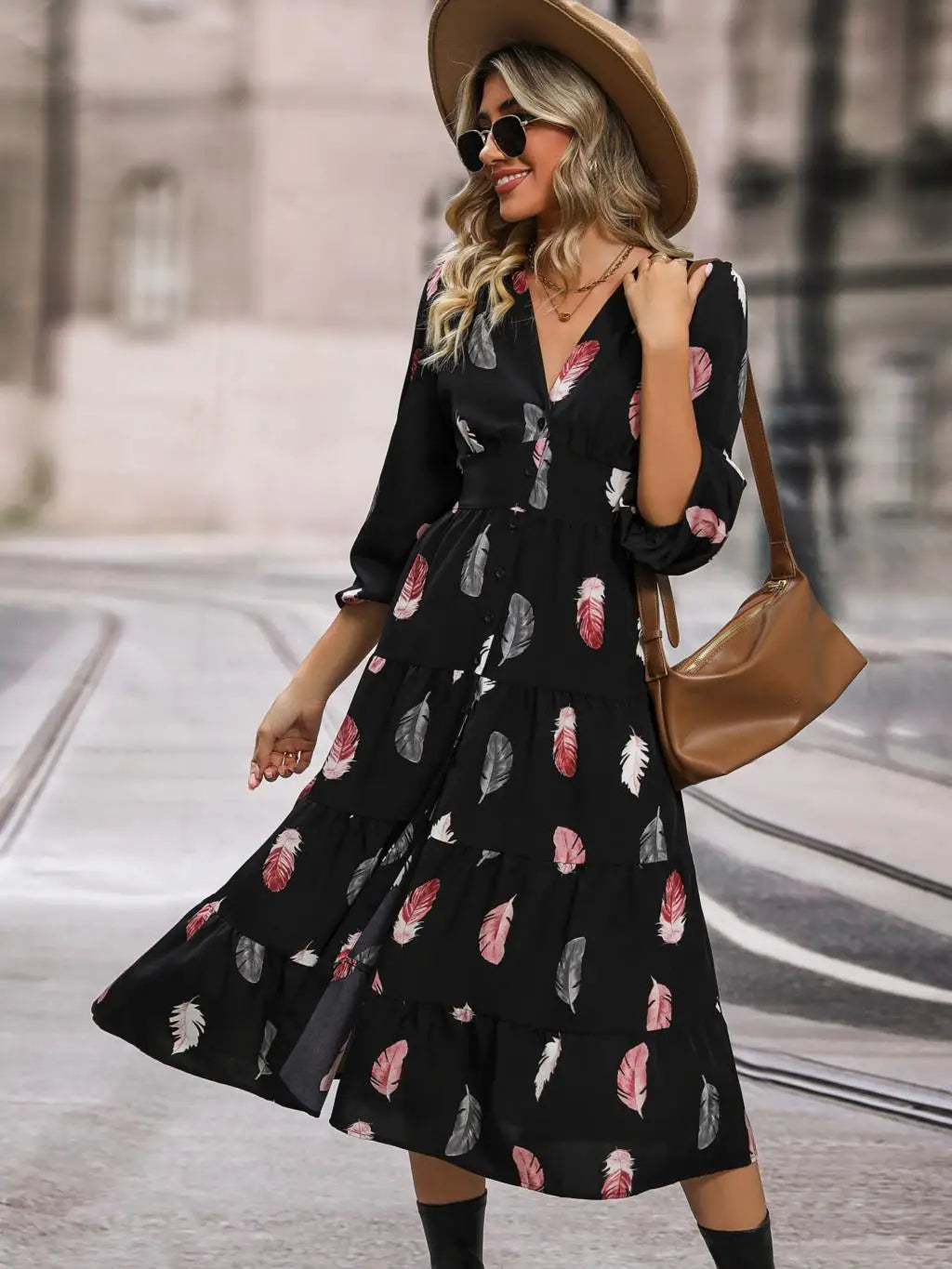 Women's Autumn Winter Casual Print Single Breasted Short Sleeve V Neck High Waist Dress