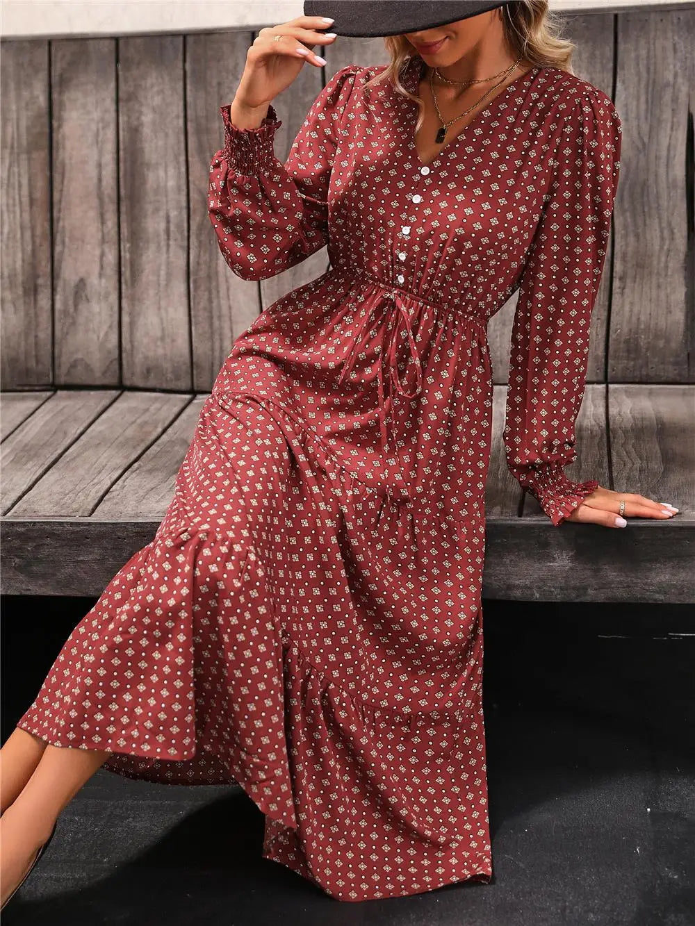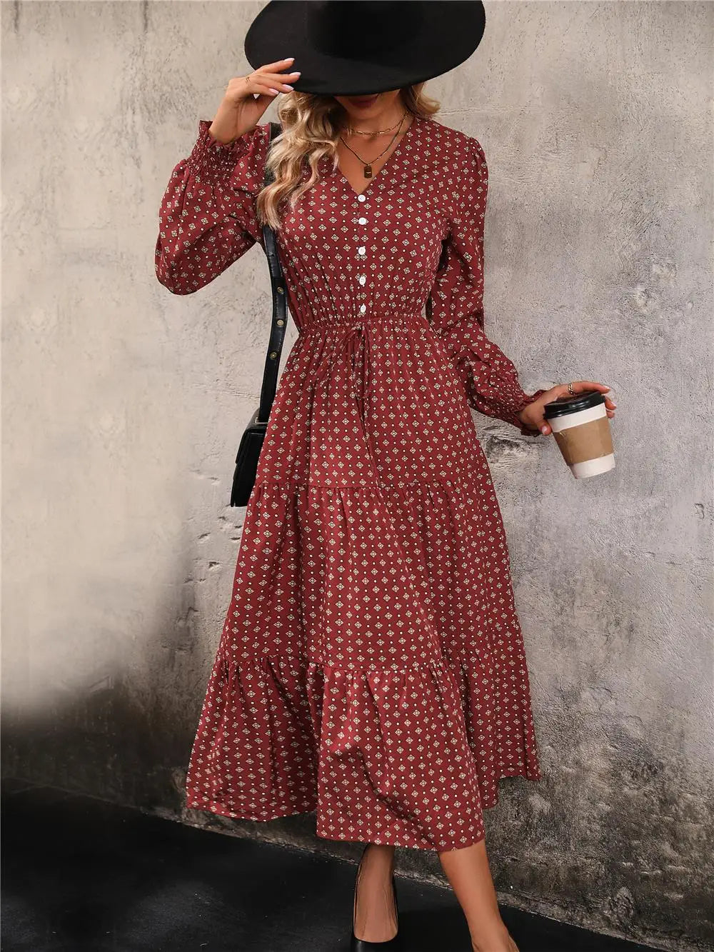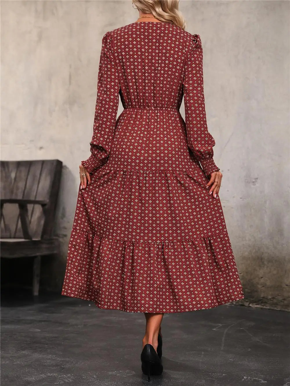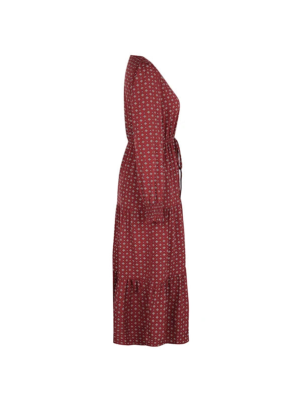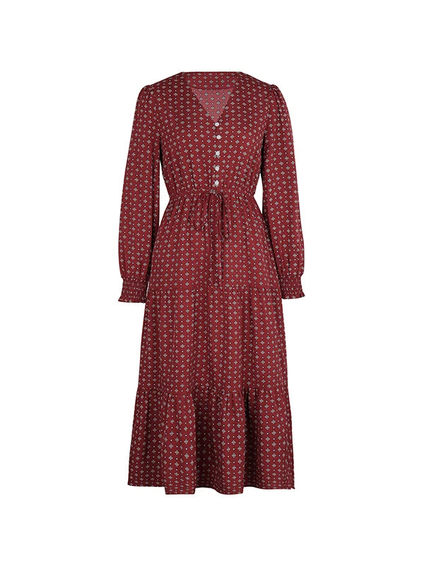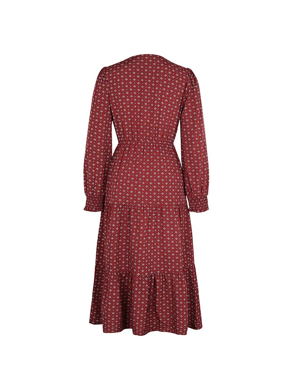 Women's Autumn Winter Long Sleeve Print V-neck Chiffon A-Line Knee Length High Waist Dress