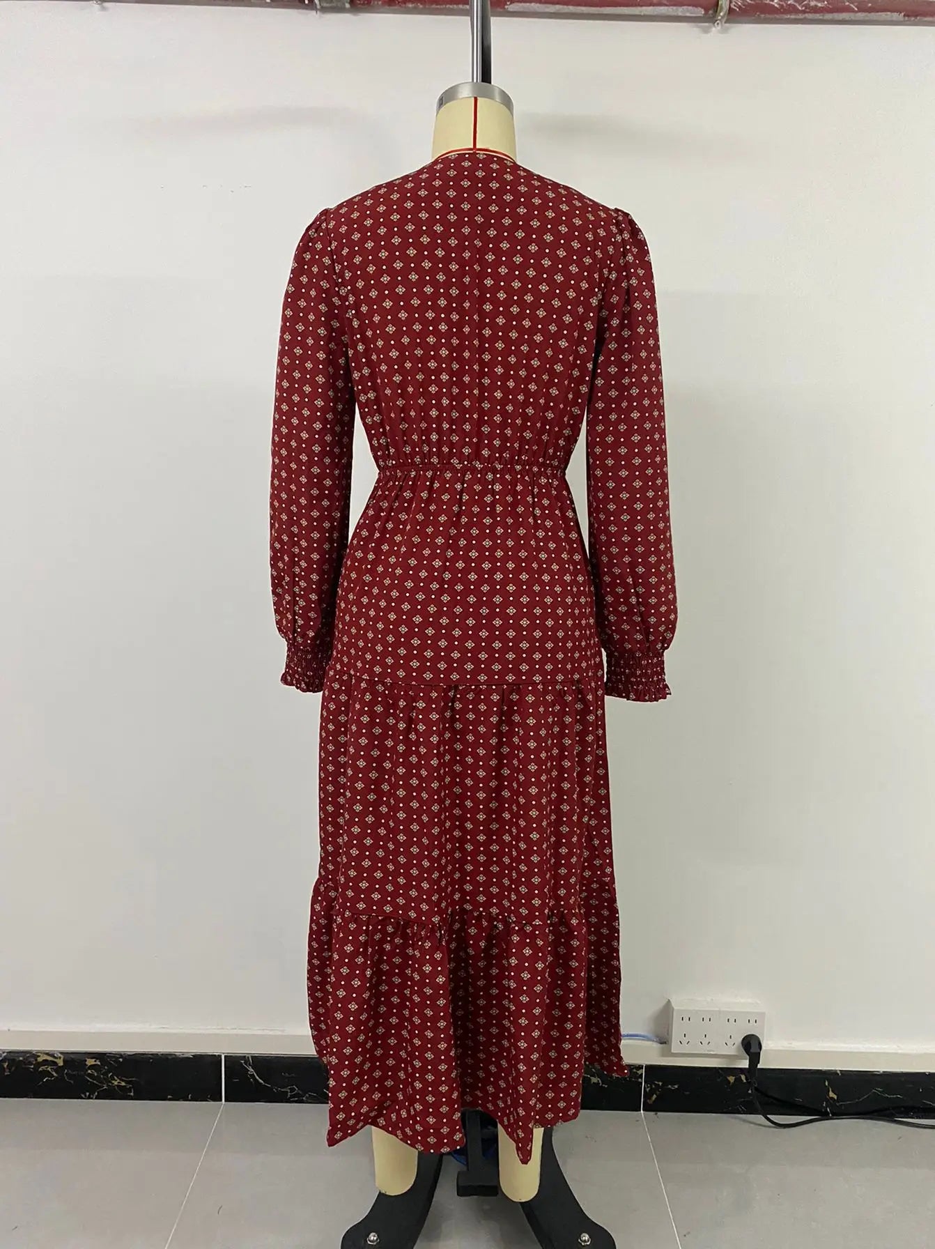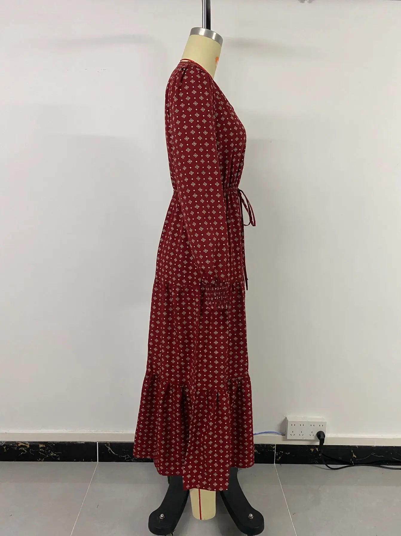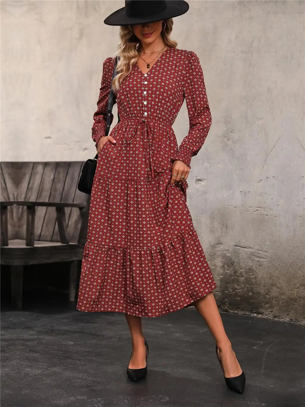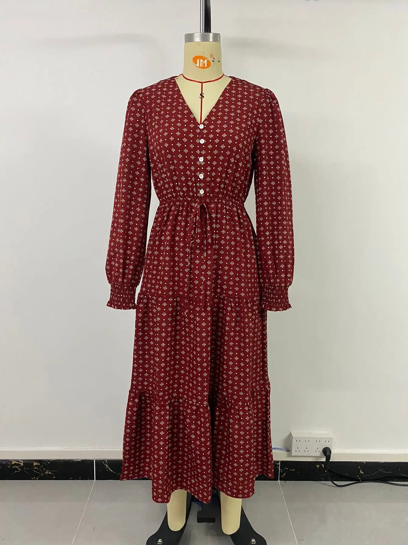 Women's Autumn Winter Long Sleeve Print V-neck Chiffon A-Line Knee Length High Waist Dress