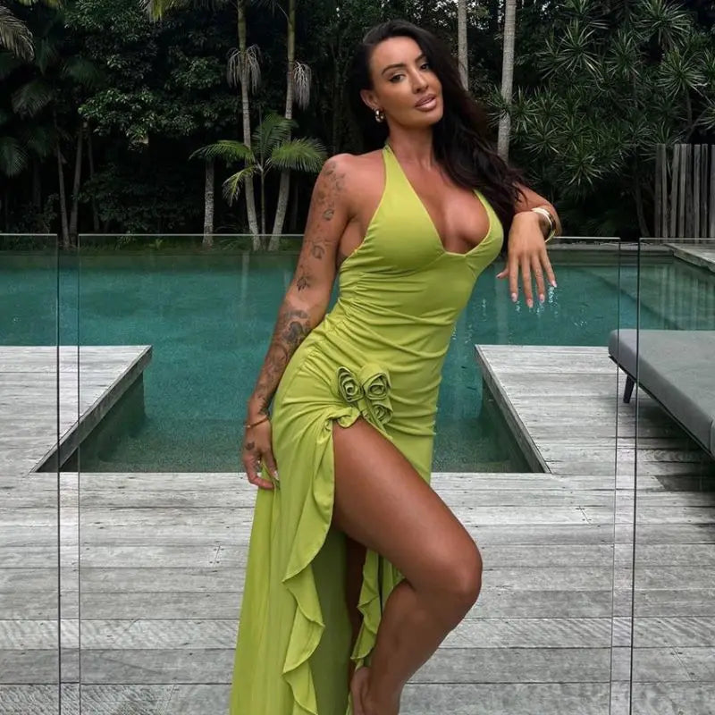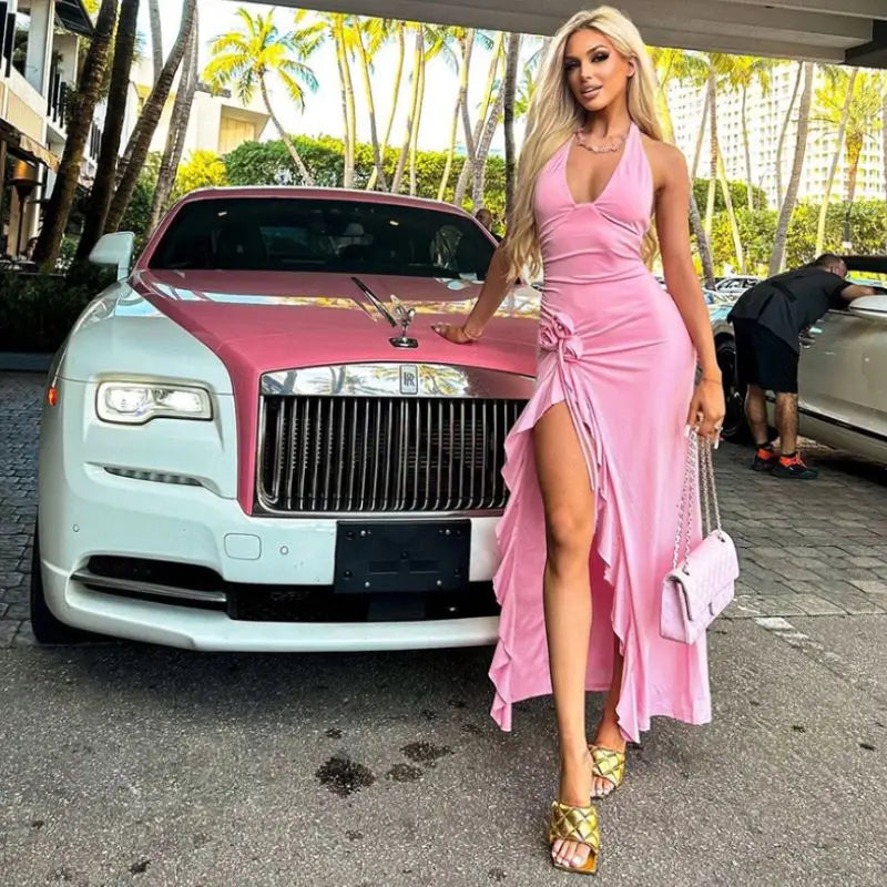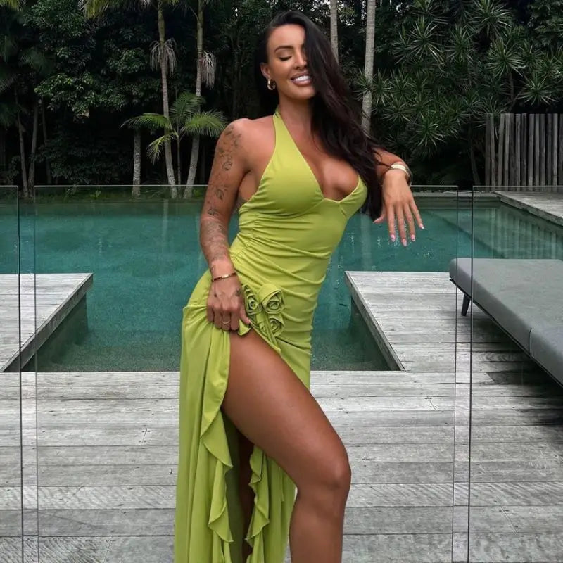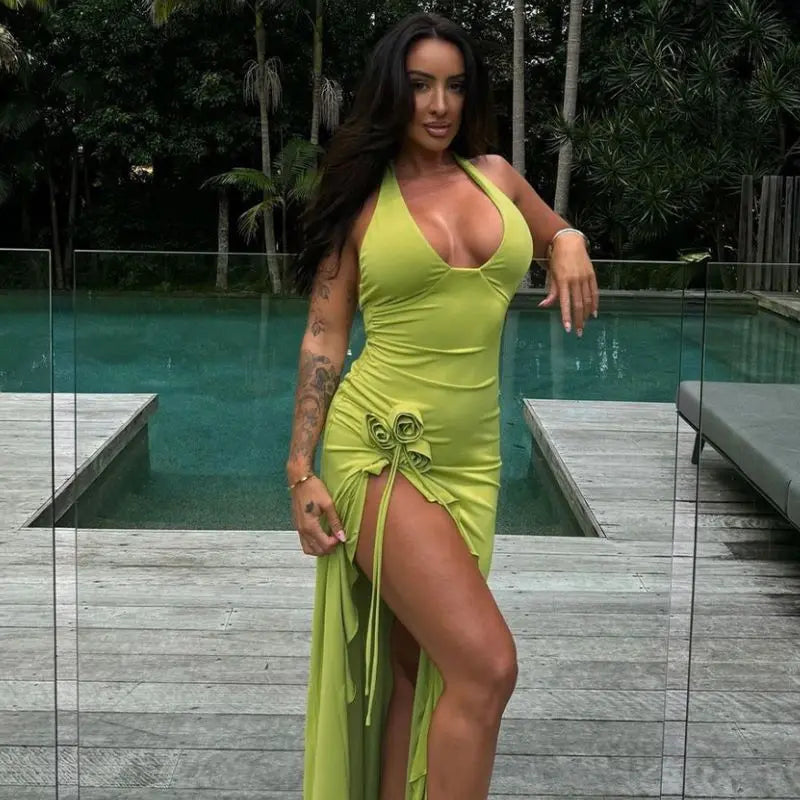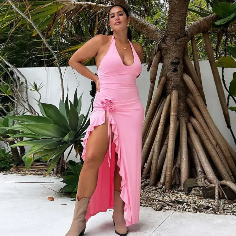 Floral Applique Halter Maxi Dress - Women Split Long Dress