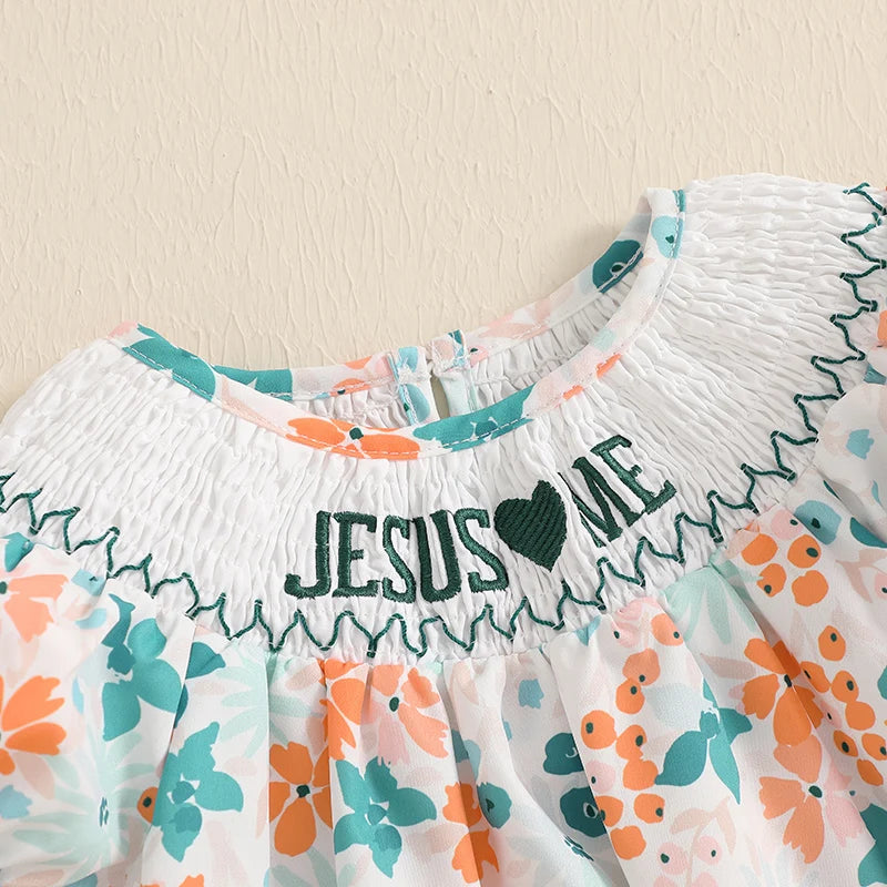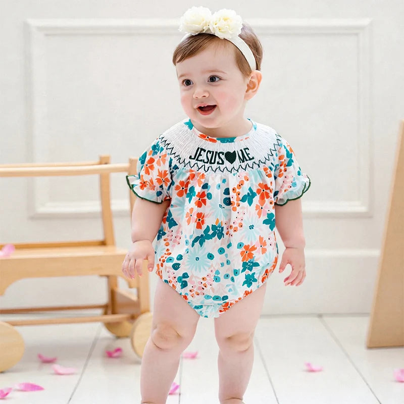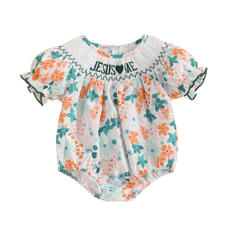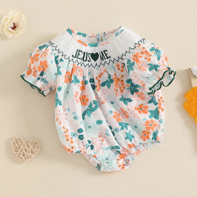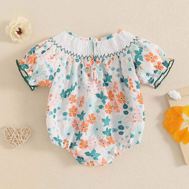 Baby Girls Floral Letter Embroidery Romper - Smocked Short Sleeve Playsuit (0-12M)