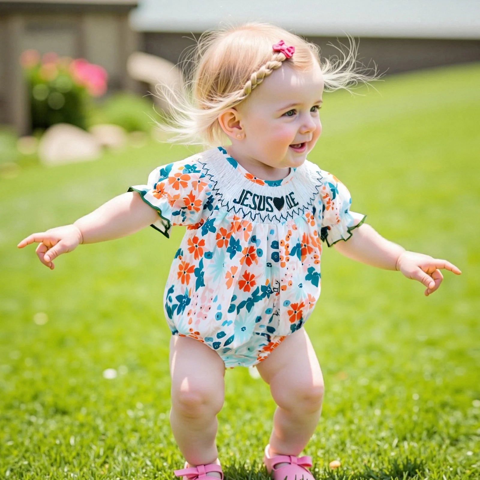 Create beautiful memories with this lovely floral romper that combines traditional craftsmanship with modern comfort!