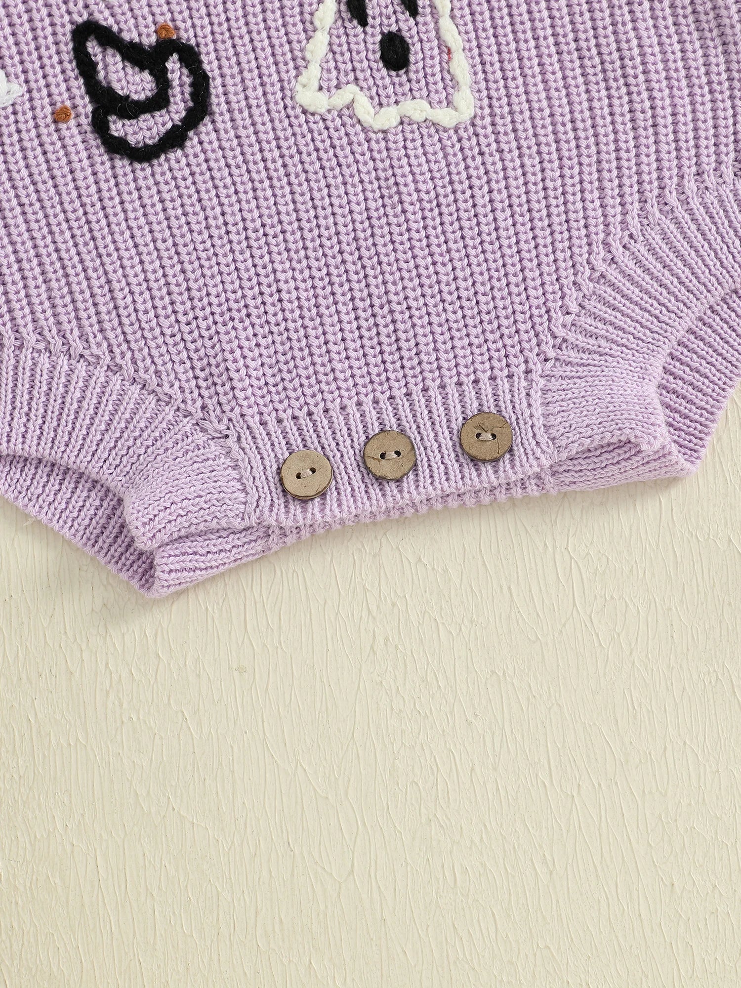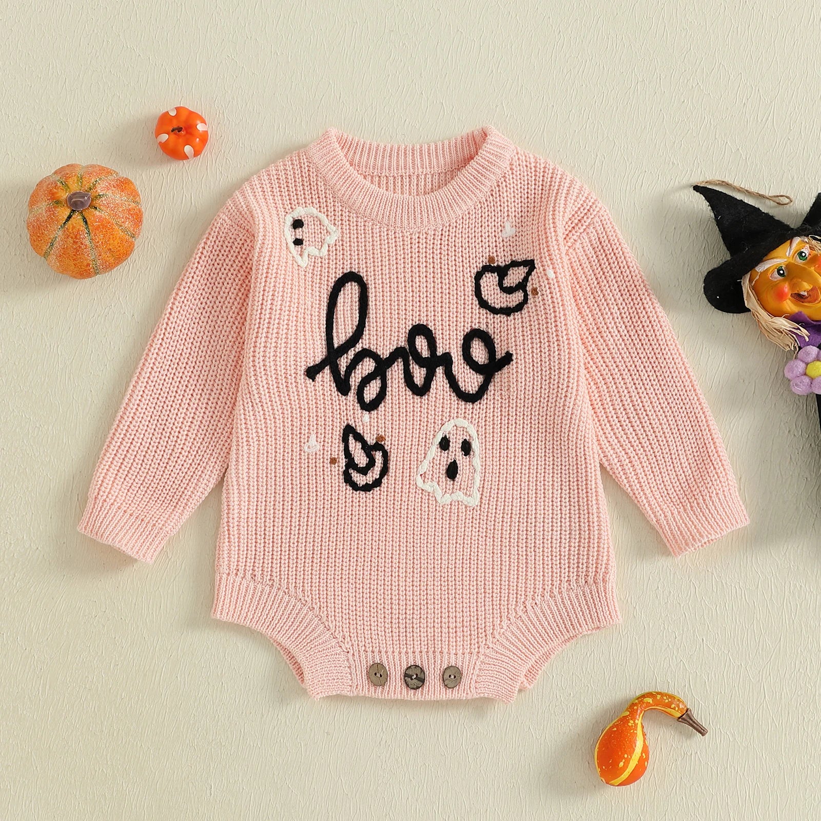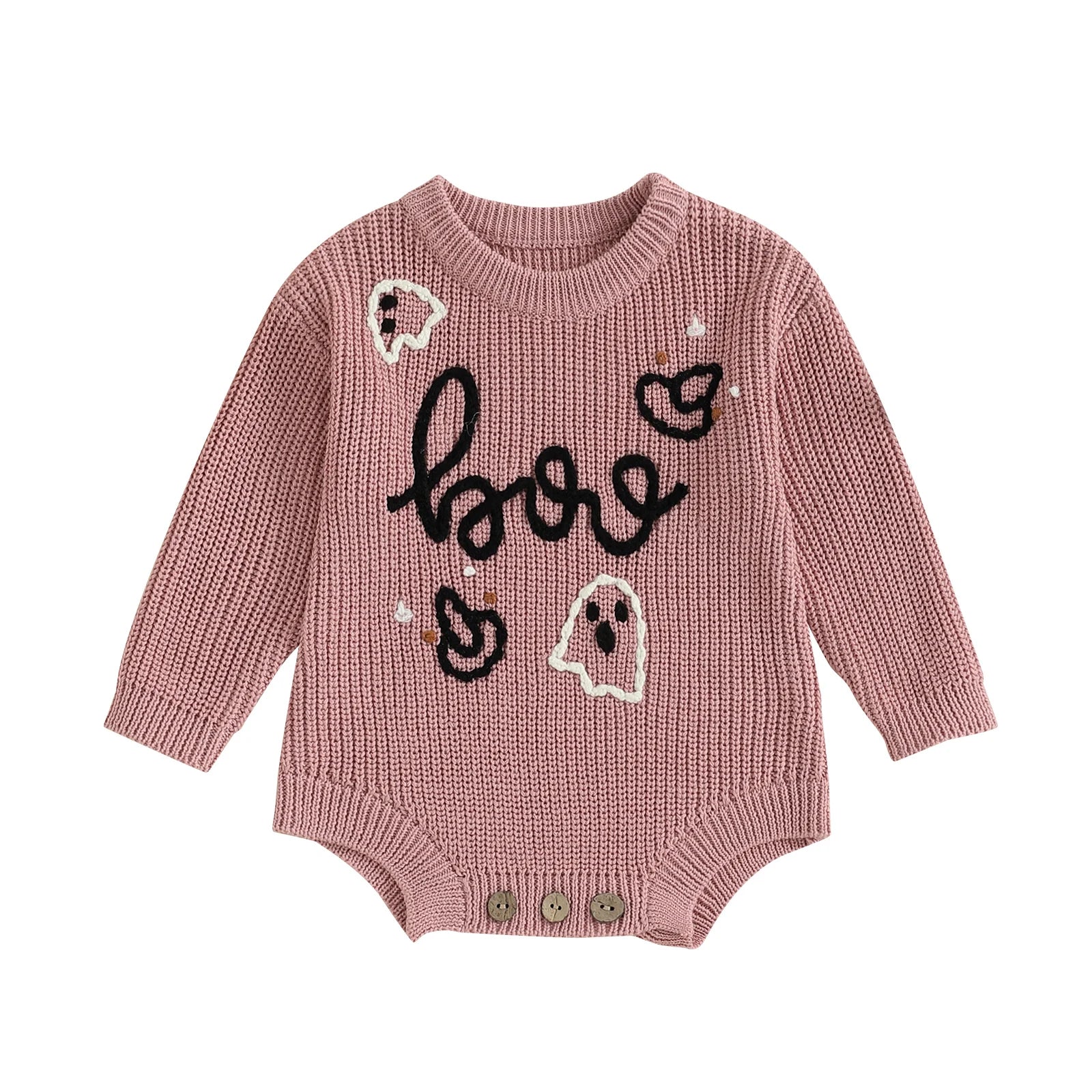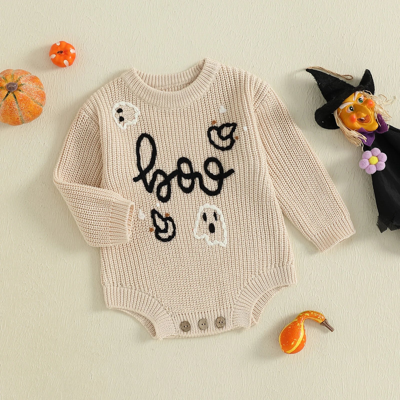 Newborn Baby Halloween Sweater Romper - Ghost Letter Embroidered Long Sleeve Jumpsuit