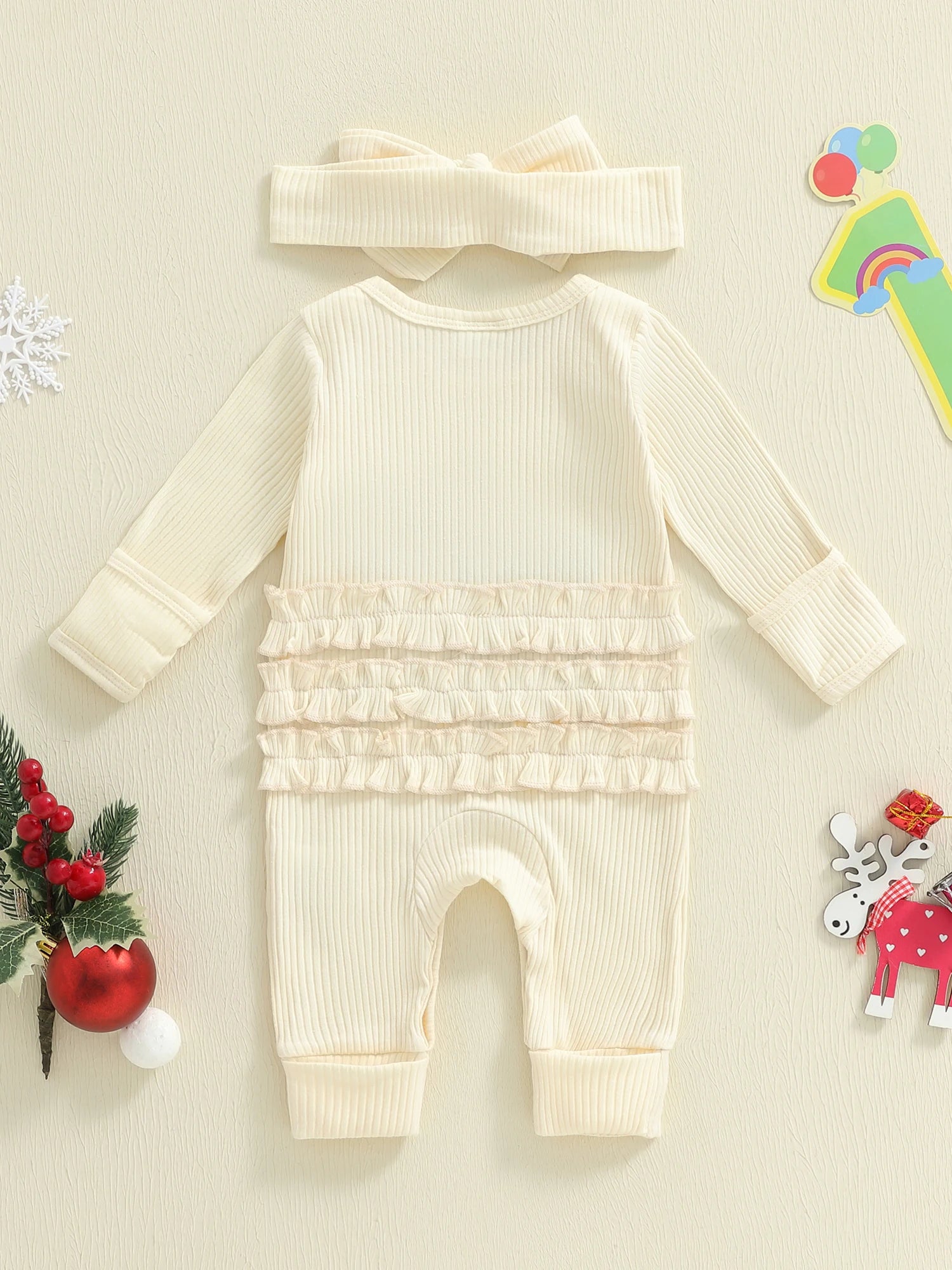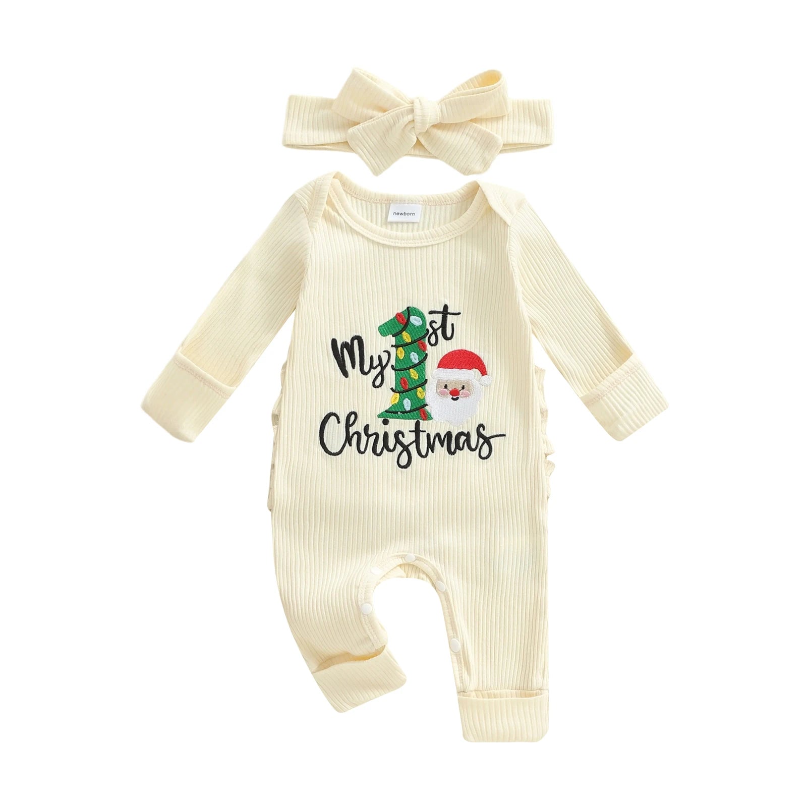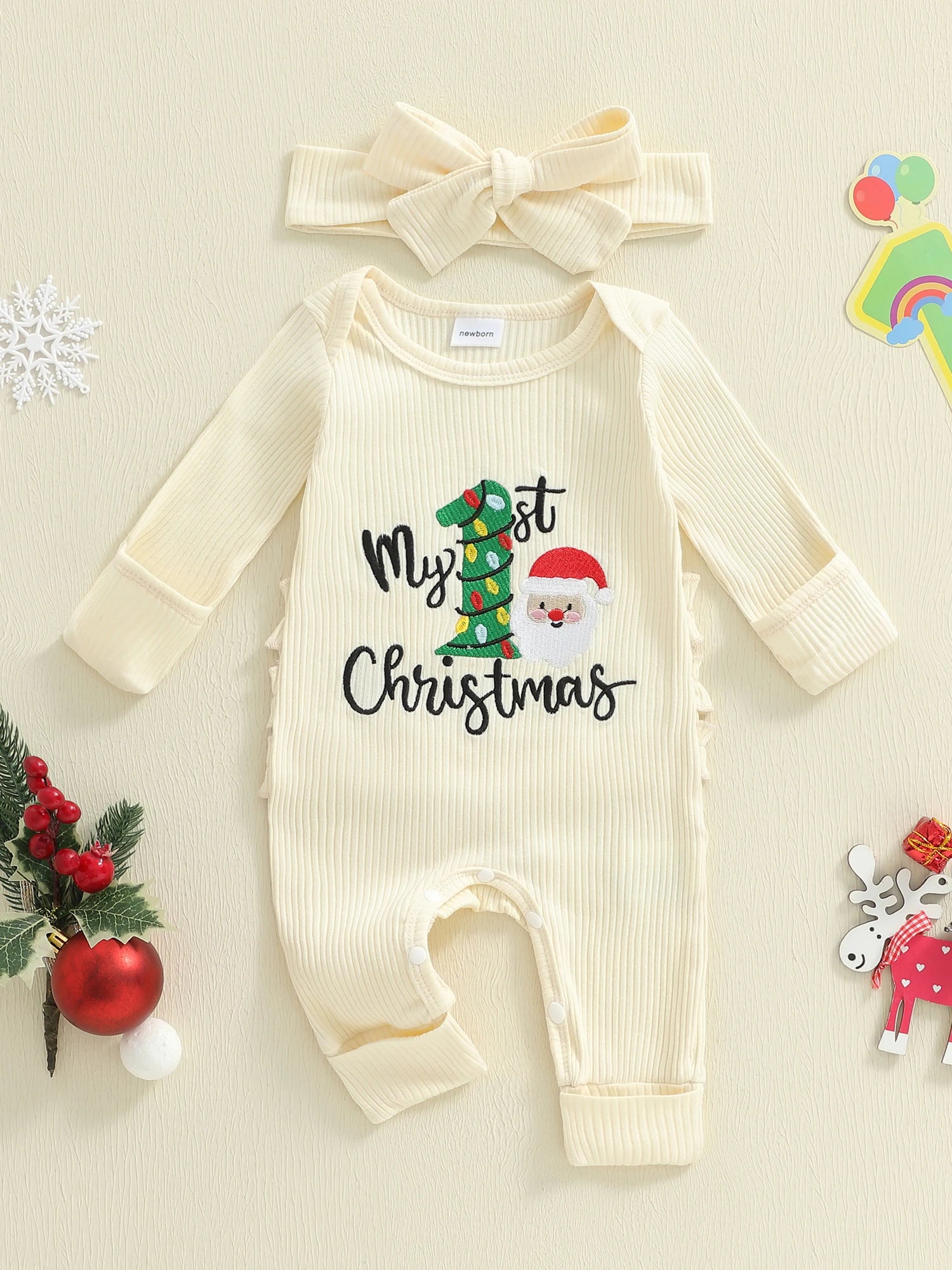 Celebrate baby's first Christmas in style with this charming romper and headband set. Featuring festive Xmas tree embroidery and cheerful letter details, this cozy long sleeve jumpsuit is perfect for holiday celebrations and memorable photos.