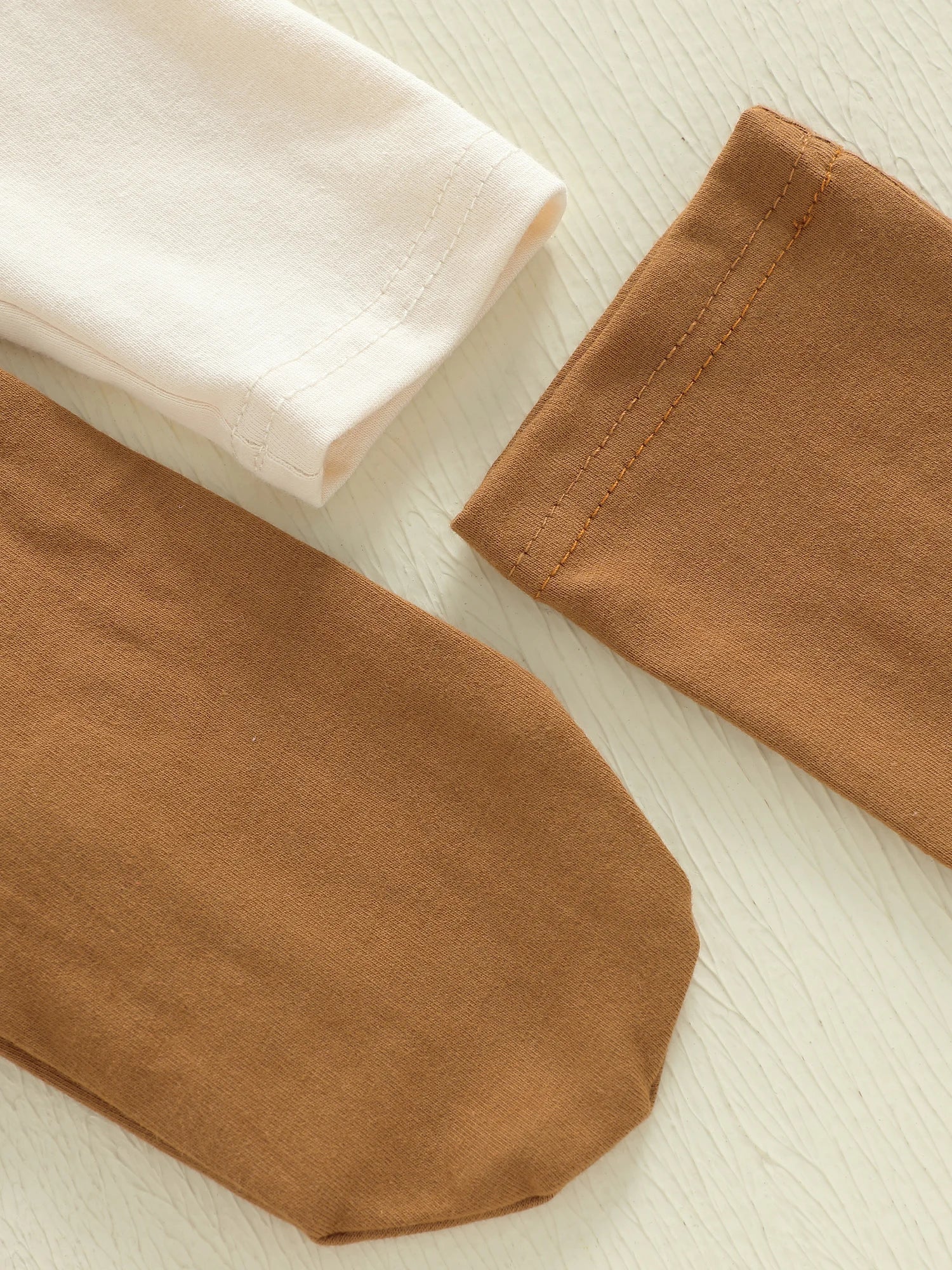 - Complete 3-piece set: romper, patterned skirt, bow headband, and socks