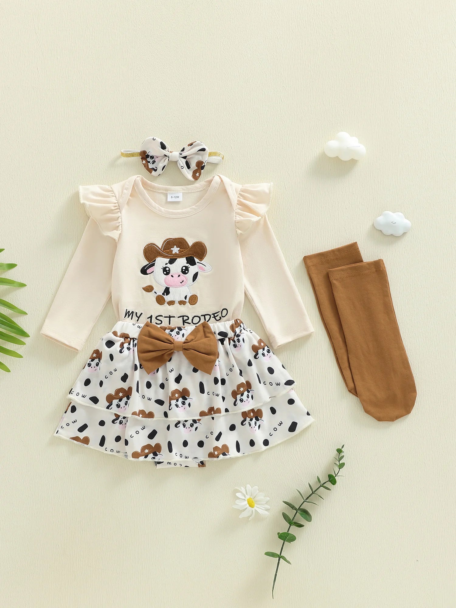 Newborn Baby Girls Boys Outfit Set - Cow Embroidery Romper with Skirt & Accessories 0-12M