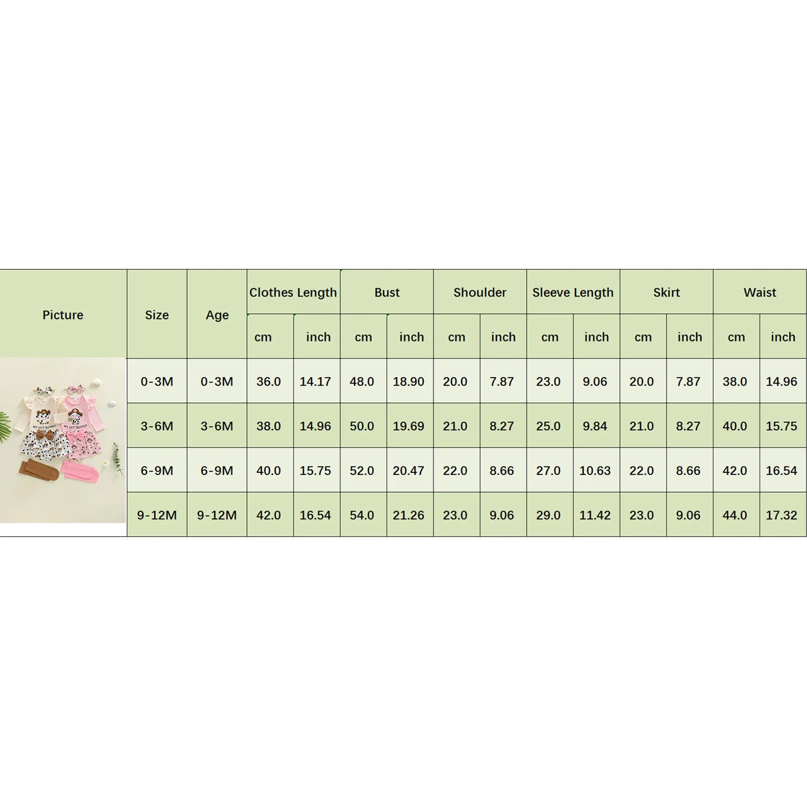 What's Included: 1 x Long Sleeve Romper, 1 x Patterned Skirt, 1 x Bow Headband, 1 x Socks