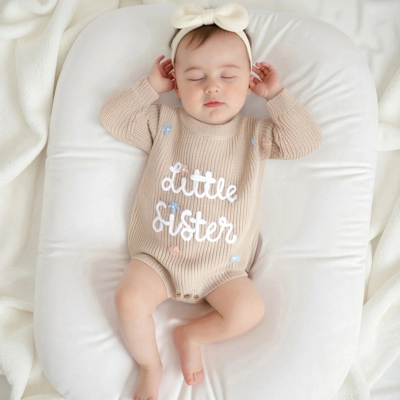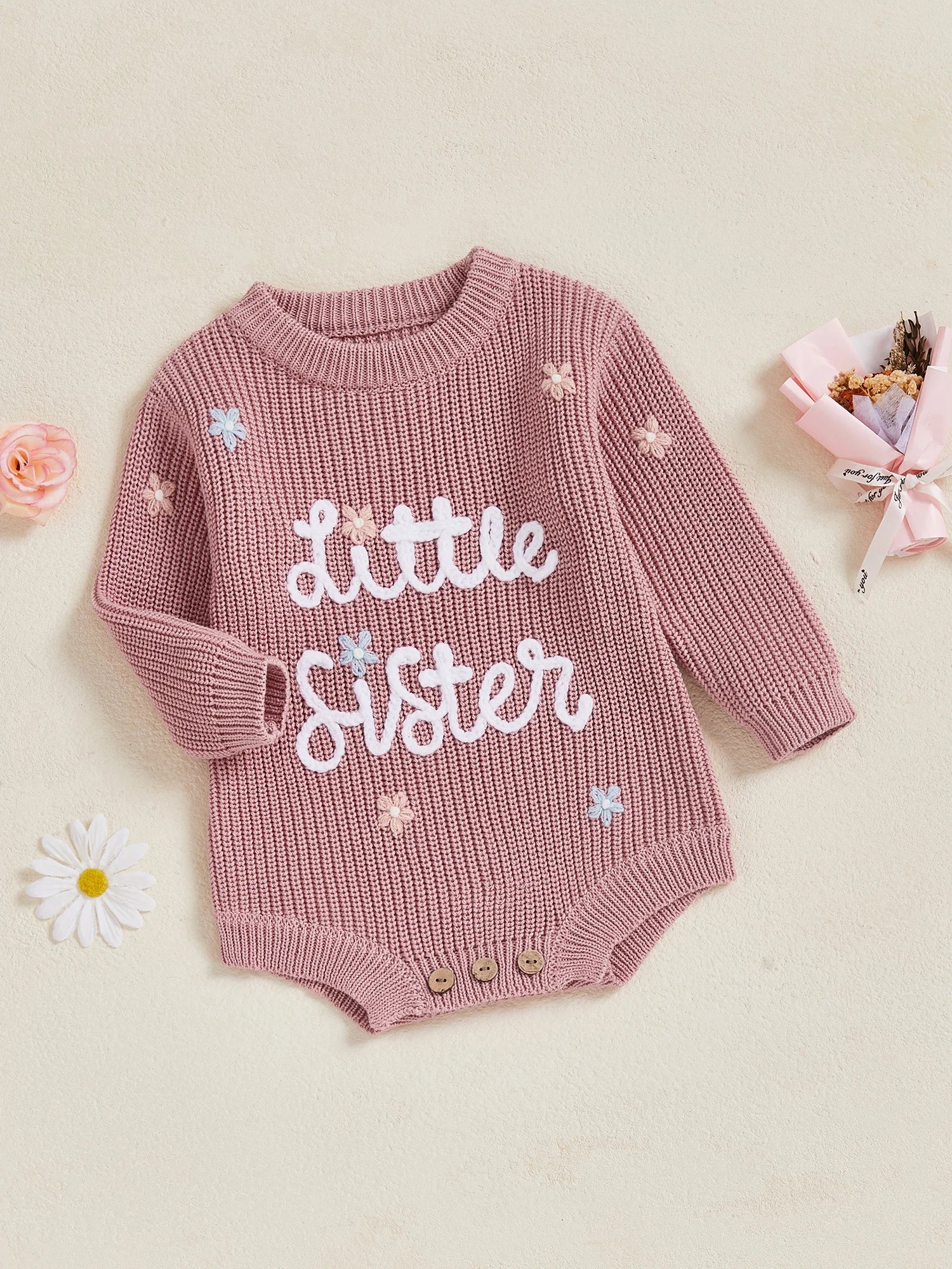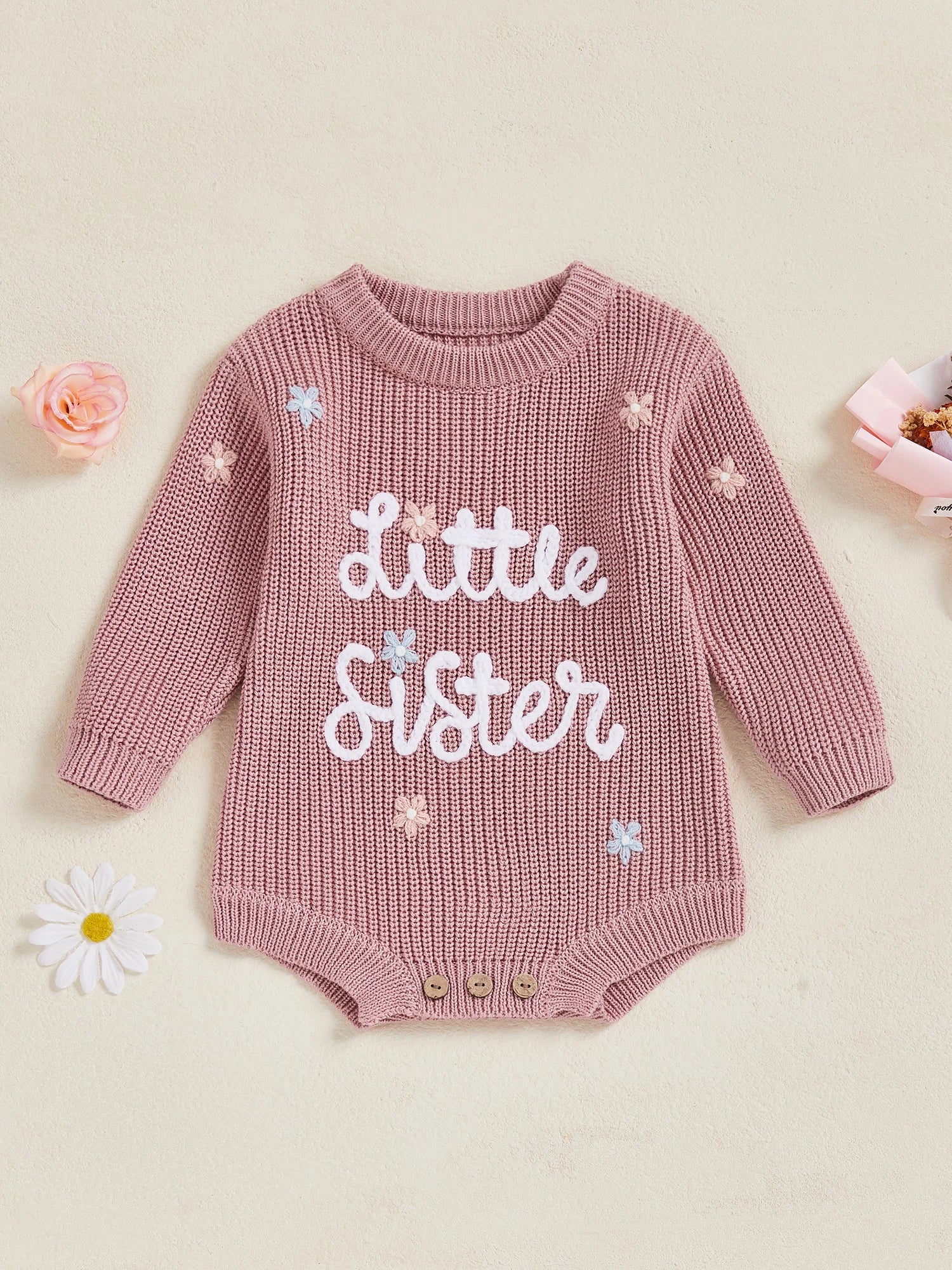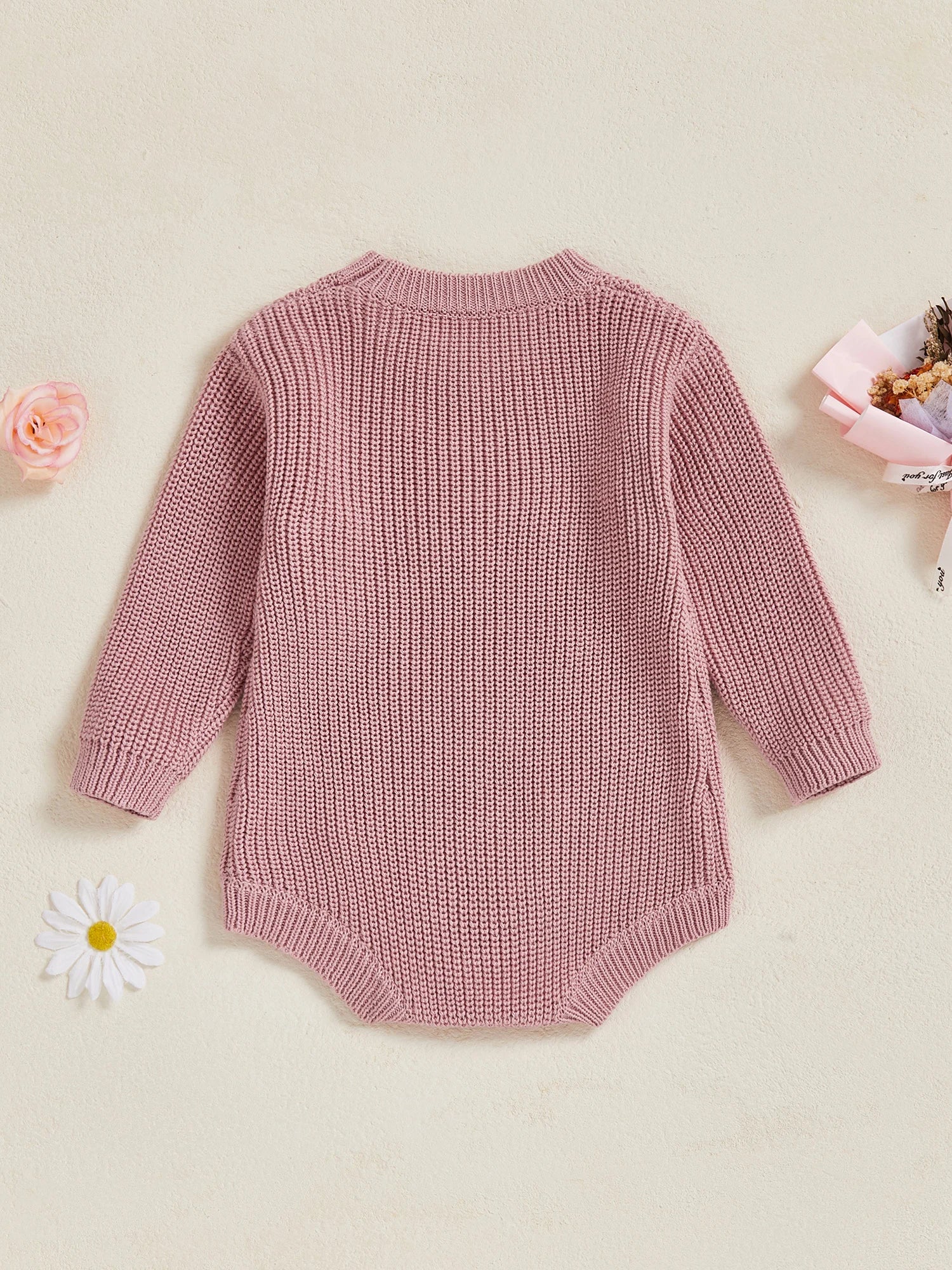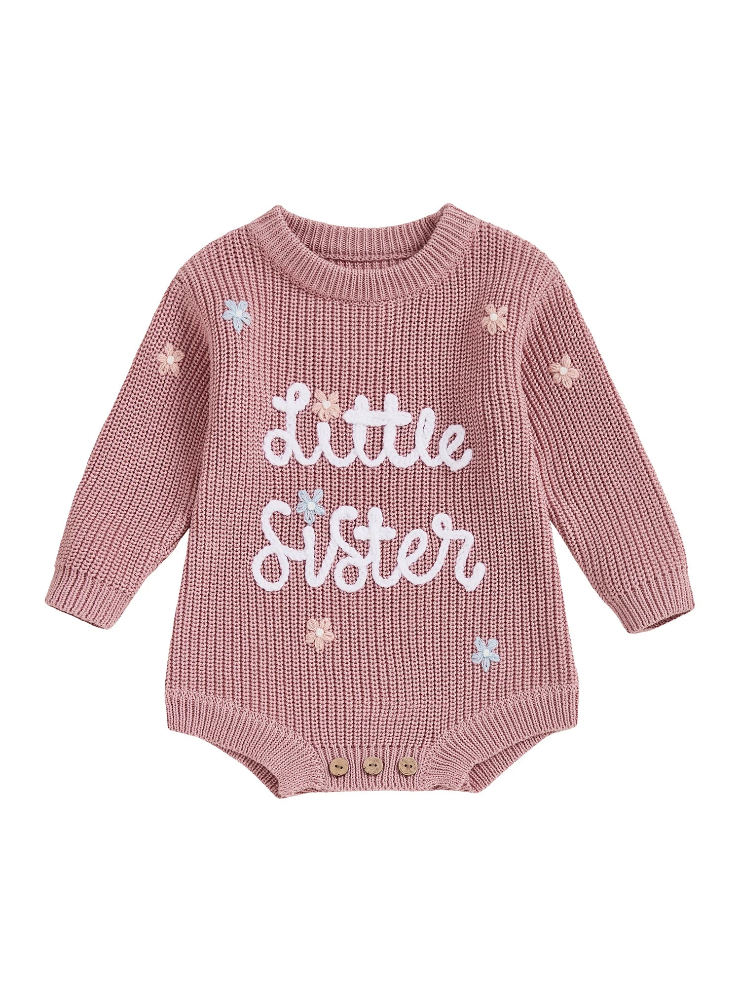 Keep your little one warm and stylish throughout winter with this charming knit sweater romper. Featuring delicate letter and floral embroidery with a classic round neck design, this soft knitted jumpsuit is perfect for keeping your newborn cosy during the colder months. Suitable for both baby girls and boys.