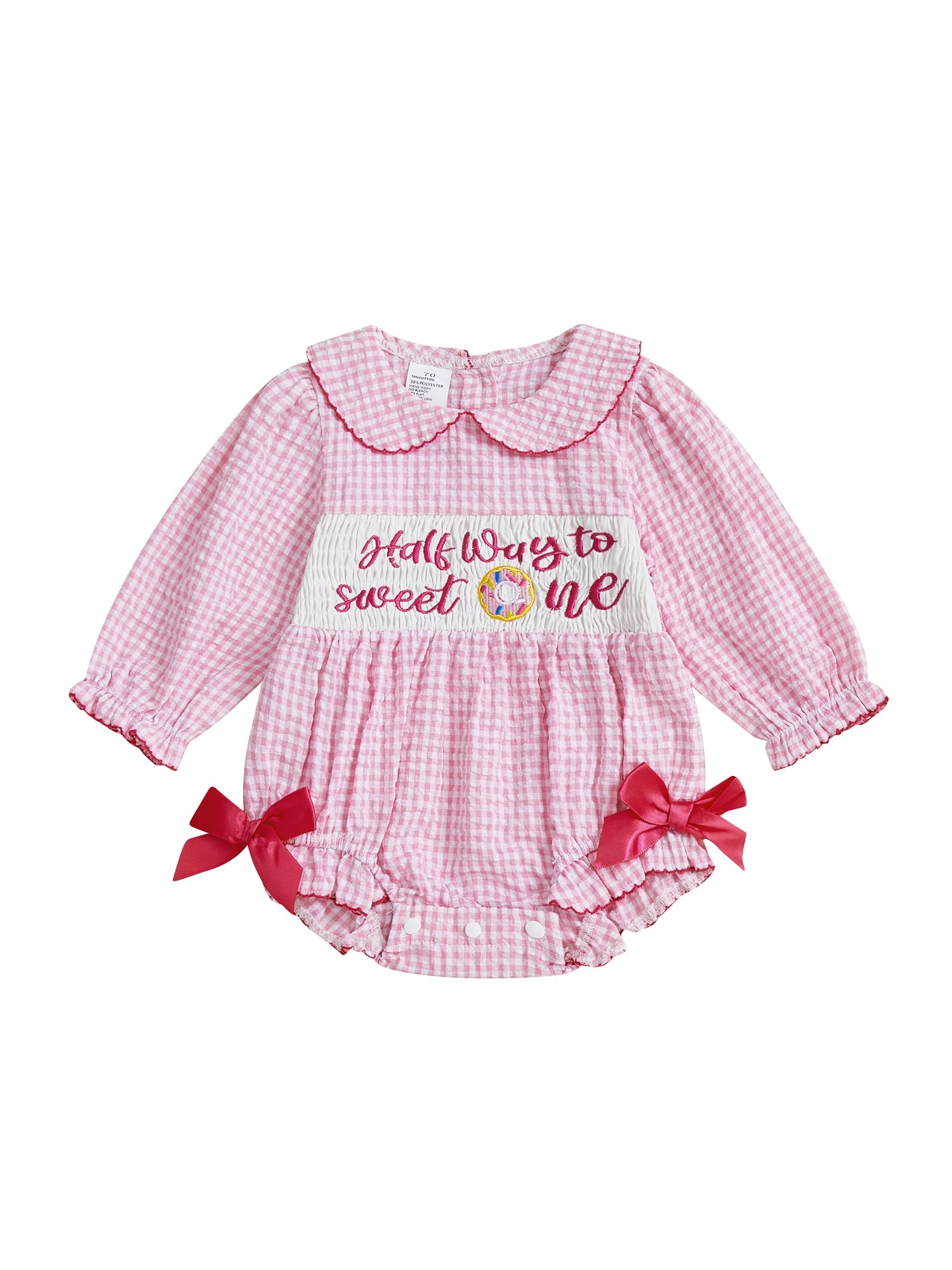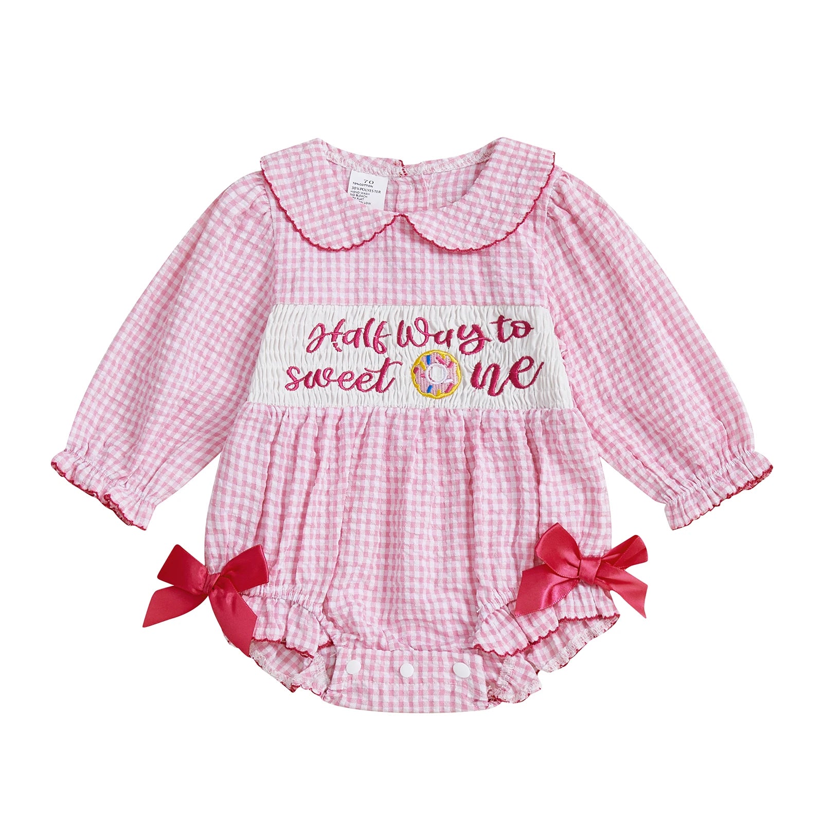 Newborn Baby Girls' Plaid Bubble Romper - Letter Embroidery Doll Collar Smocked Jumpsuit
