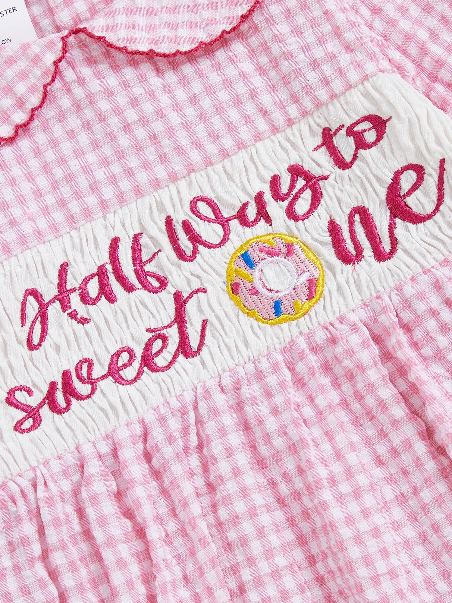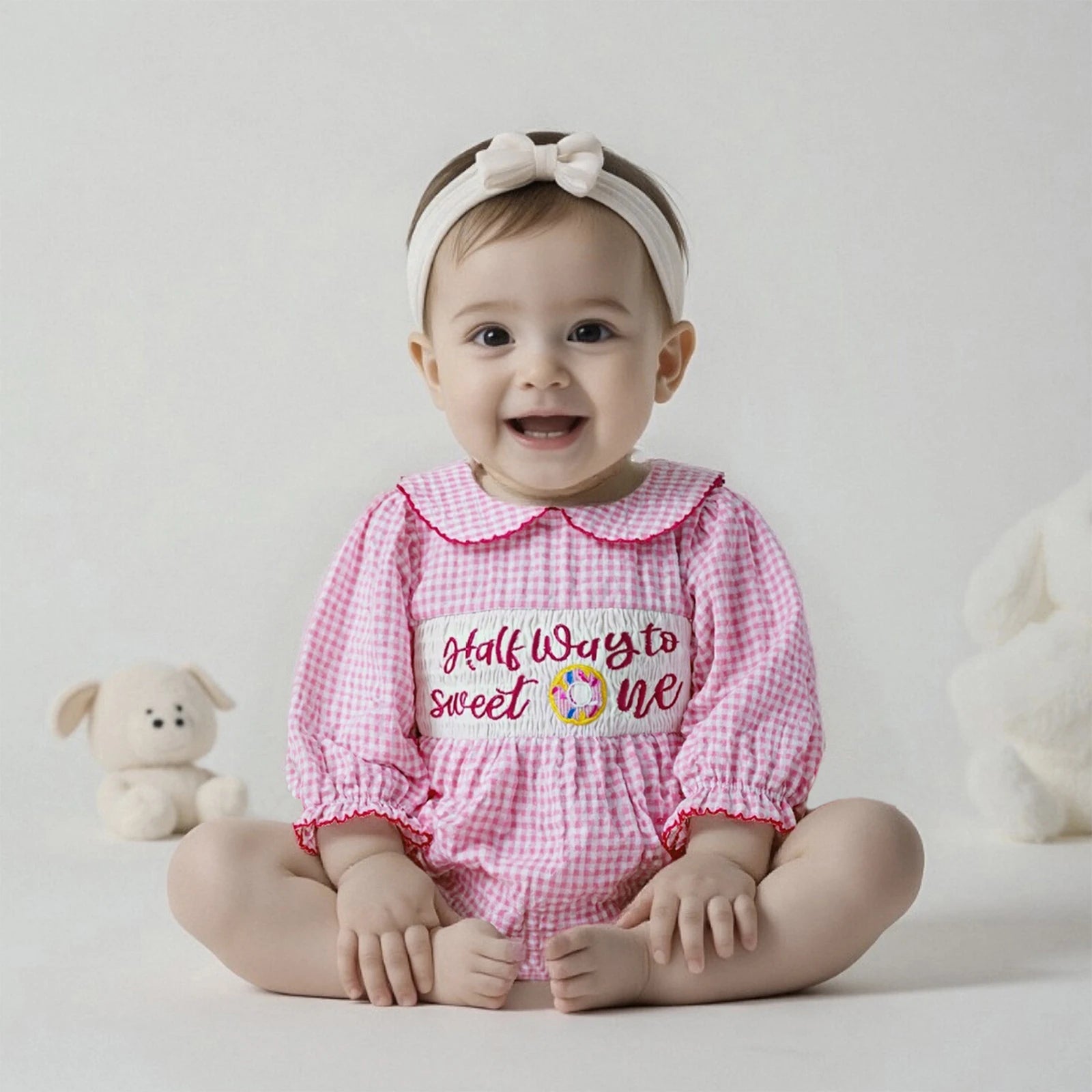 Celebrate your little one's early months and special occasions with this charming plaid bubble romper. Featuring adorable letter embroidery, a classic doll collar, and beautiful smocking detail, this long sleeve jumpsuit is perfect for newborns and babies aged 0-12 months.