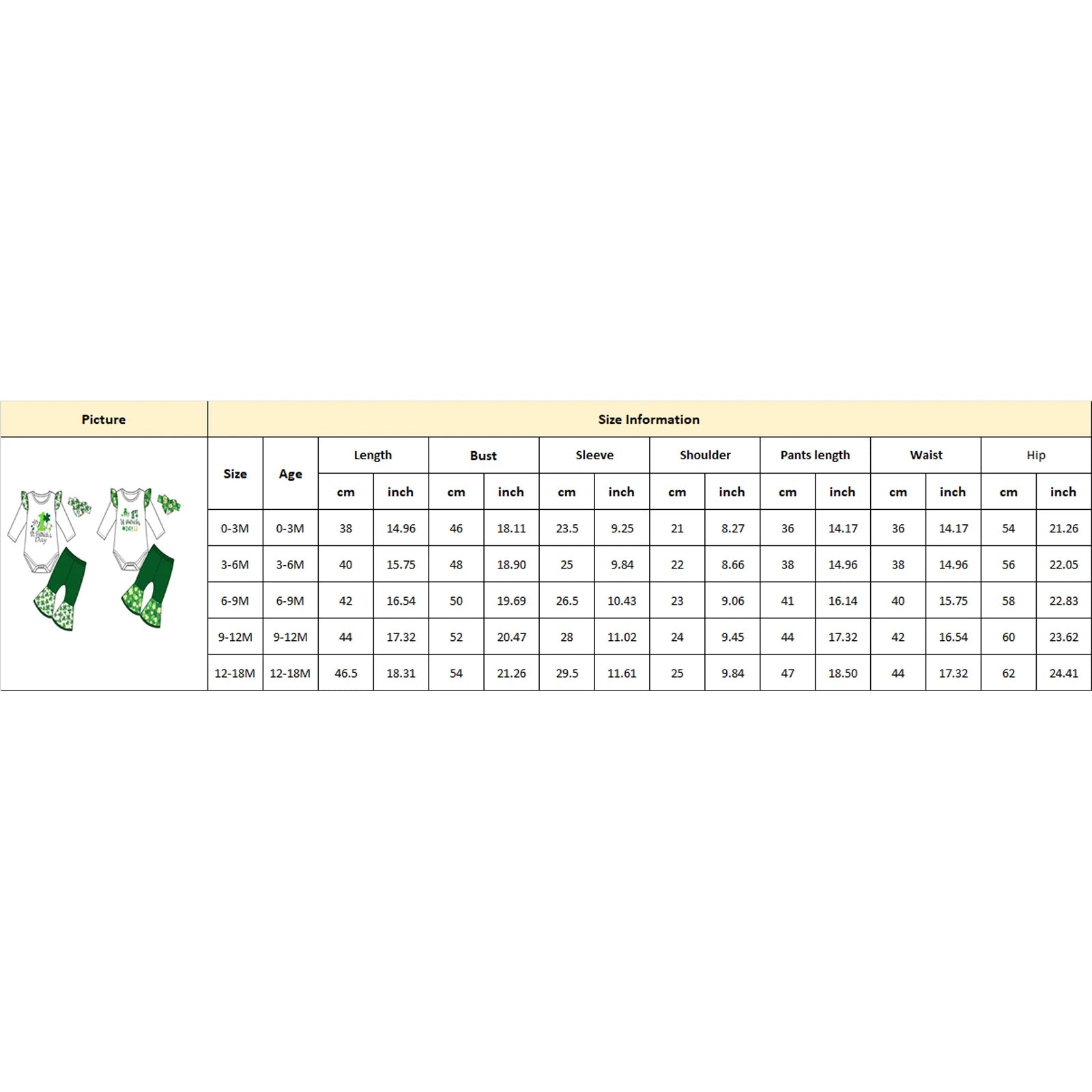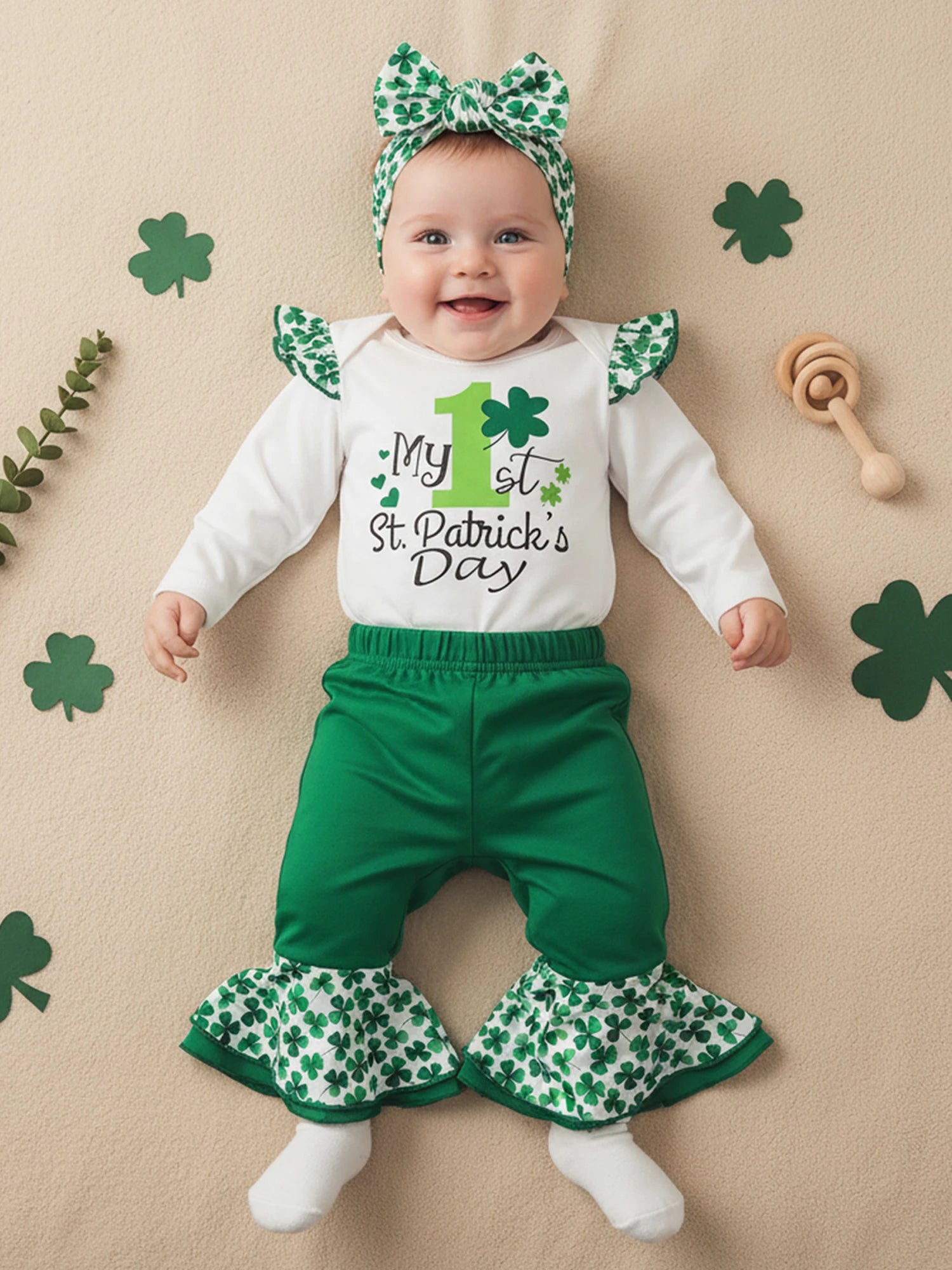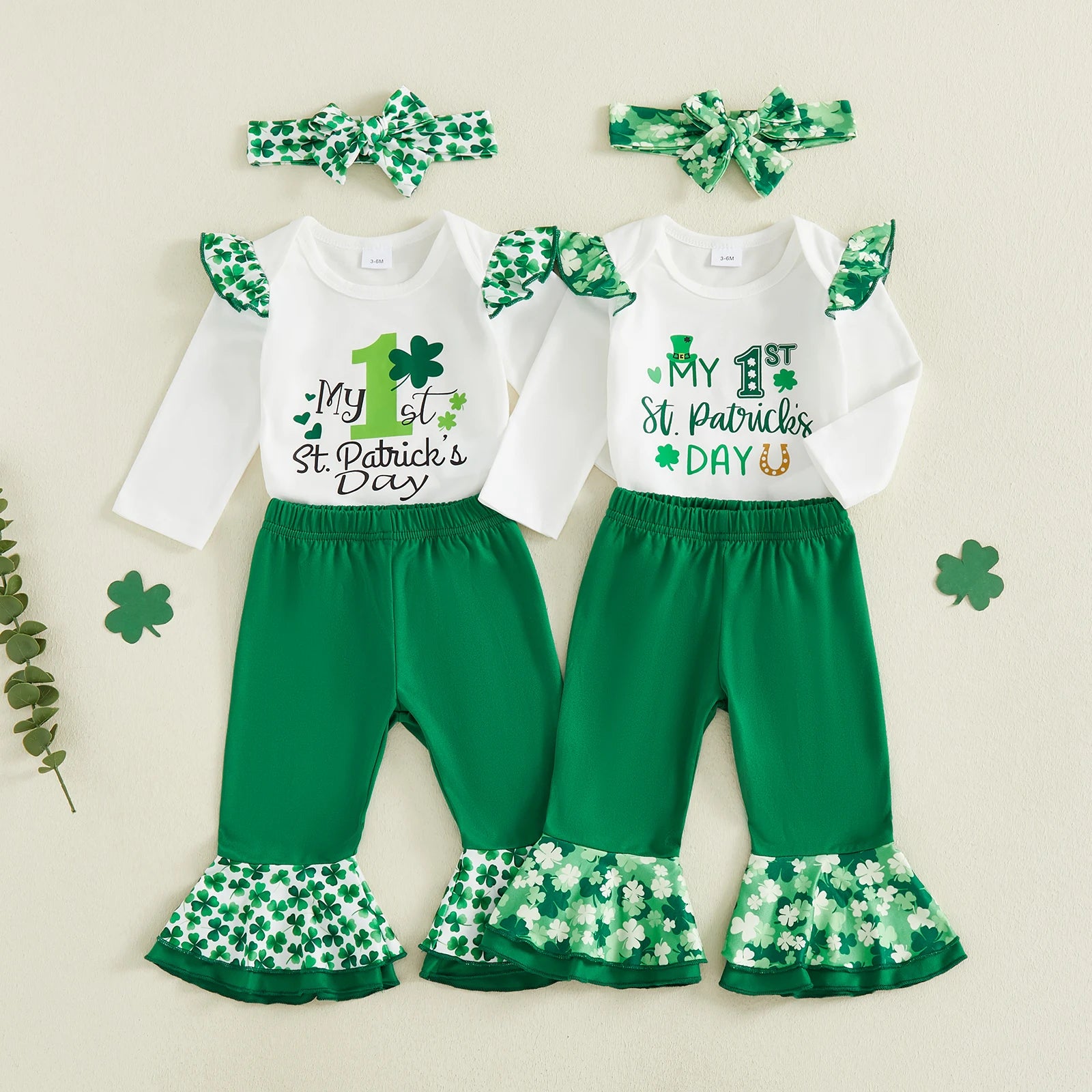 Celebrate Irish charm with this delightful 3-piece outfit set featuring a letter and clover print design. This complete ensemble includes a long sleeve romper, trendy flare pants, and a matching headband—perfect for St. Patrick's Day celebrations and everyday wear. Available in 2 style variations.