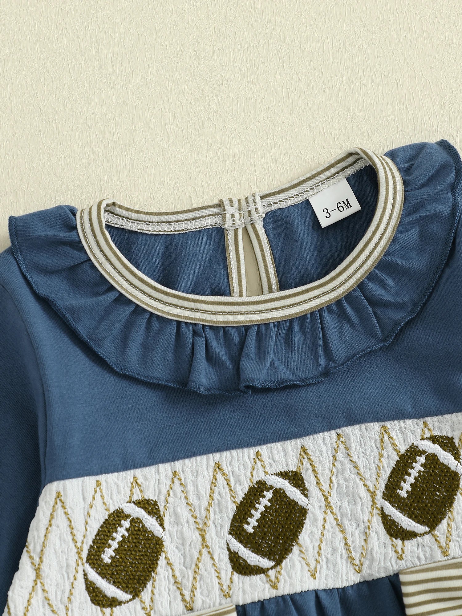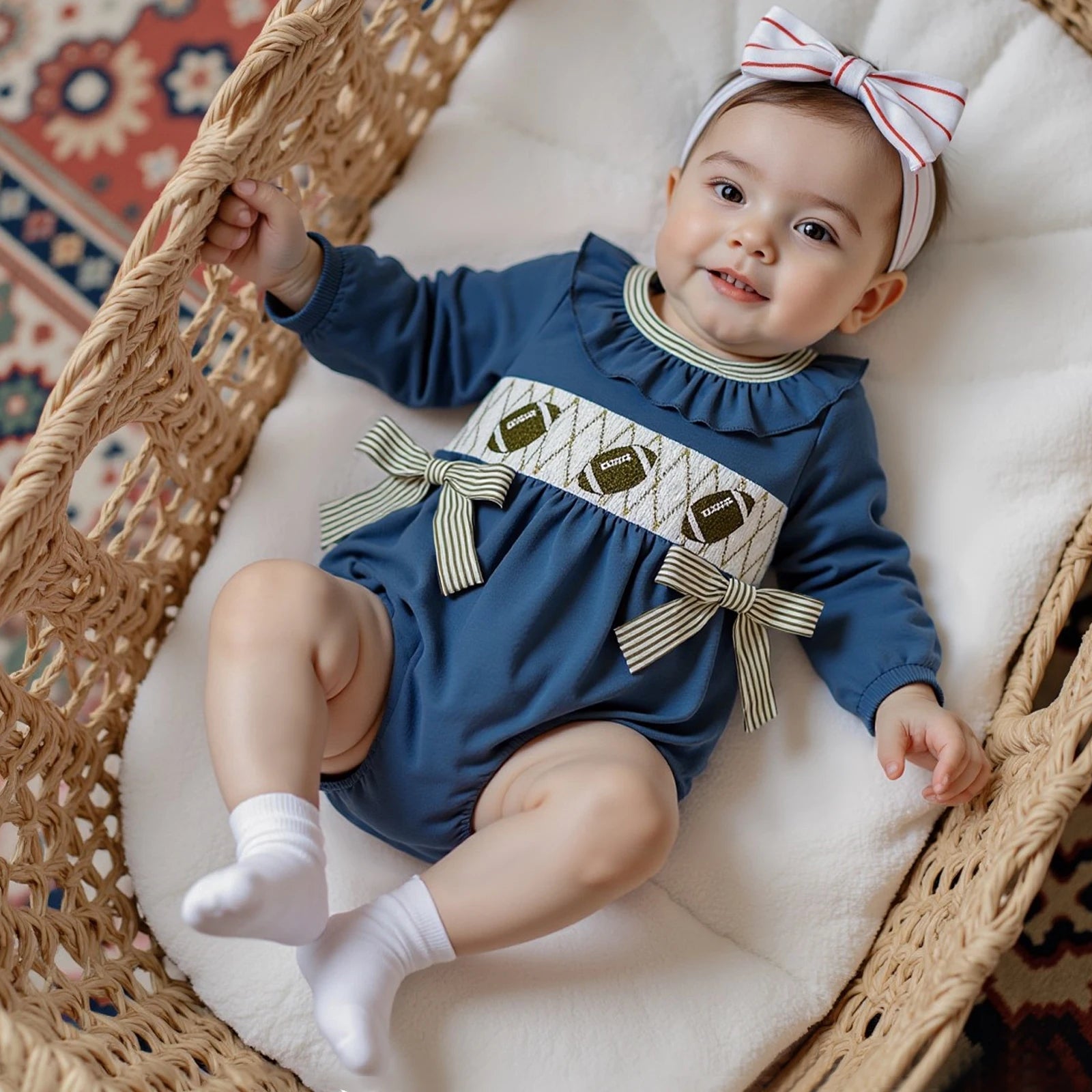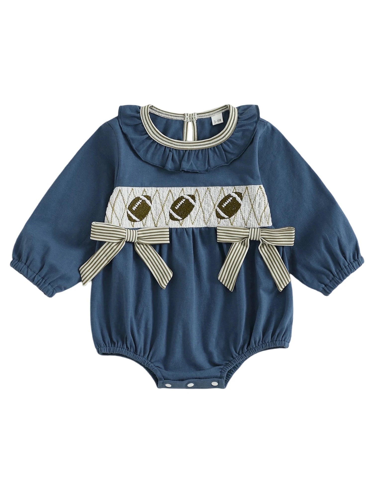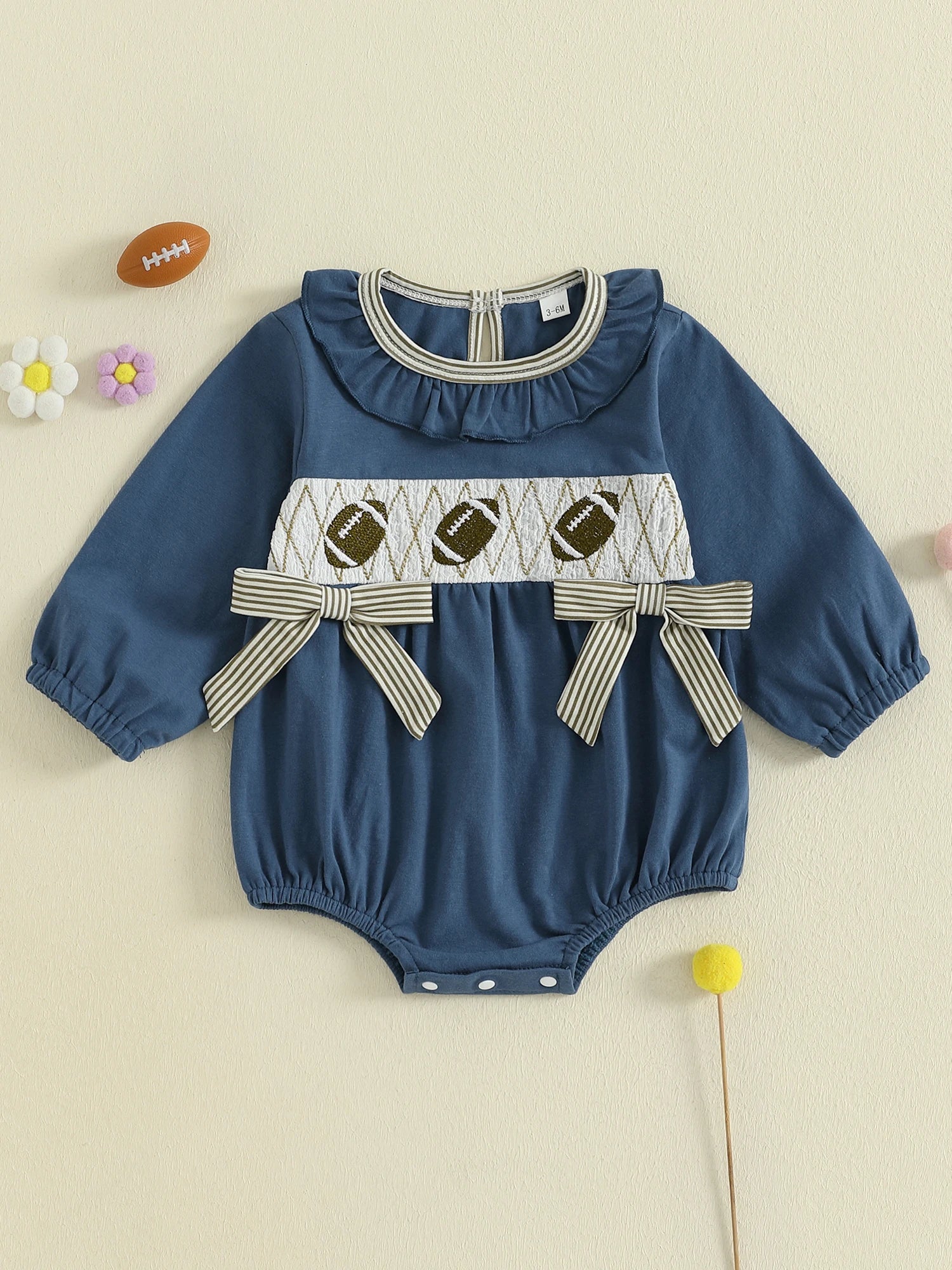 Dress your little princess in style with this charming long-sleeve bubble romper featuring delightful football embroidery, sweet ruffled round neckline, and adorable bow details. Perfect for autumn and winter adventures with a touch of sporty elegance.