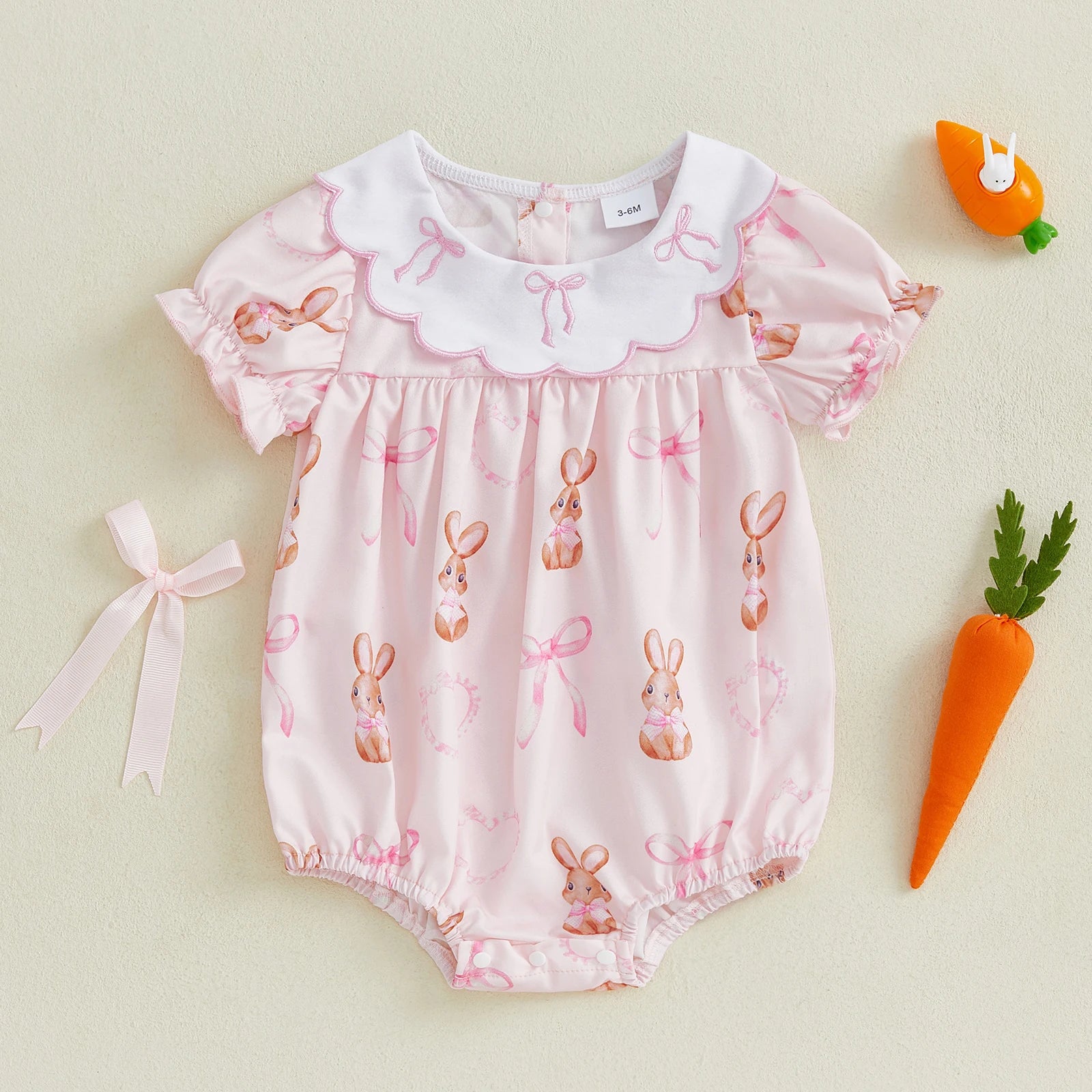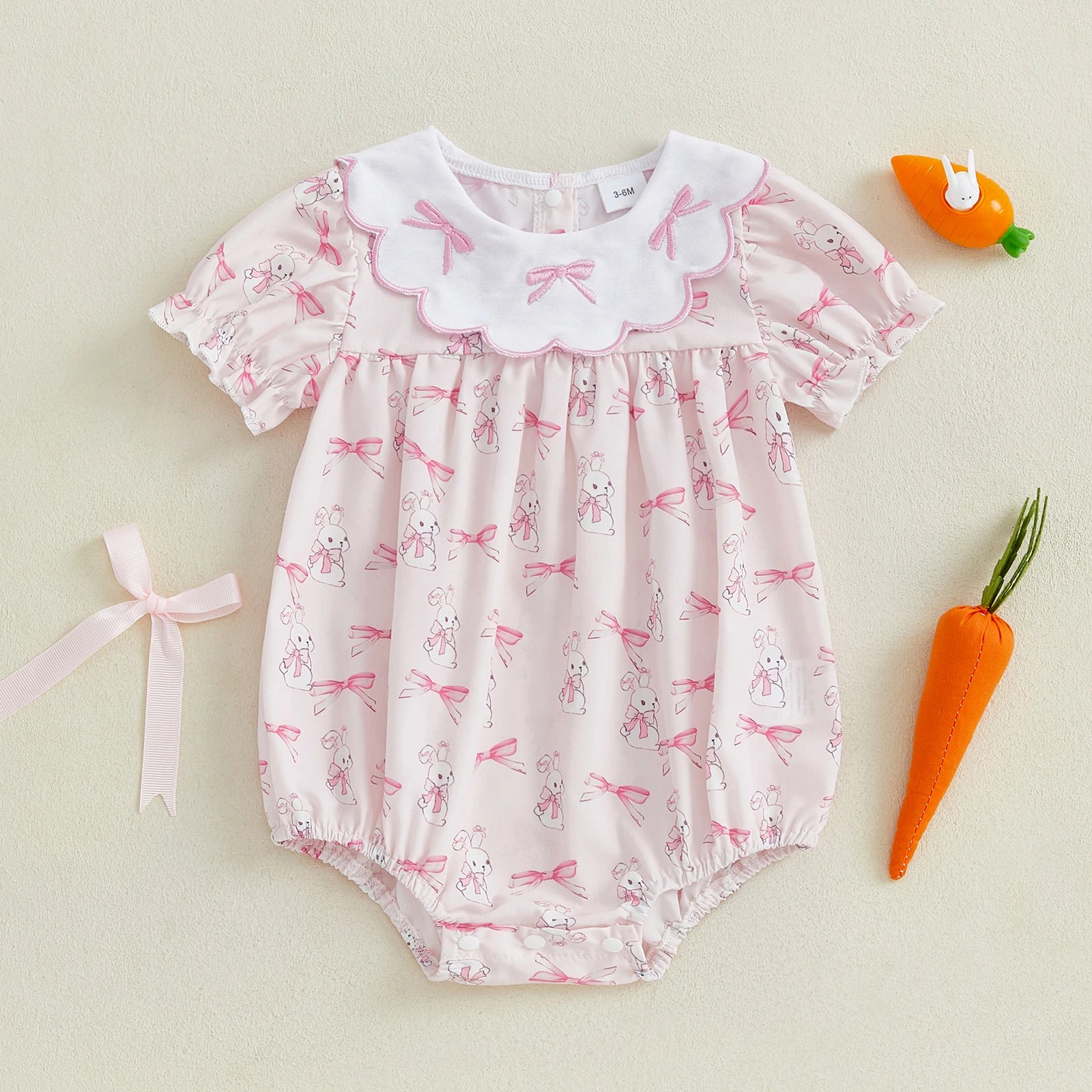 Celebrate Easter in style with this precious baby girls romper featuring charming rabbit bow prints and delicate doll collar design. Available in 3 delightful styles with ruffle short sleeves, perfect for Easter celebrations, spring outings, or any special occasion for your little bunny aged 0-18 months.