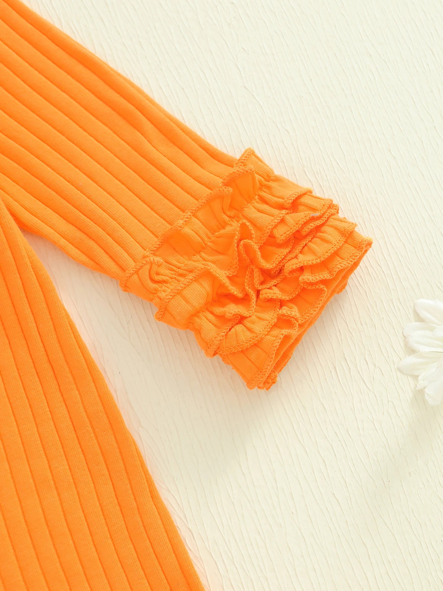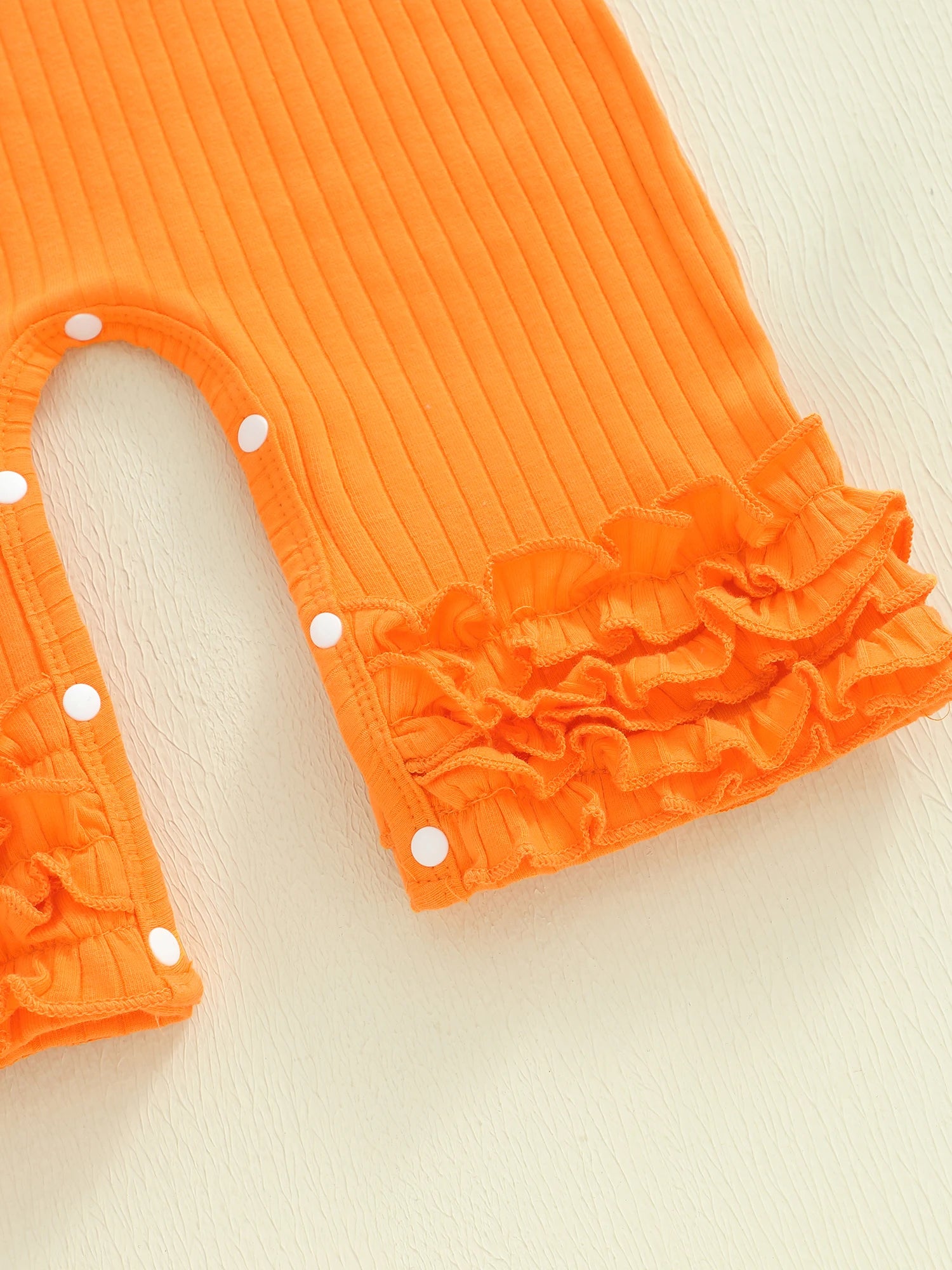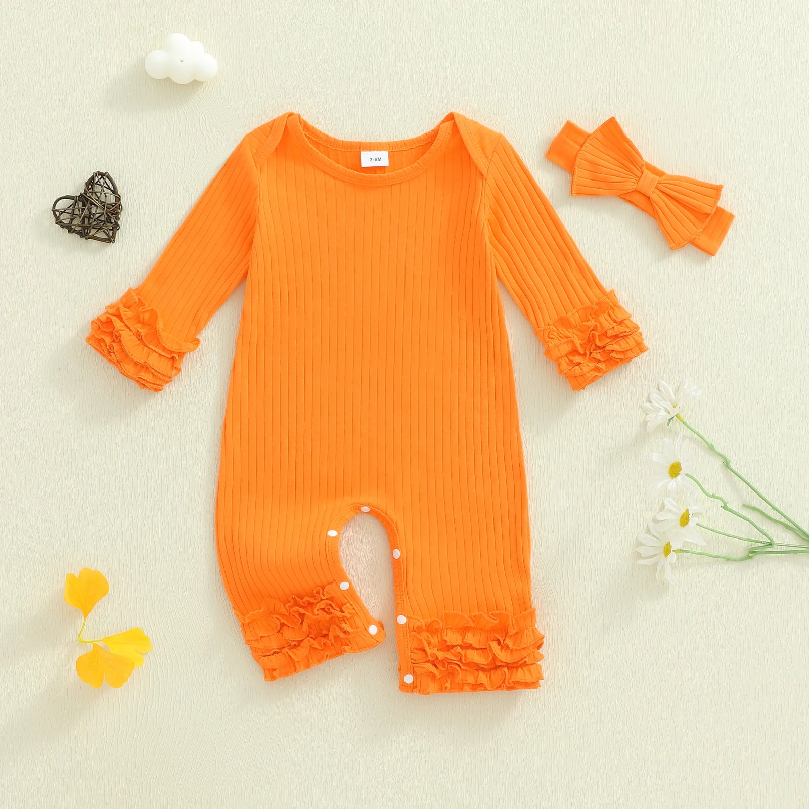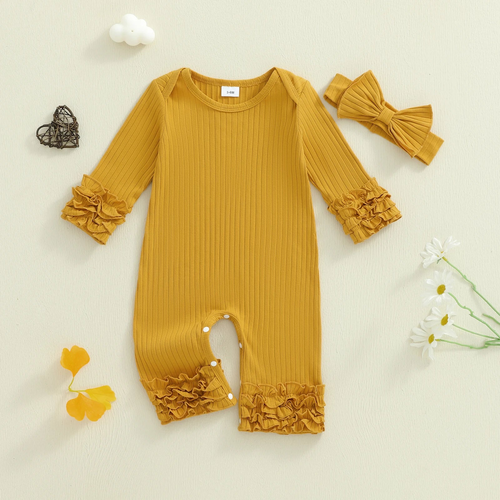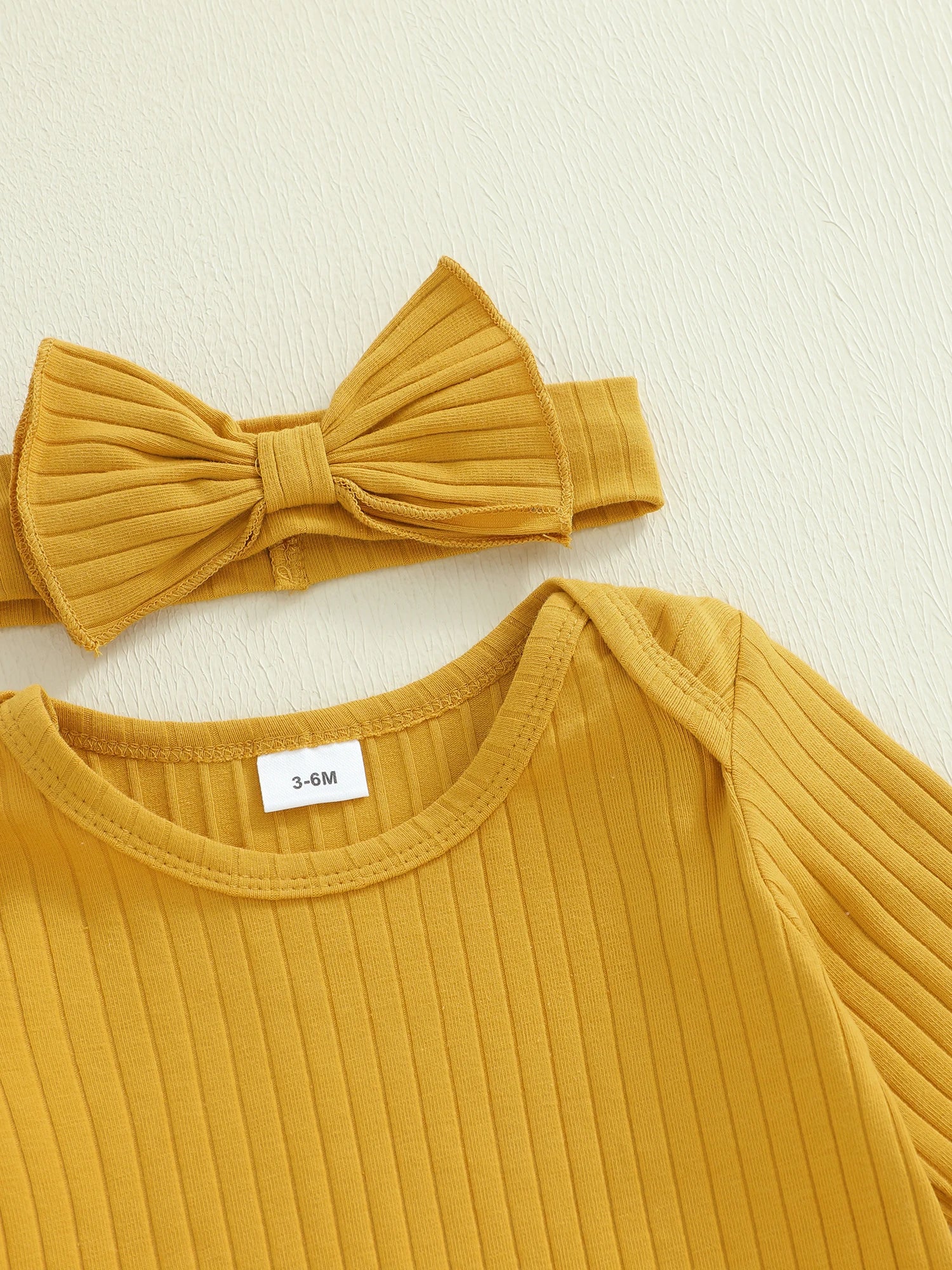 This charming two-piece set features a long sleeve O-neck full-length jumpsuit in a lovely solid colour paired with a matching bow headband. Perfect for autumn and winter, this cosy romper keeps your little one comfortable and stylish throughout the cooler months.