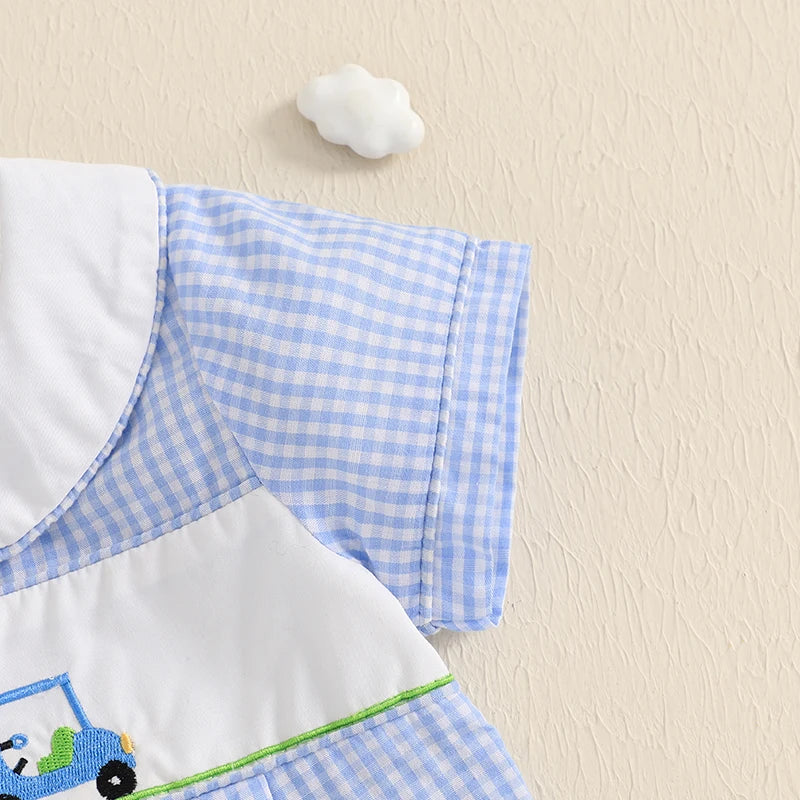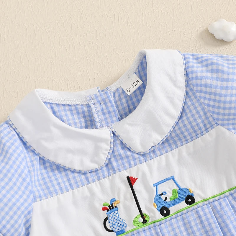 Dress your little gentleman in this charming plaid romper featuring a sweet doll collar and golf embroidery detail. Perfect for warm weather, this short sleeve jumpsuit combines classic style with playful comfort.