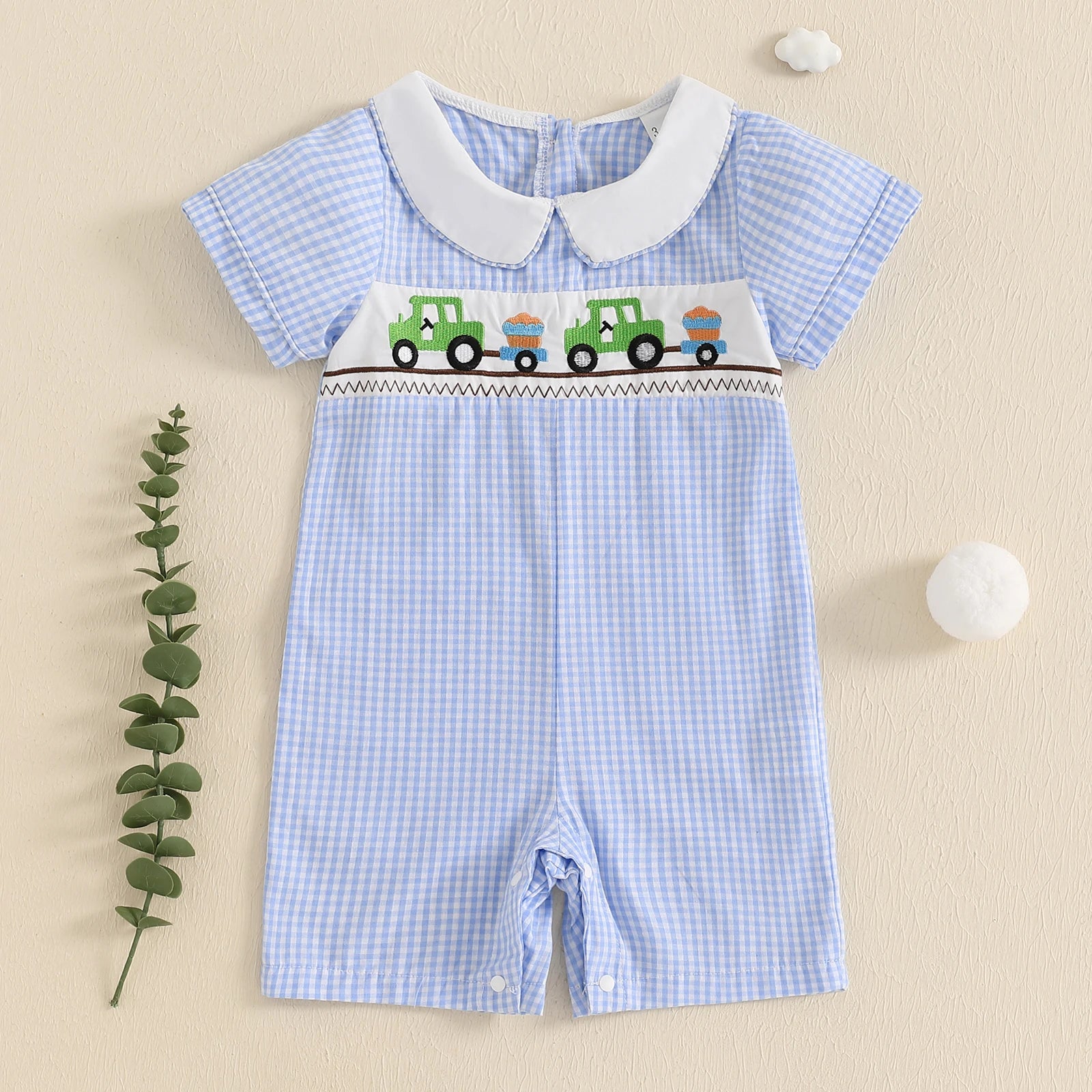 Baby Boys Romper - Doll Collar Golf Embroidery Plaid Jumpsuit
