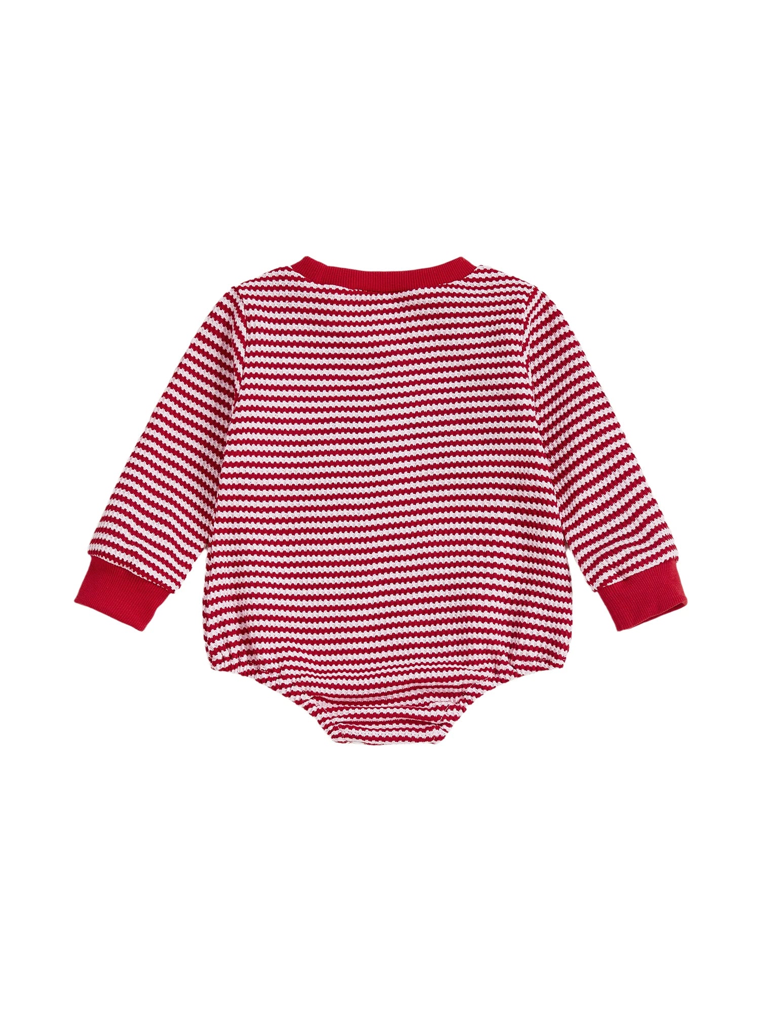 Get your little one ready for Christmas celebrations with this charming long sleeve romper. Featuring a classic stripes print design with delightful Christmas embroidery, this cosy bodysuit is perfect for the festive season and autumn wear. Suitable for both baby girls and boys.