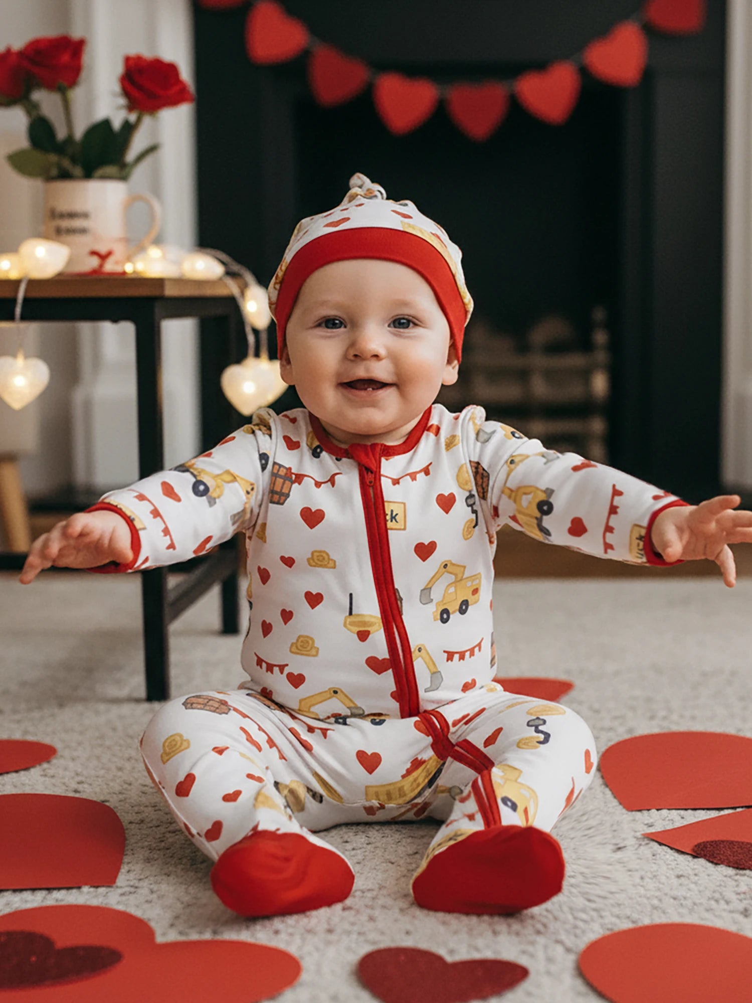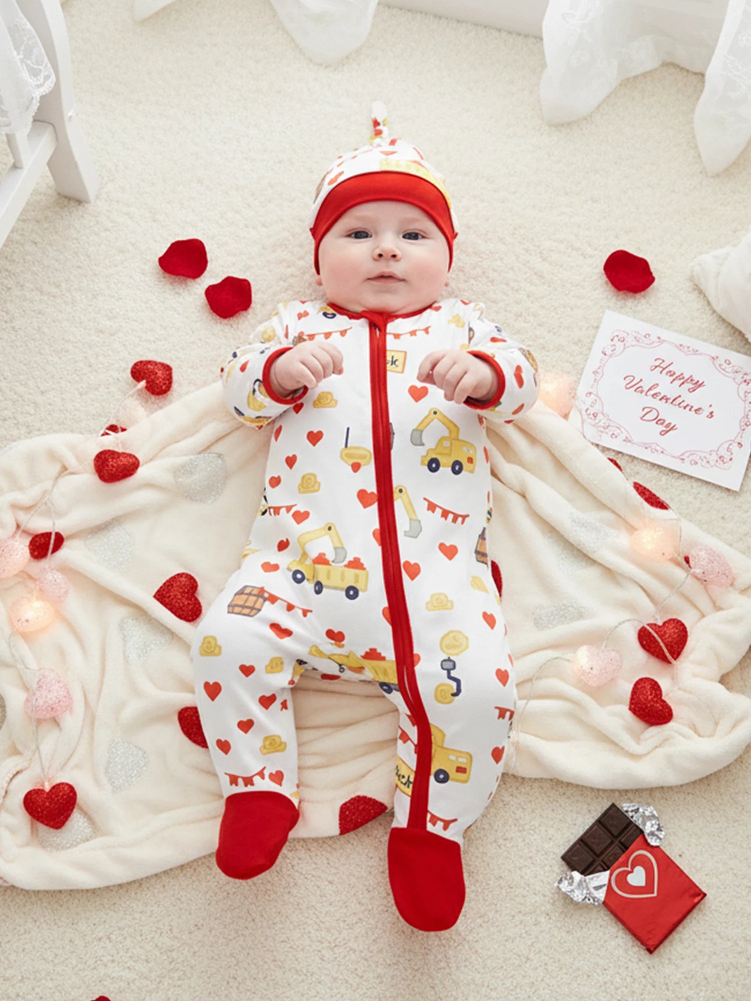 Baby Boys Girls Valentine's Day Romper Set - Excavator Heart Print Jumpsuit with Hat 0-18M