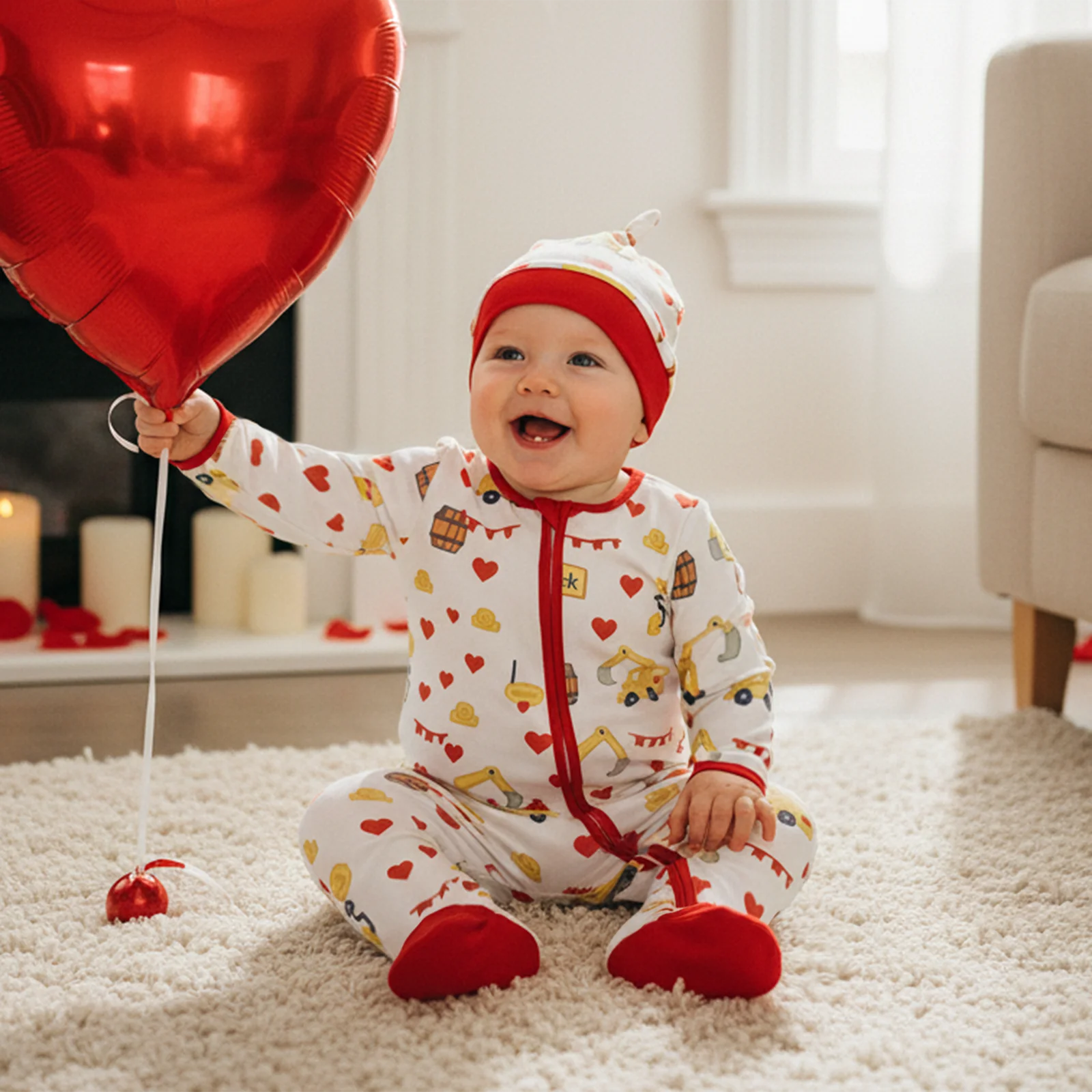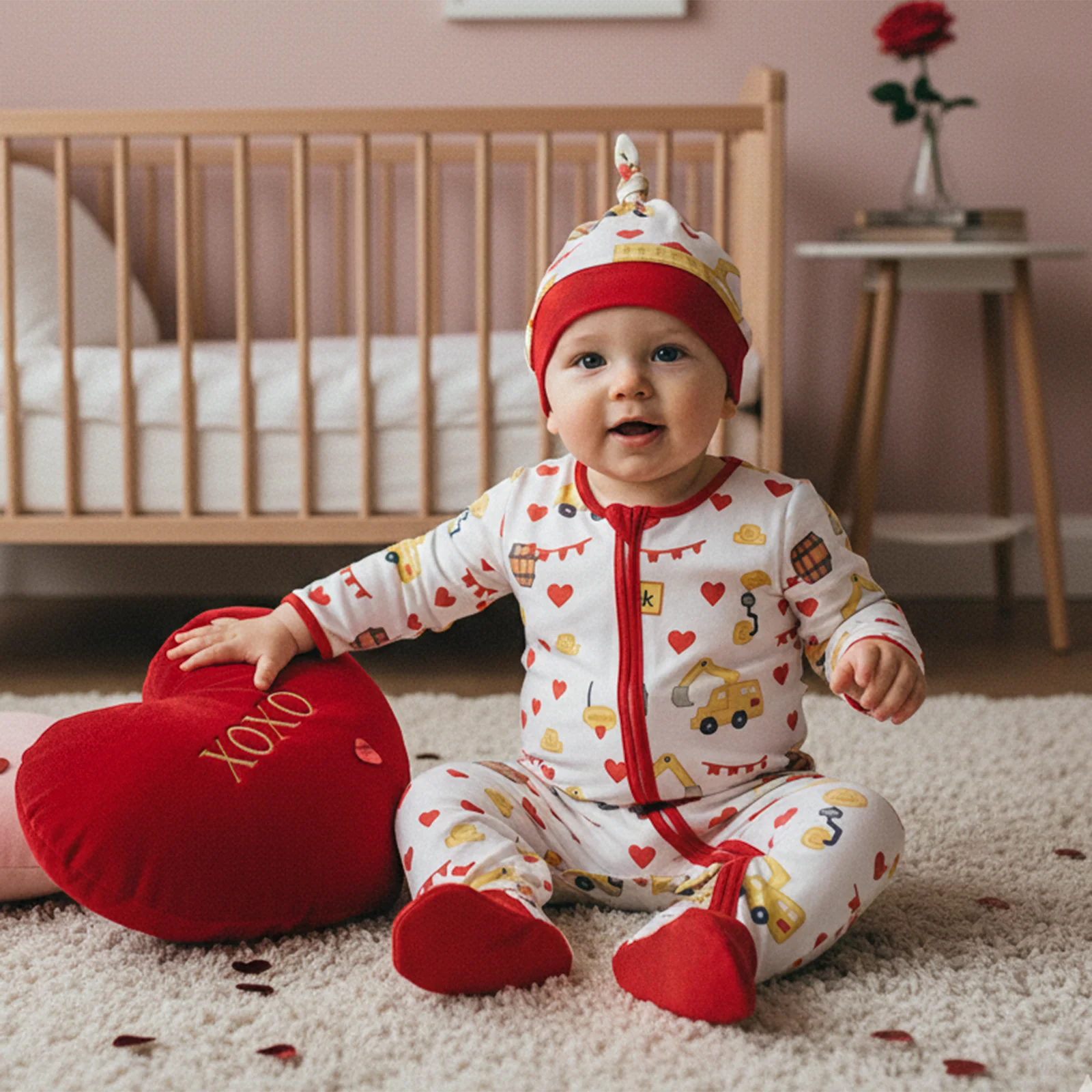 Combine love and construction fun with this charming Valentine's Day romper set for babies. Featuring a playful excavator and heart print long sleeve crew neck jumpsuit with a matching hat, this 2-piece ensemble is perfect for little ones who love vehicles and Valentine's celebrations.