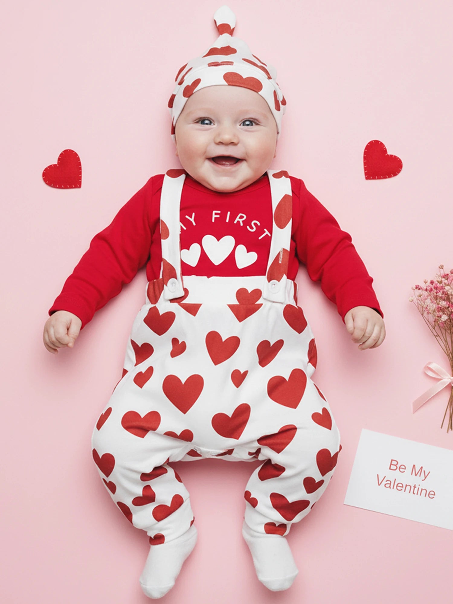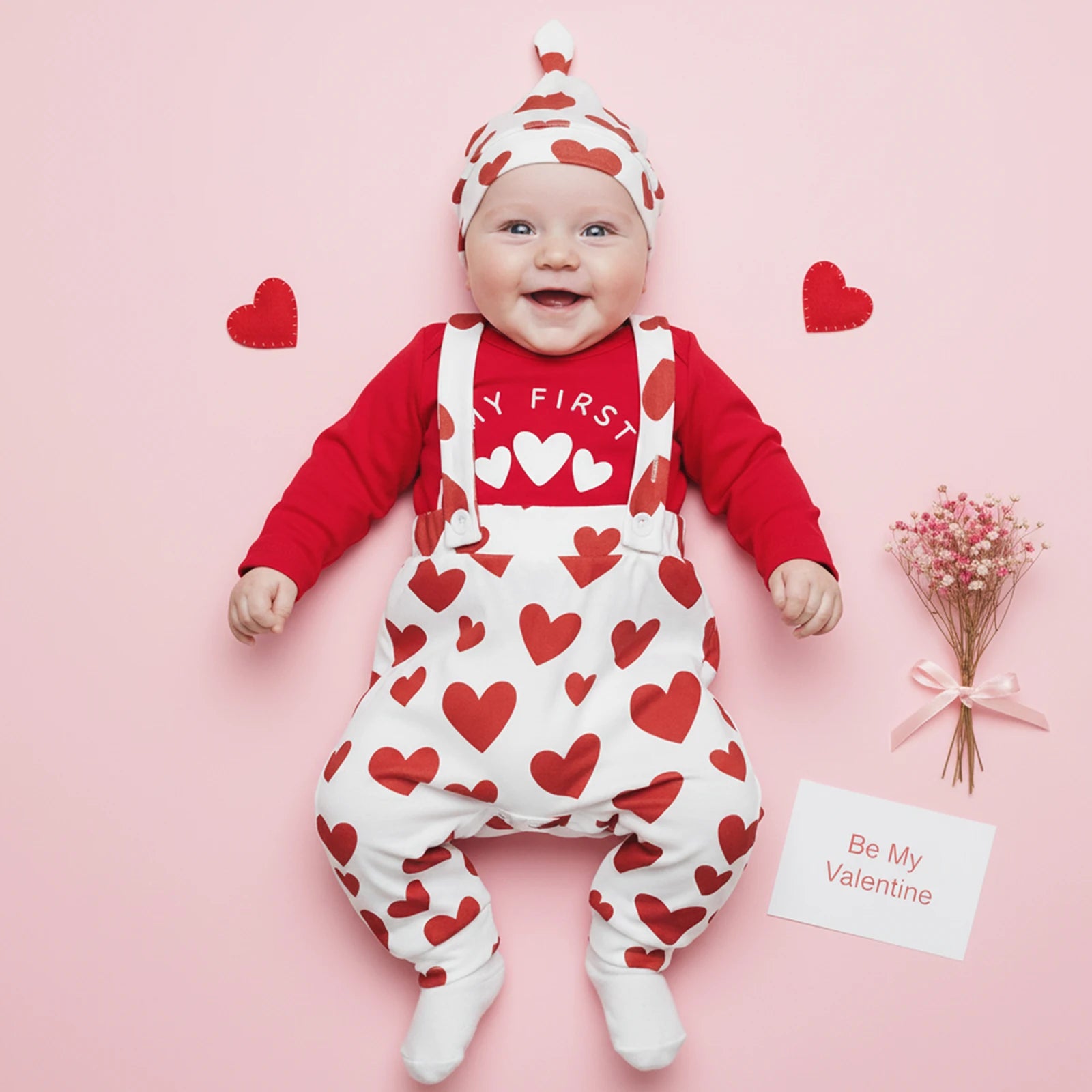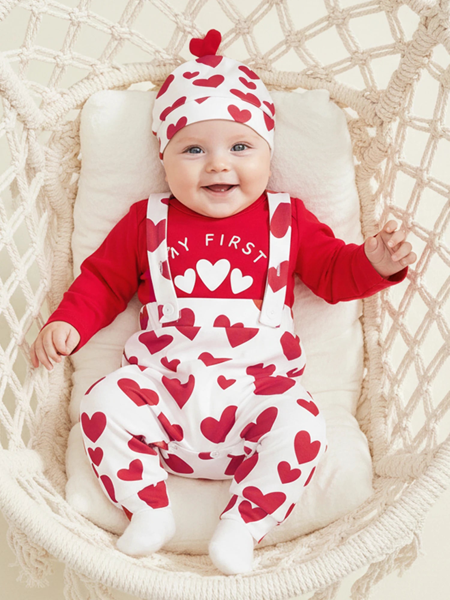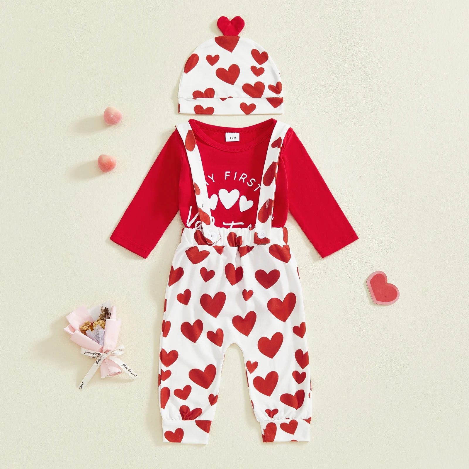 Celebrate love and style with this charming Valentine's Day outfit set for baby boys. This complete ensemble features a heart letter print long sleeve romper, coordinating suspender pants, and a matching hat—everything you need for a picture-perfect Valentine's celebration.