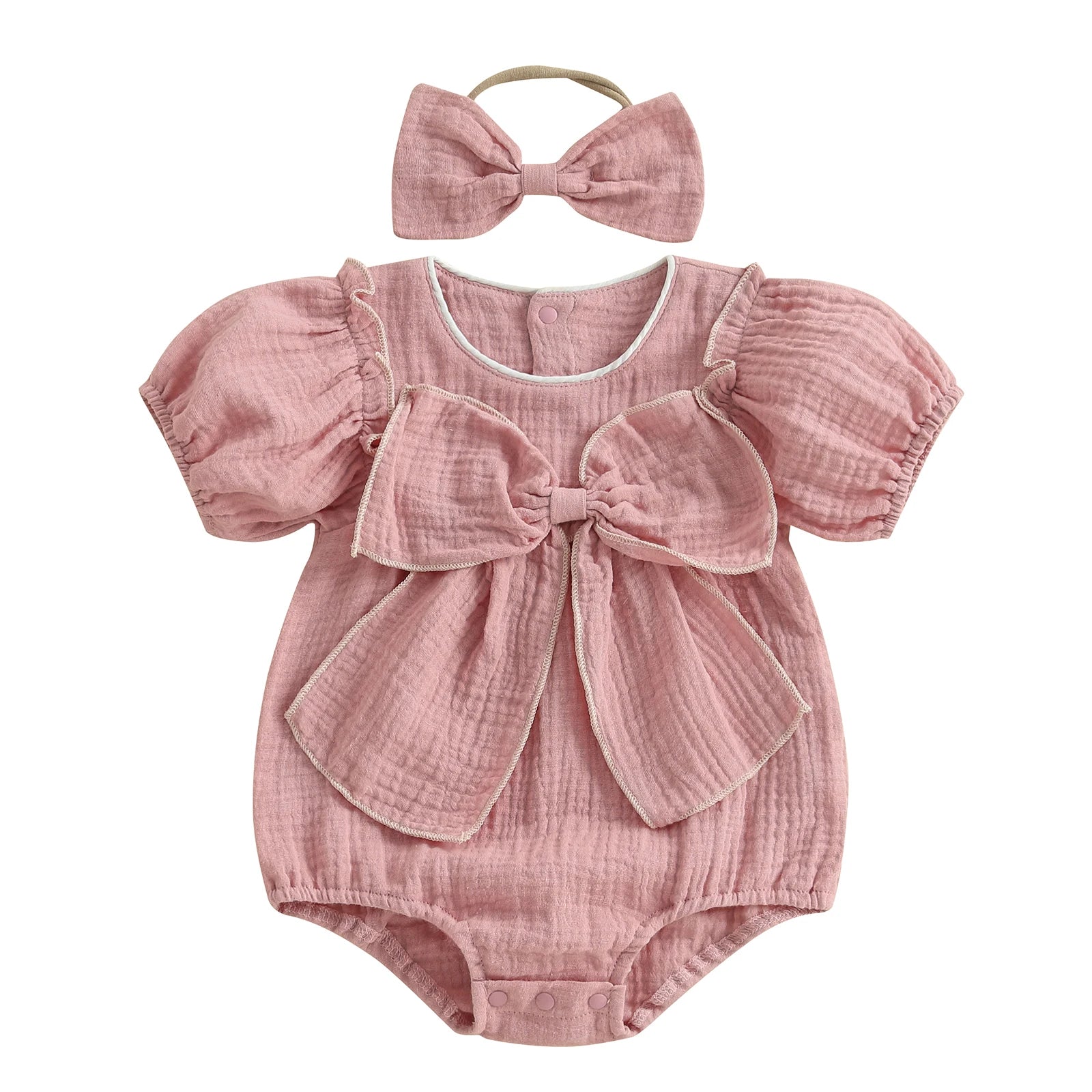 Baby Girls Bow Bubble Romper with Headband - Short Sleeve Ruffled Jumpsuit