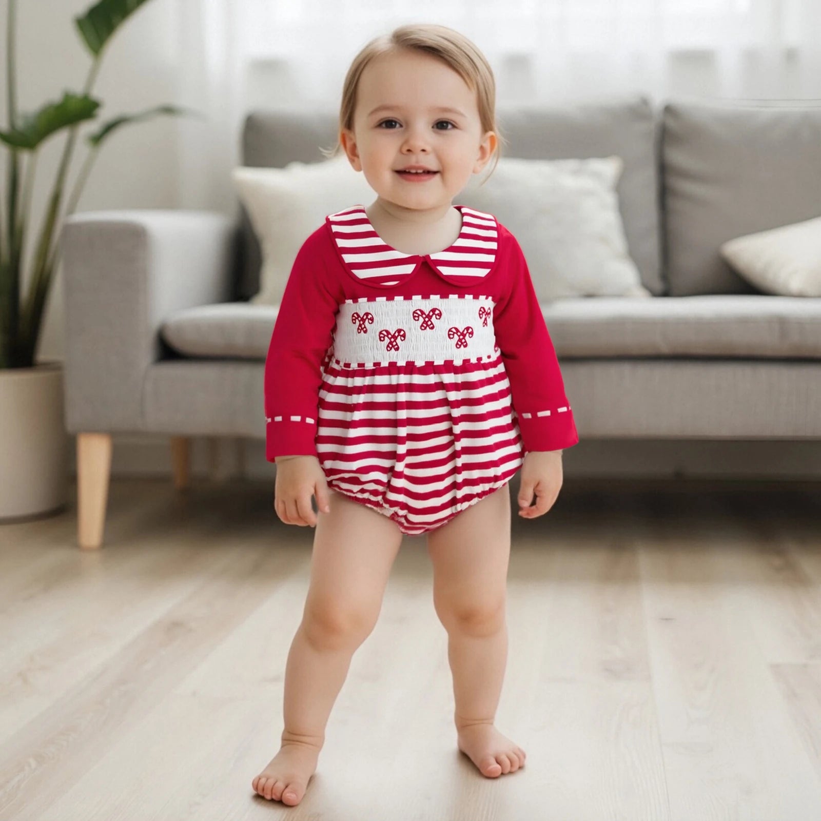 Celebrate the festive season with this adorable Christmas romper featuring charming candy cane embroidery and classic striped design. The elegant smocked detailing and long sleeves make this jumpsuit perfect for holiday celebrations and cozy winter days.