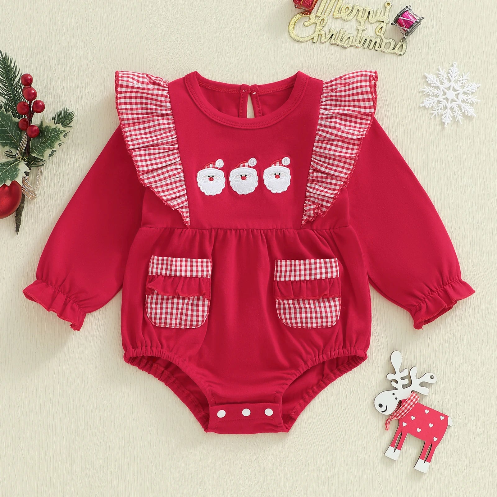 Baby Christmas Romper - Santa Plaid Ruffle Trim Long Sleeve Bodysuit with Pockets (0-18M)