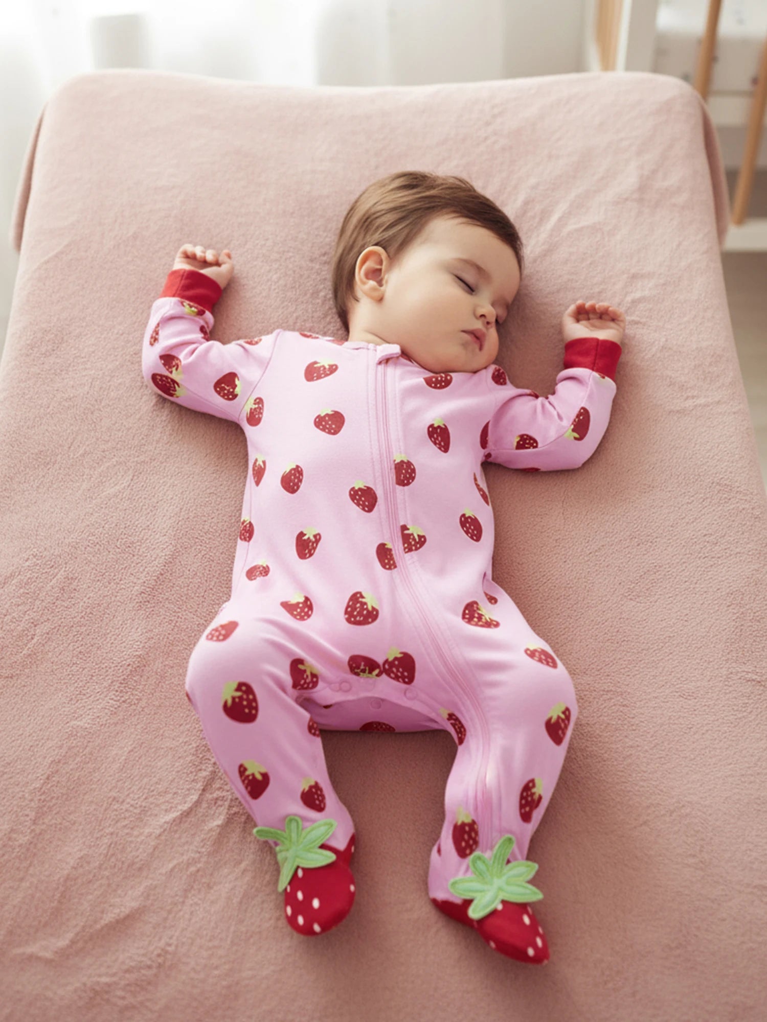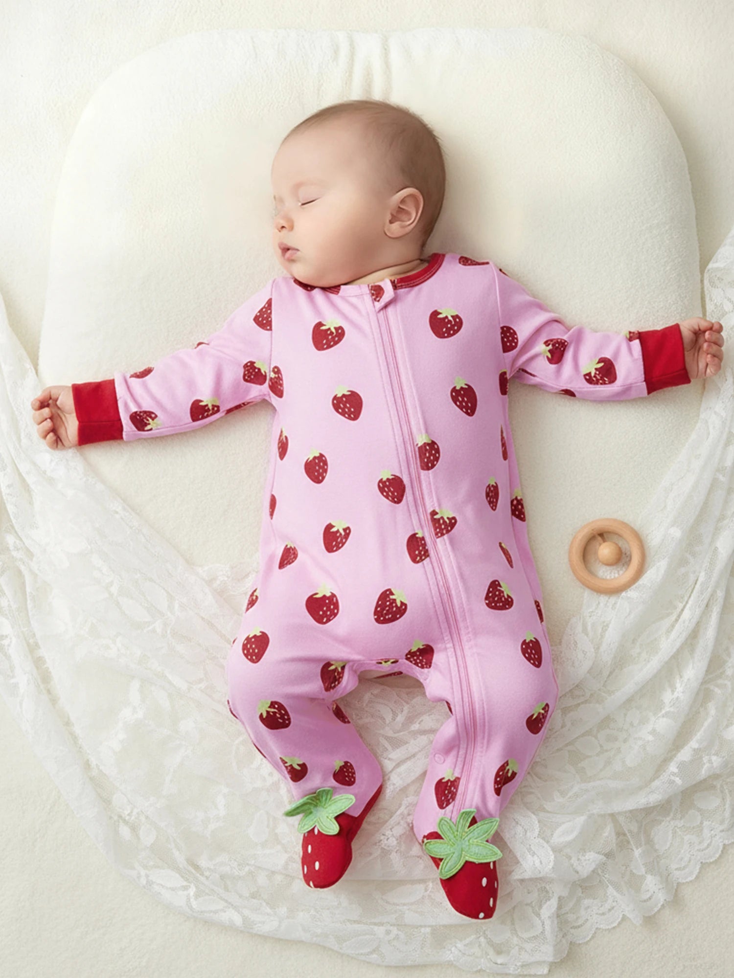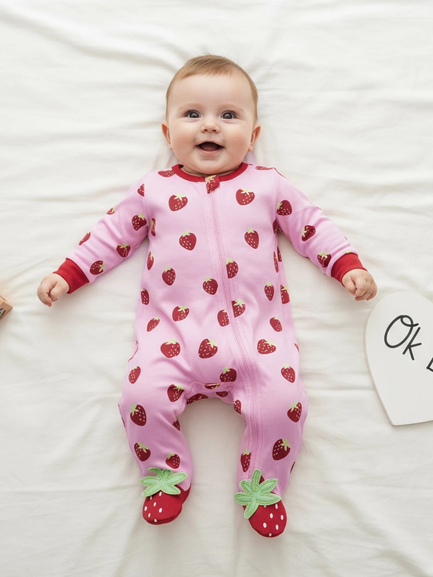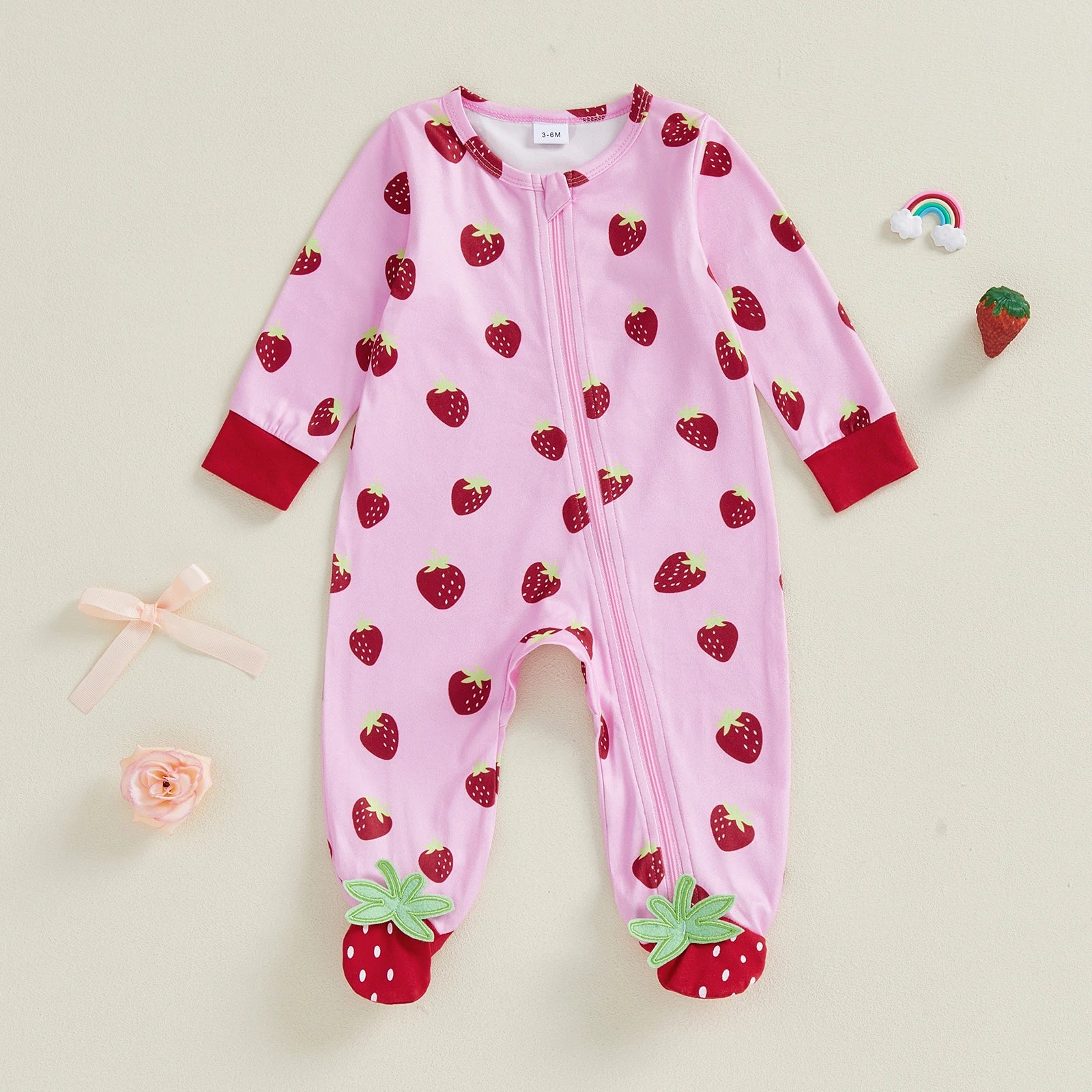 Baby Girls Boys Strawberry Print Romper - Long Sleeve Footed Jumpsuit 0-18M