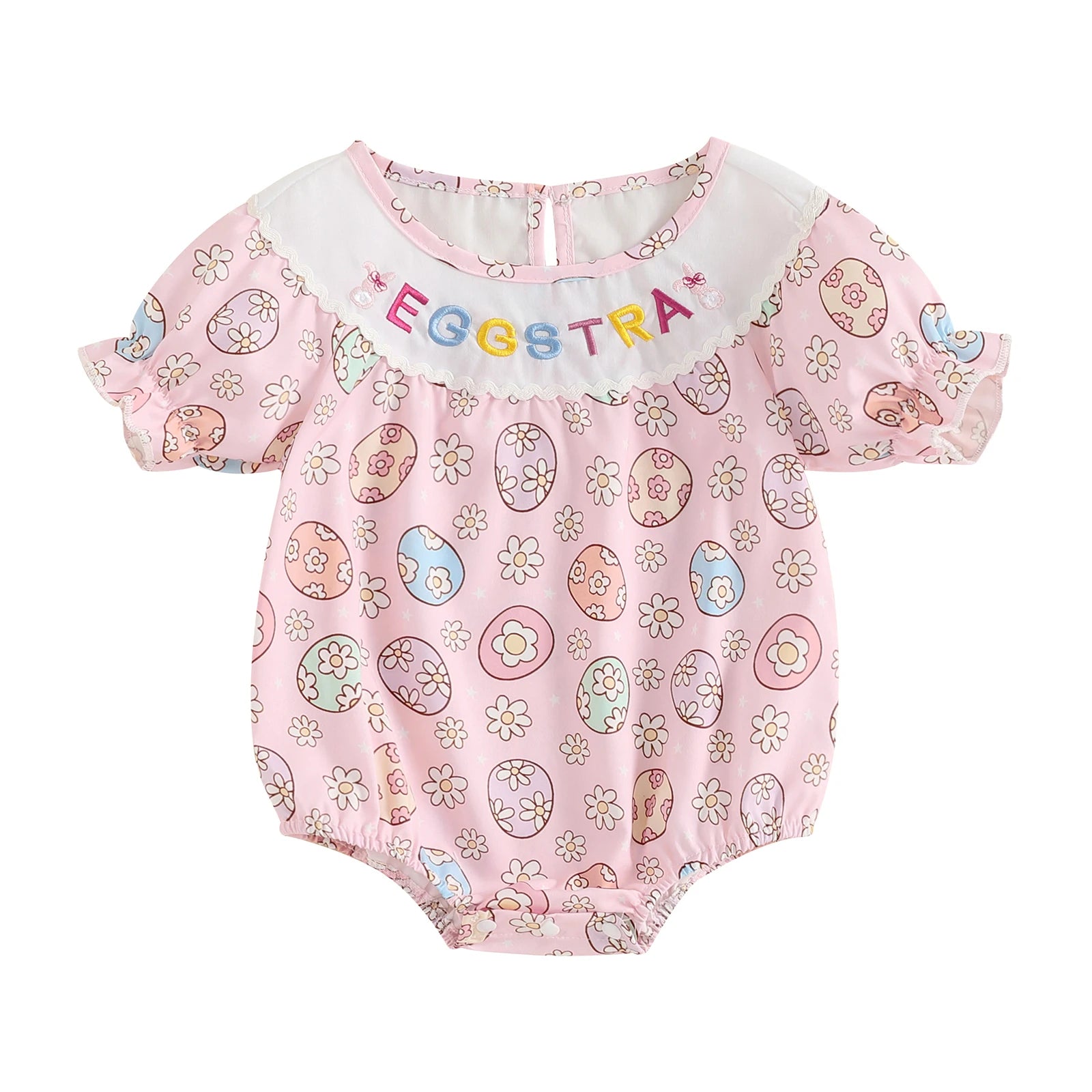 Celebrate Easter in style with this charming baby romper featuring delightful rabbit, egg, and carrot prints. Perfect for your little bunny's first Easter celebrations!