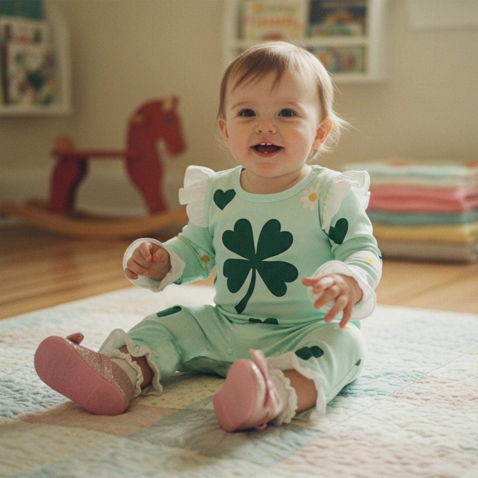 Celebrate Irish charm with this delightful shamrock print romper for your little one. The comfortable long sleeve design with round neck and full length coverage keeps baby cozy and festive, perfect for St. Patrick's Day celebrations and everyday wear.