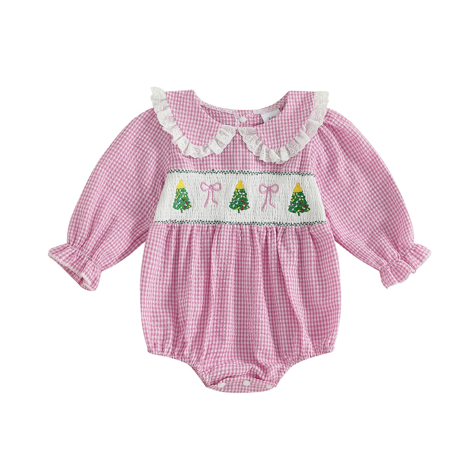 Baby Plaid Print Romper - Long Sleeve Bow Embroidery Doll Collar Jumpsuit