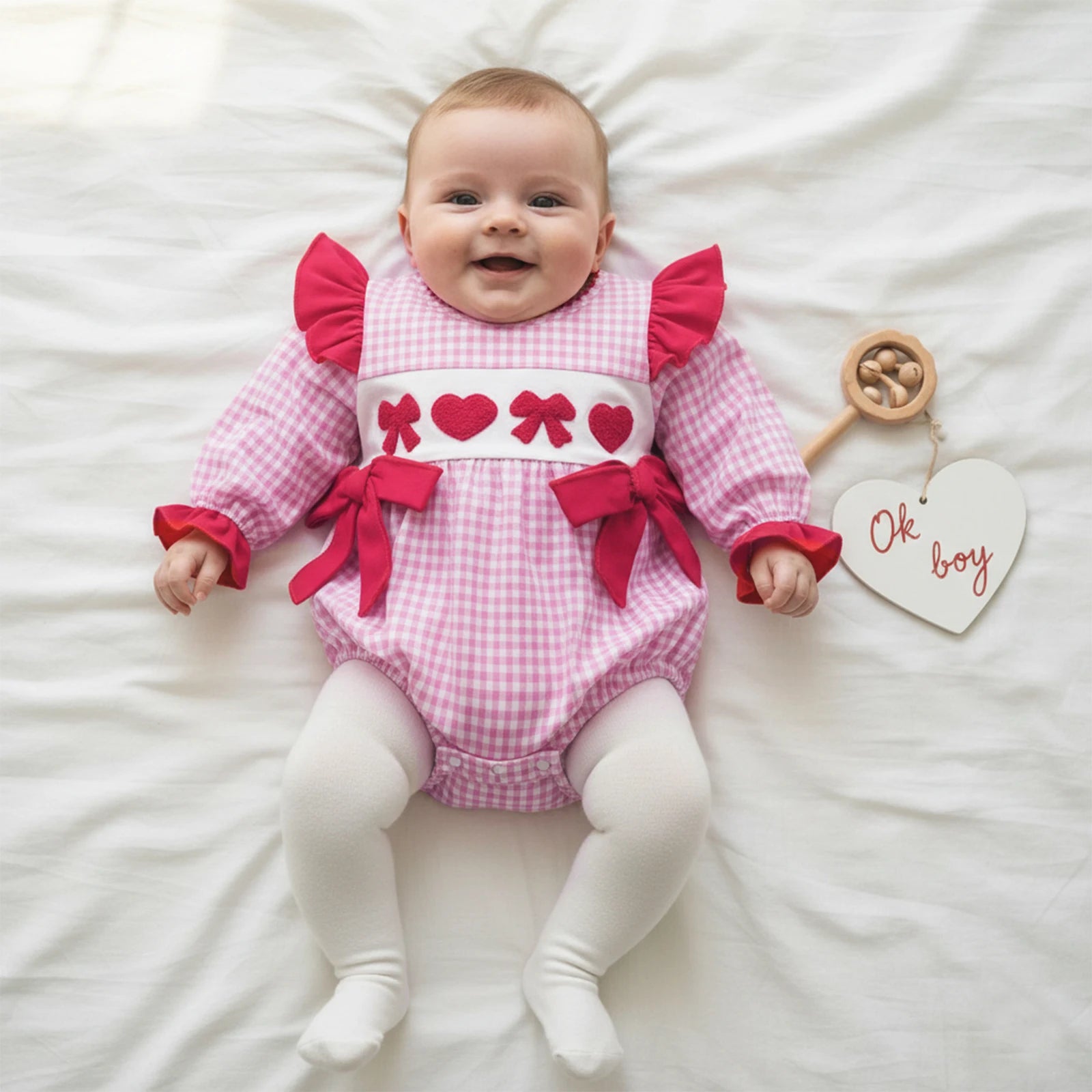 Baby Girls Boys Valentine's Day Plaid Print Bow Heart Embroidered Long Sleeve Romper