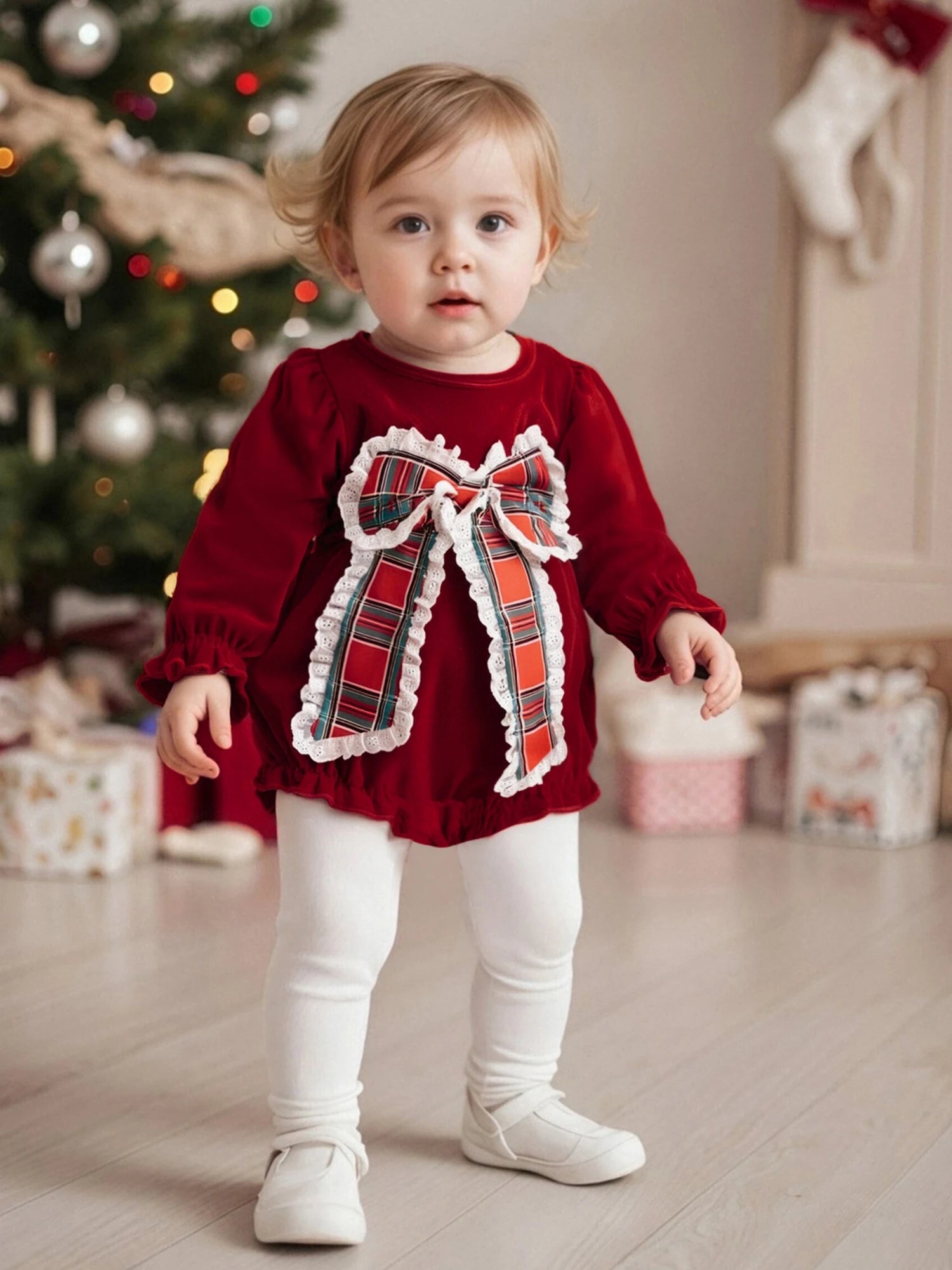 Lovely Baby Velvet Christmas Romper with Plaid Bow (0-18M)
