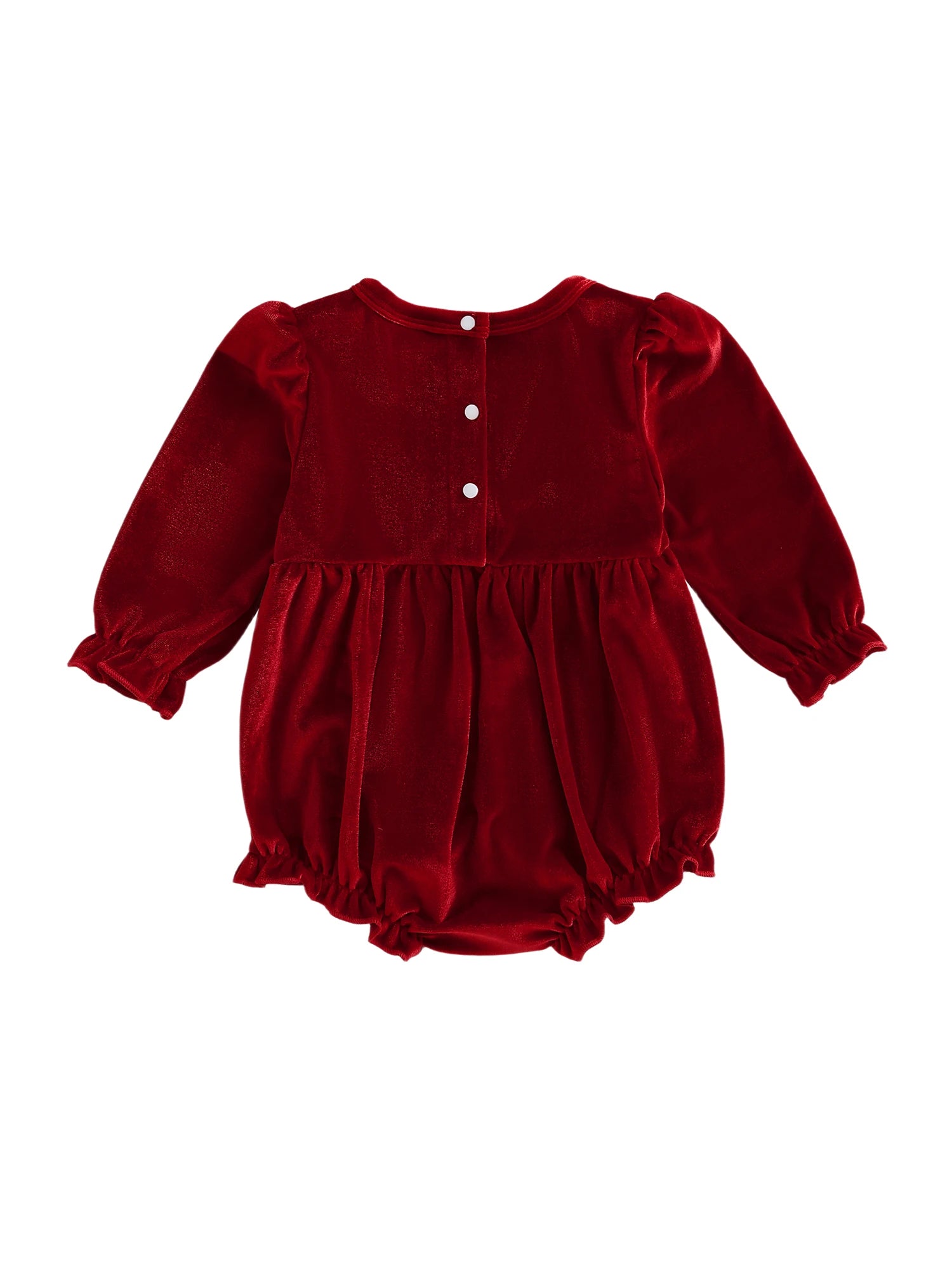 Dress your little one in festive elegance with this gorgeous velvet Christmas romper. Featuring a charming plaid bow decoration and a comfortable loose-fit bubble design, this long-sleeve infant jumpsuit is perfect for holiday celebrations, family photos, and special winter occasions.