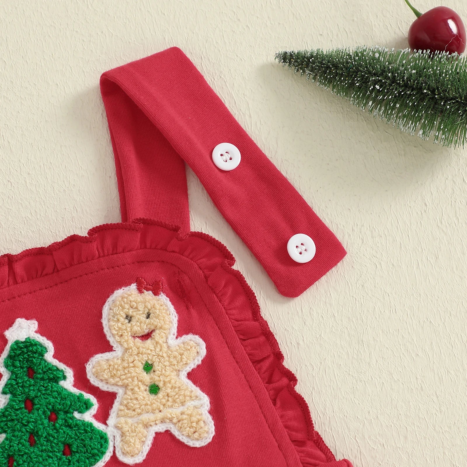 Celebrate the holiday season with this adorable Christmas overall romper for baby girls. Featuring charming tree embroidery and trendy bell bottom legs, this sleeveless jumpsuit is perfect for babies aged 0-18 months during autumn and winter festivities.