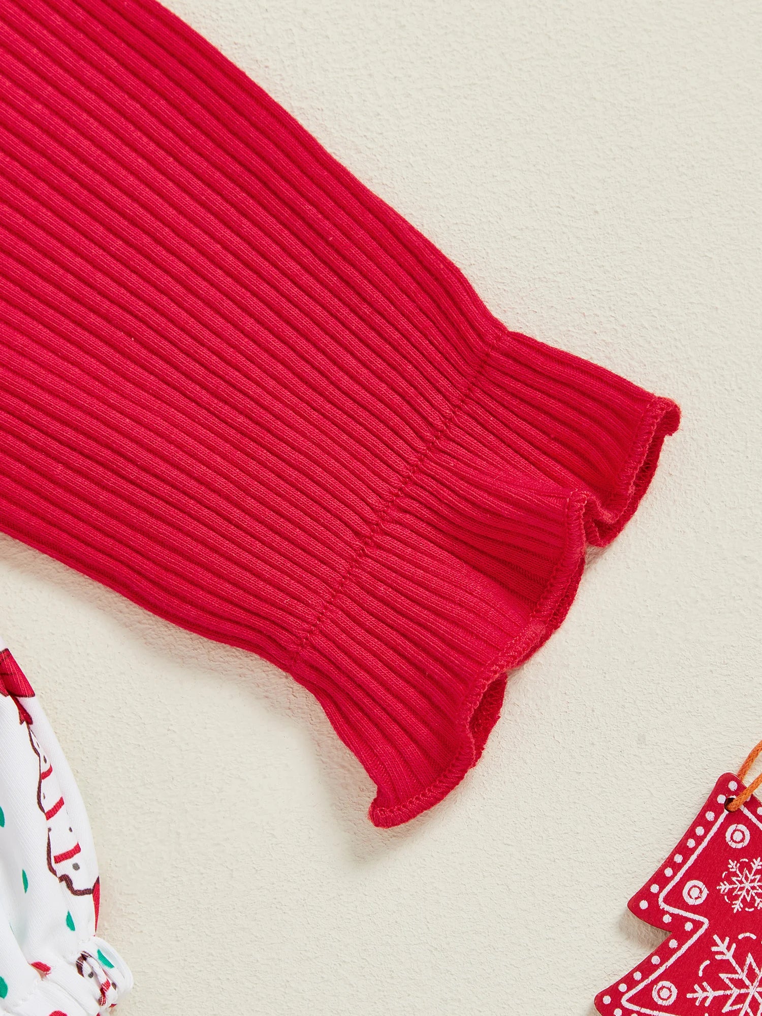 Celebrate baby's first Christmas in adorable style with this complete three-piece set. Featuring a charming long sleeve ruffle jumpsuit with festive Santa tree and bow print, plus matching bow headband and cozy socks, this outfit is perfect for holiday celebrations and memorable photos.